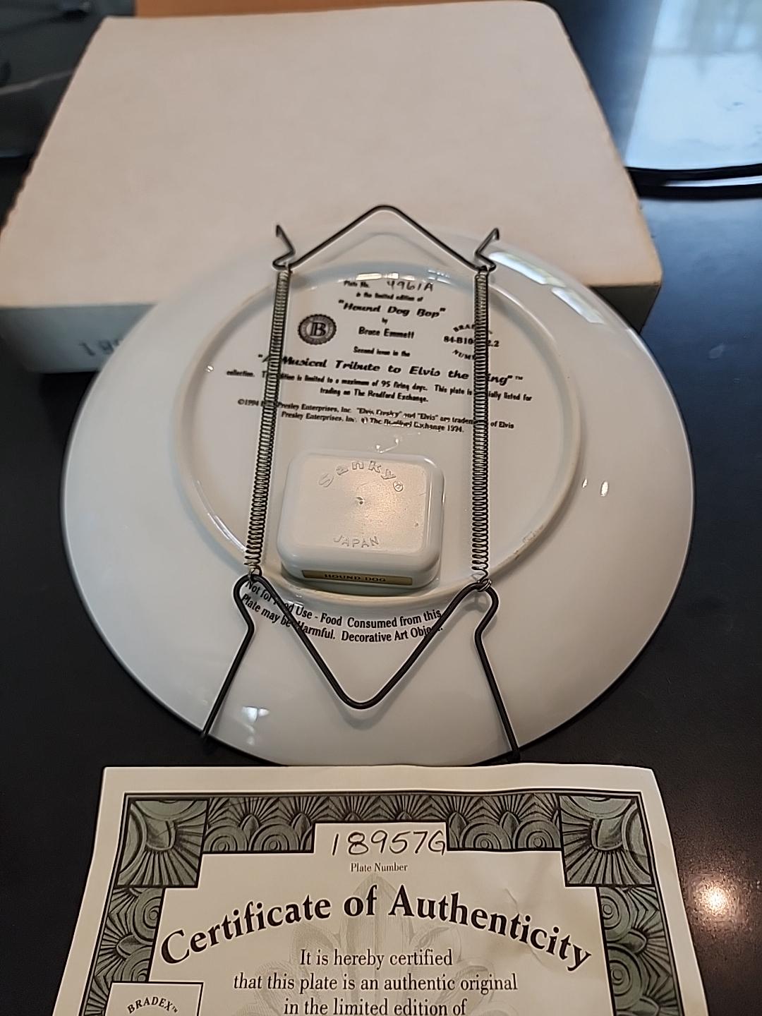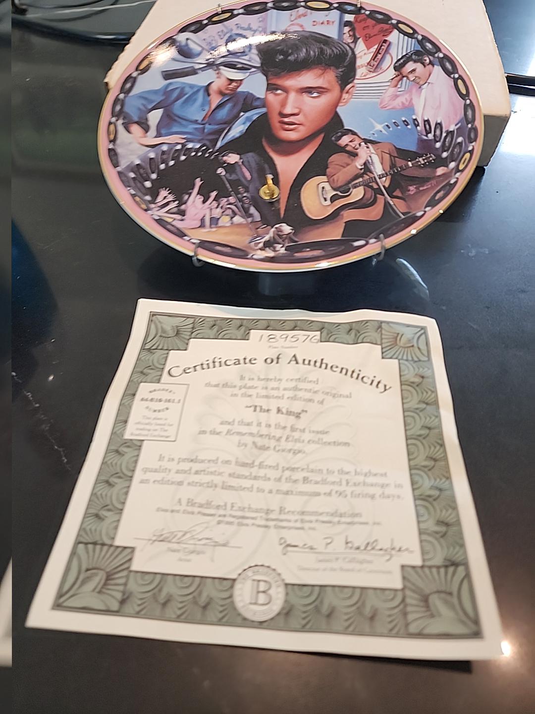 Own a piece of music and memorabilia history with this Bradford Exchange Elvis Presley “The King” music plate. This collectible plate not only celebrates the legendary Elvis but also plays music, combining artistry with melody. Complete with its original Certificate of Authenticity, it’s a must-have for collectors and fans alike.