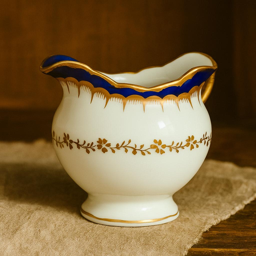 This Coalport creamer features a broad cobalt blue band accented with gold trim and delicate gold floral detailing. The elegant neoclassical swag and garland design is richly highlighted with cobalt blue and gold, while the handle is finished with fine gold gilding.