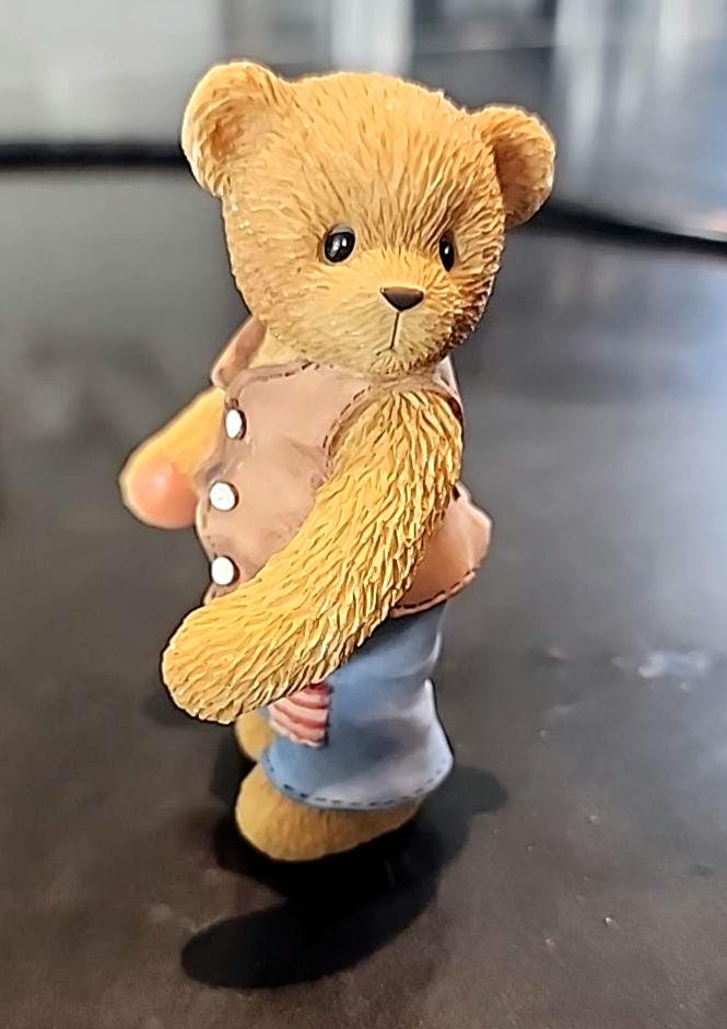 This adorable bear is dressed casually in jeans and a brown vest, capturing the classic, playful spirit of the Enesco Cherished Teddies collection. Perfect for display, gifting, or adding to a treasured teddy bear collection.