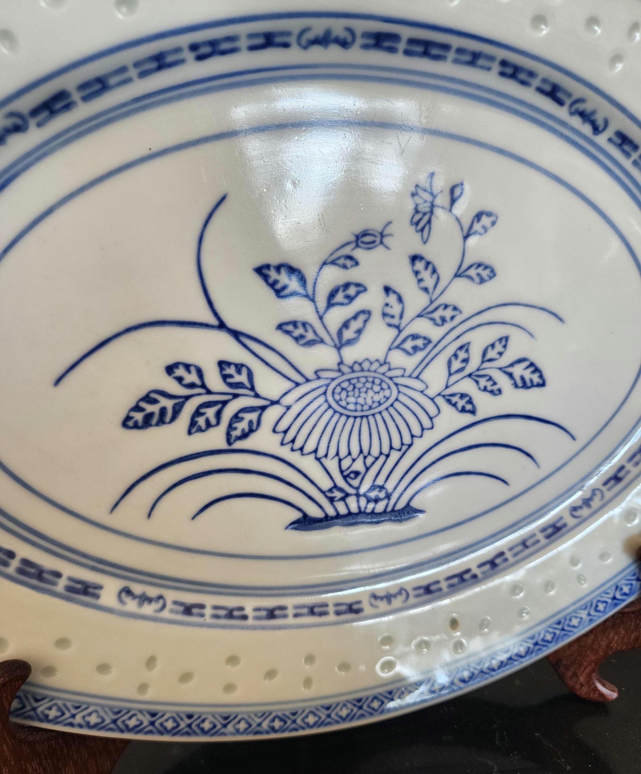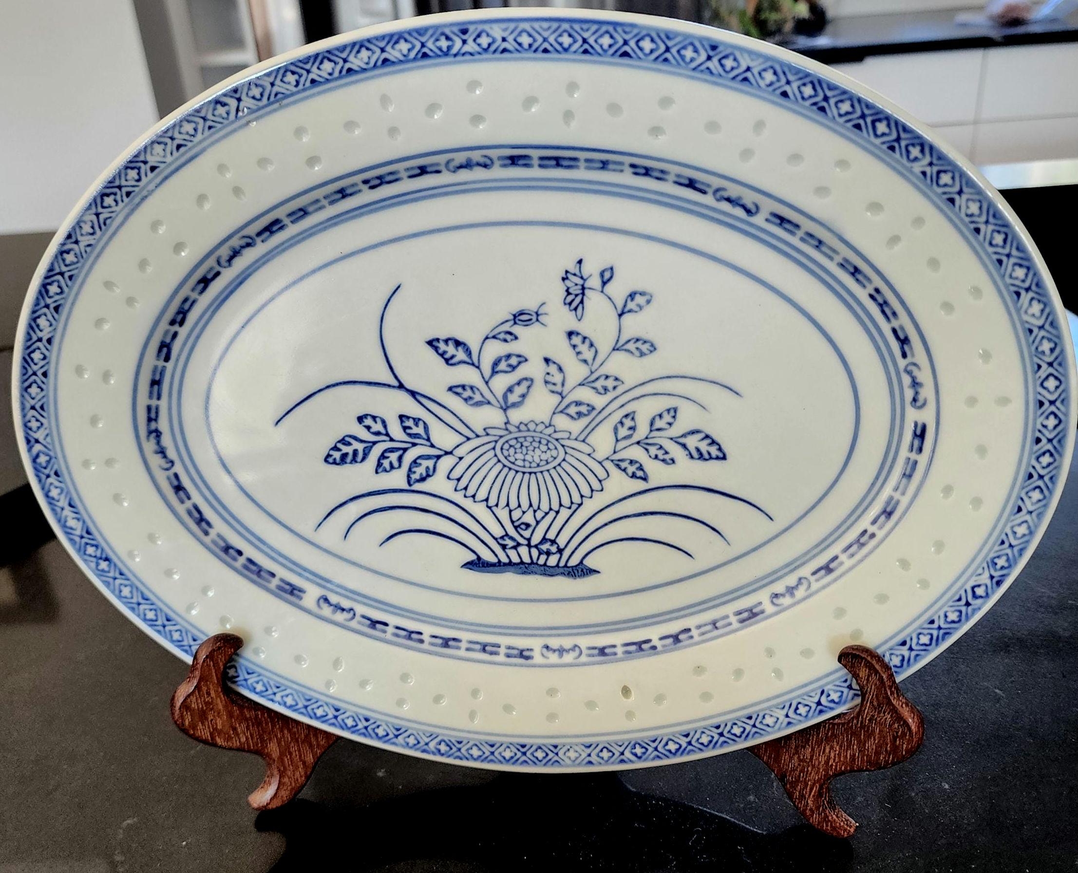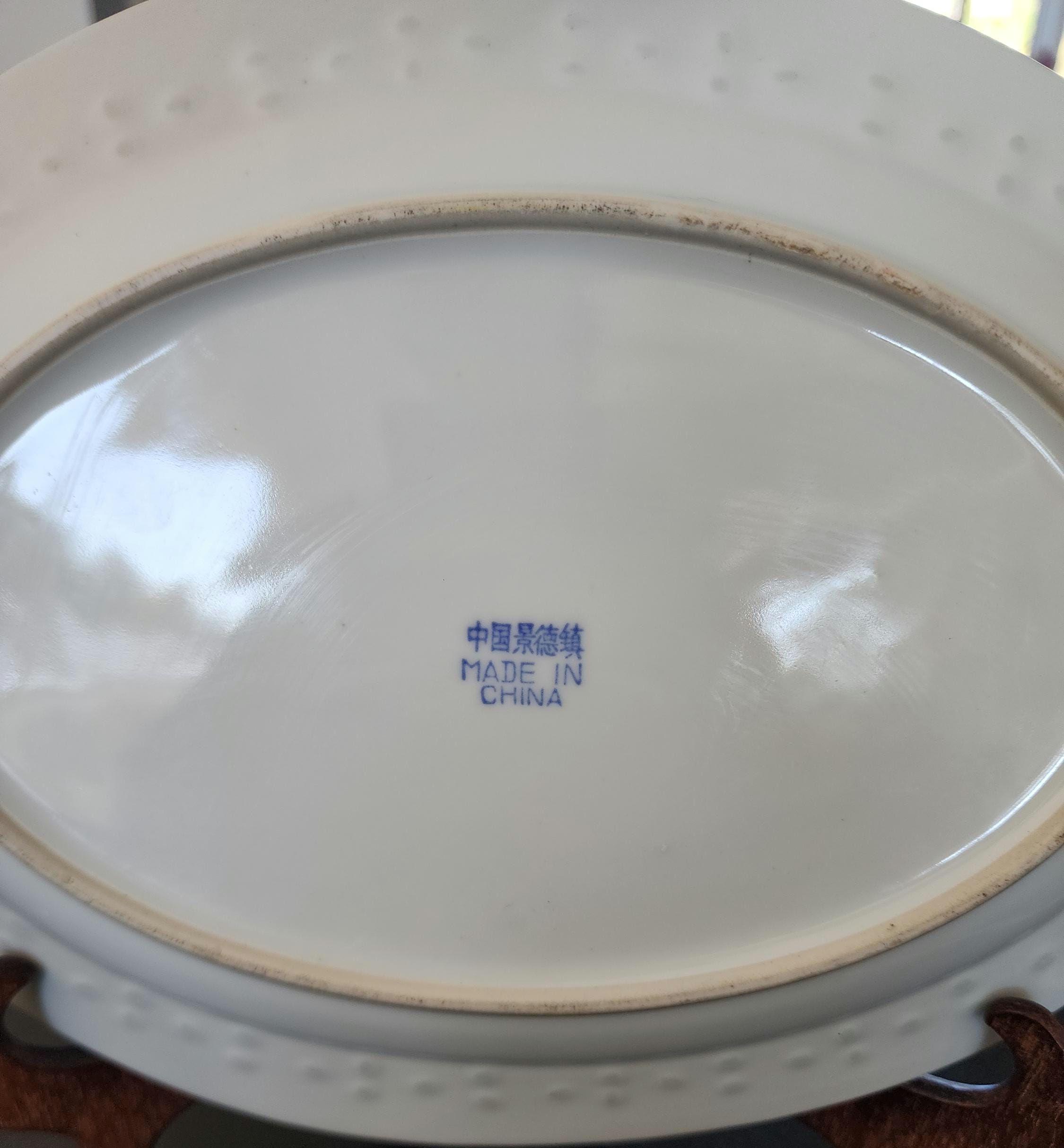 This stunning vintage porcelain platter features a classic blue-and-white floral motif with a decorative border and subtle raised dot detailing around the rim. Made in Jingdezhen, China, a region world-renowned for its fine porcelain craftsmanship, this piece dates from the 1950s–1970s.