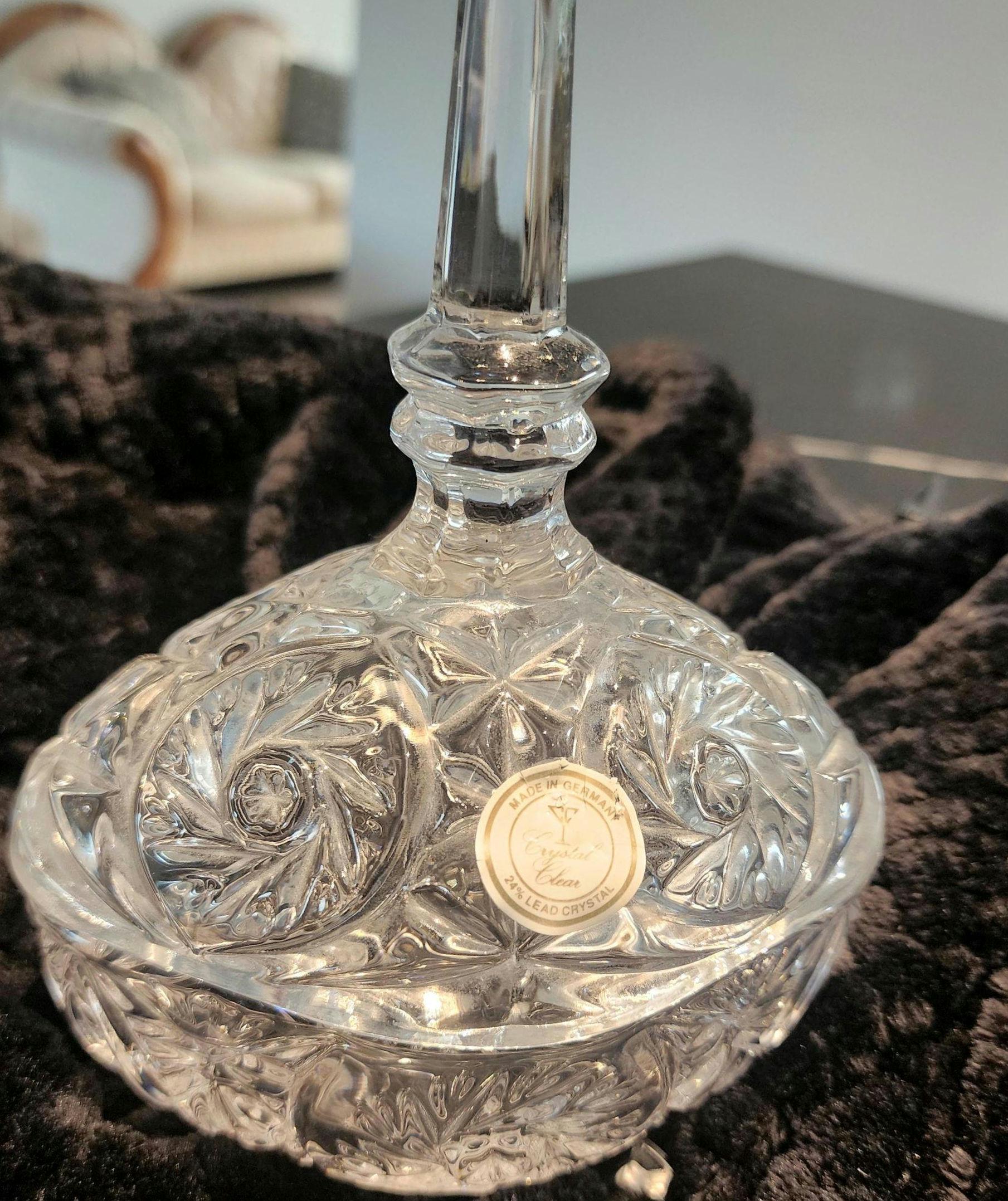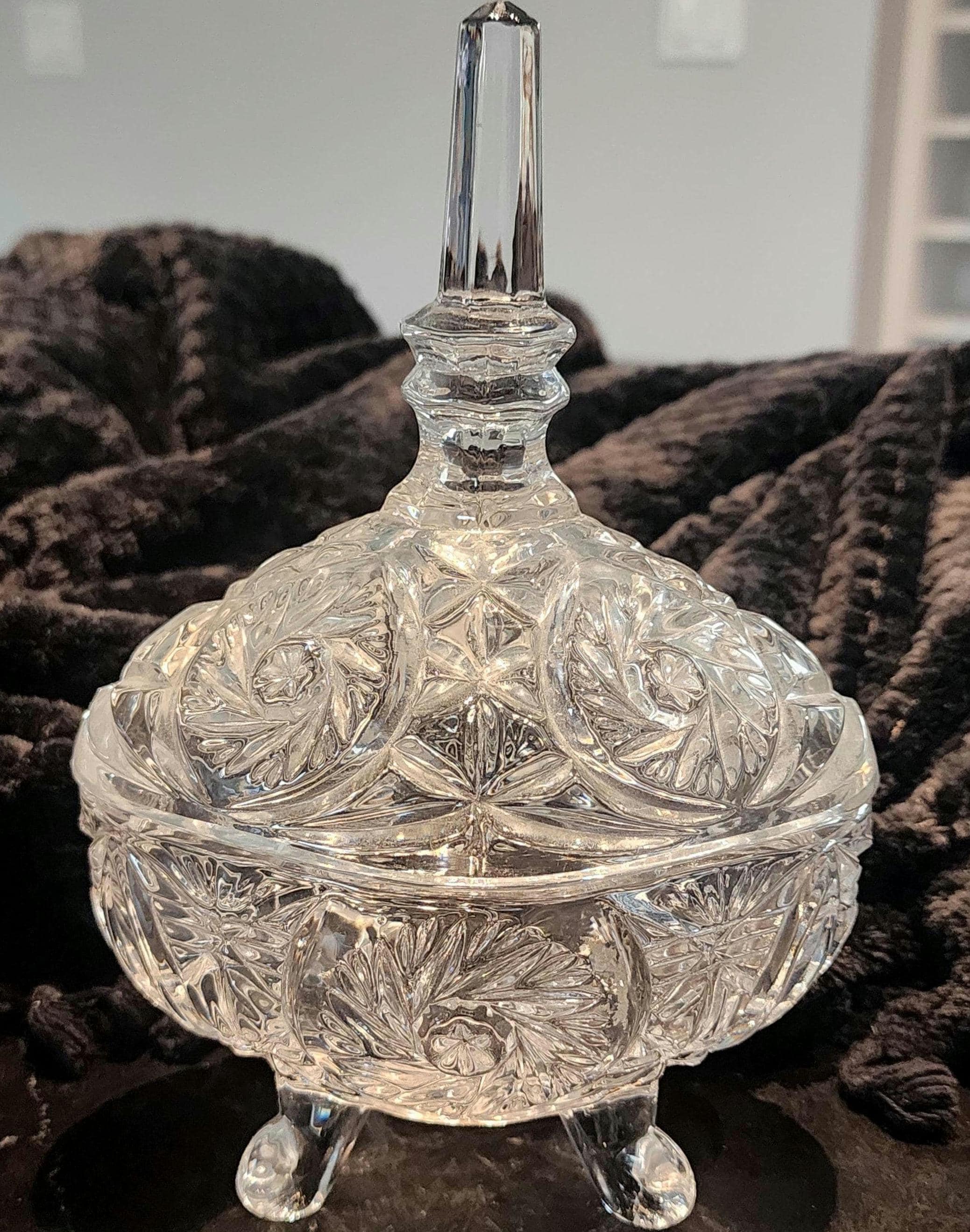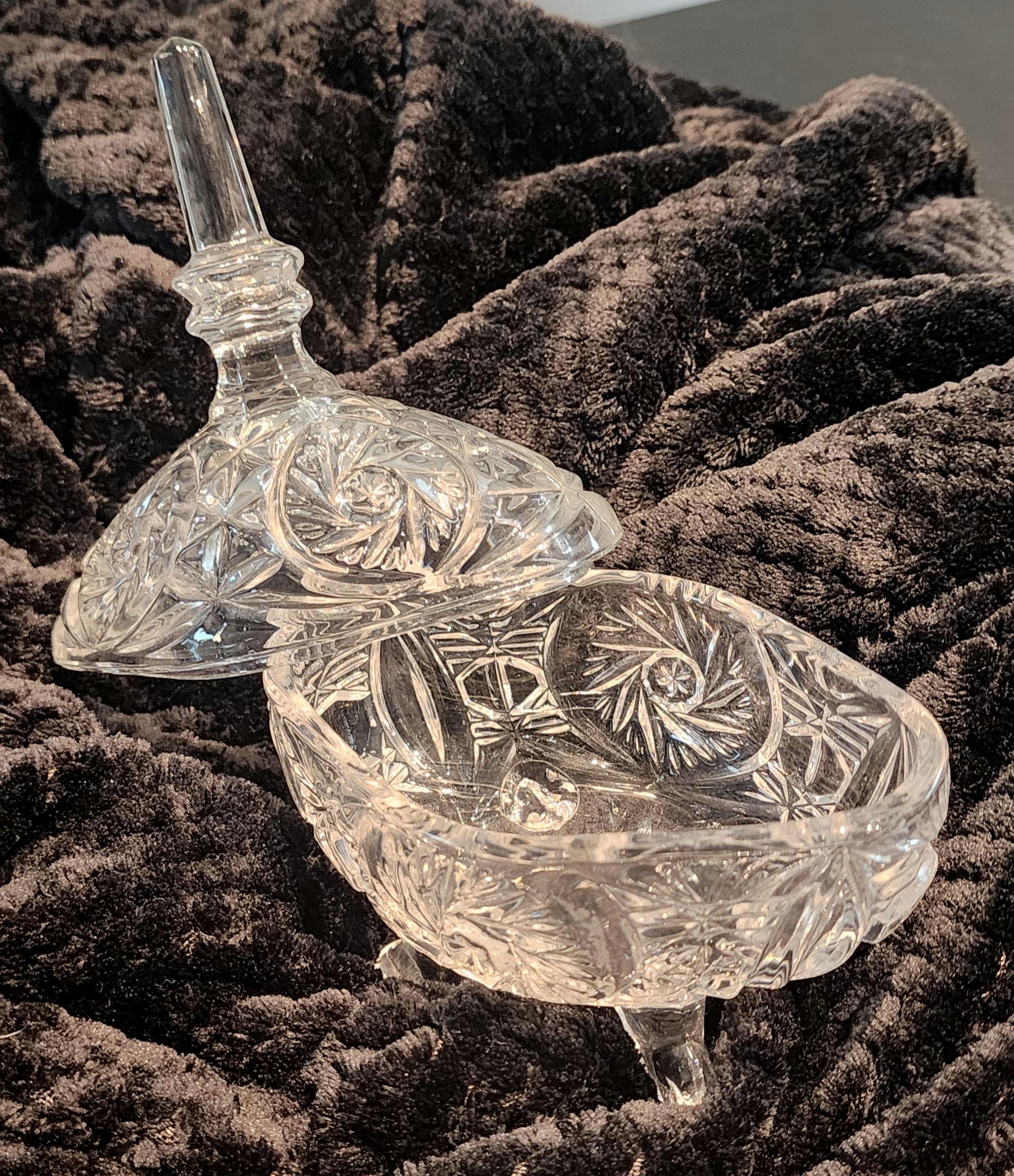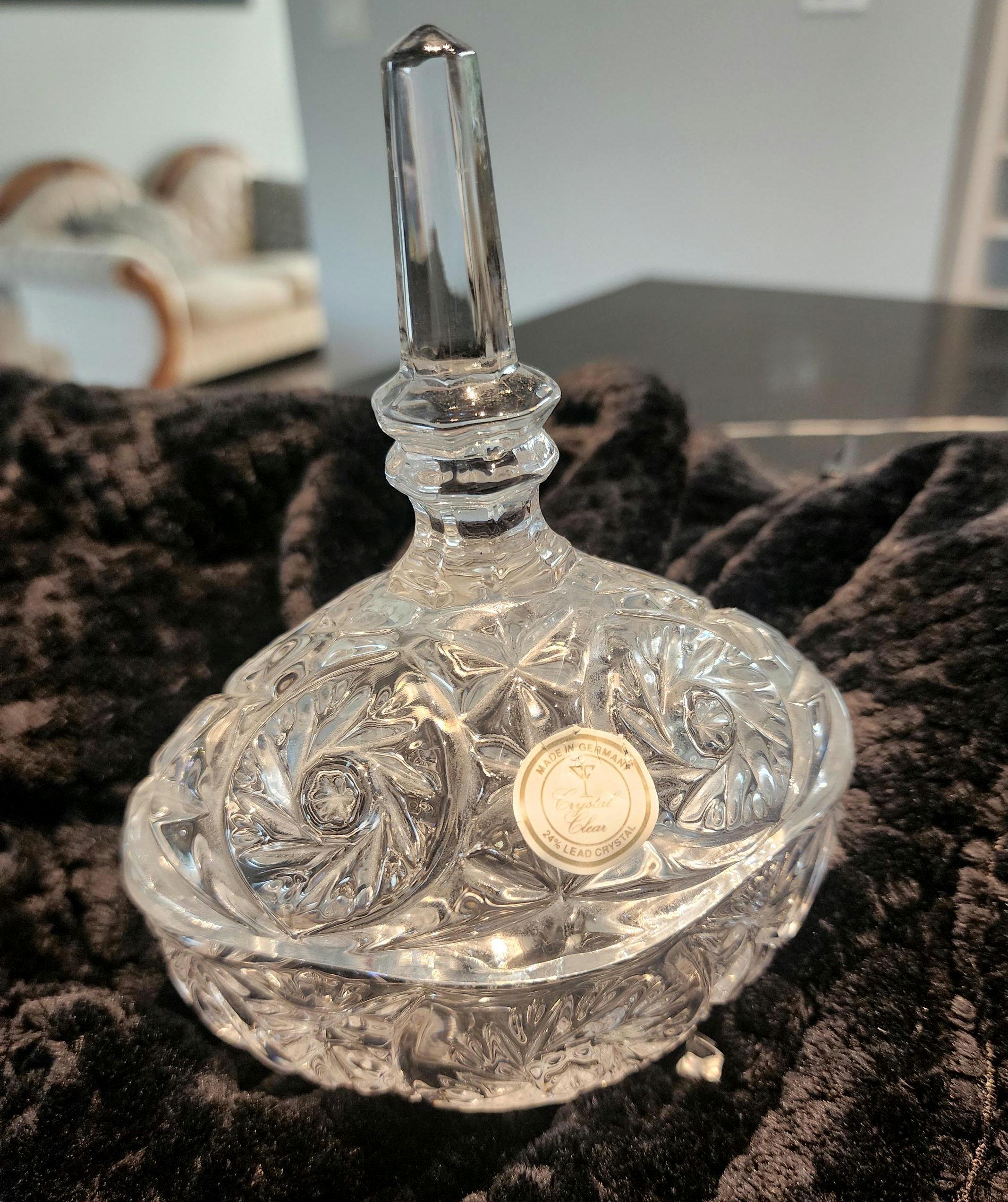 Elegant vintage German crystal candy dish with lid, crafted from 24% lead crystal for exceptional clarity and brilliance. This footed covered bowl features a striking starburst and pinwheel cut pattern, topped with a faceted finial handle. Resting on three sturdy crystal feet, it makes a beautiful centerpiece for serving candy, nuts, or trinkets, or as a sparkling accent for your table or display cabinet.
