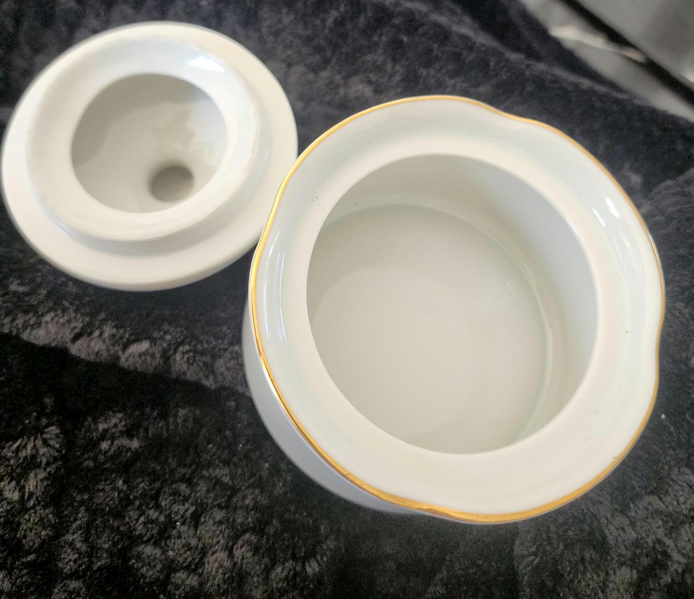 Vintage J.L. Menau White Porcelain Sugar Bowl with Lid – Scalloped Edge & Gold Trim