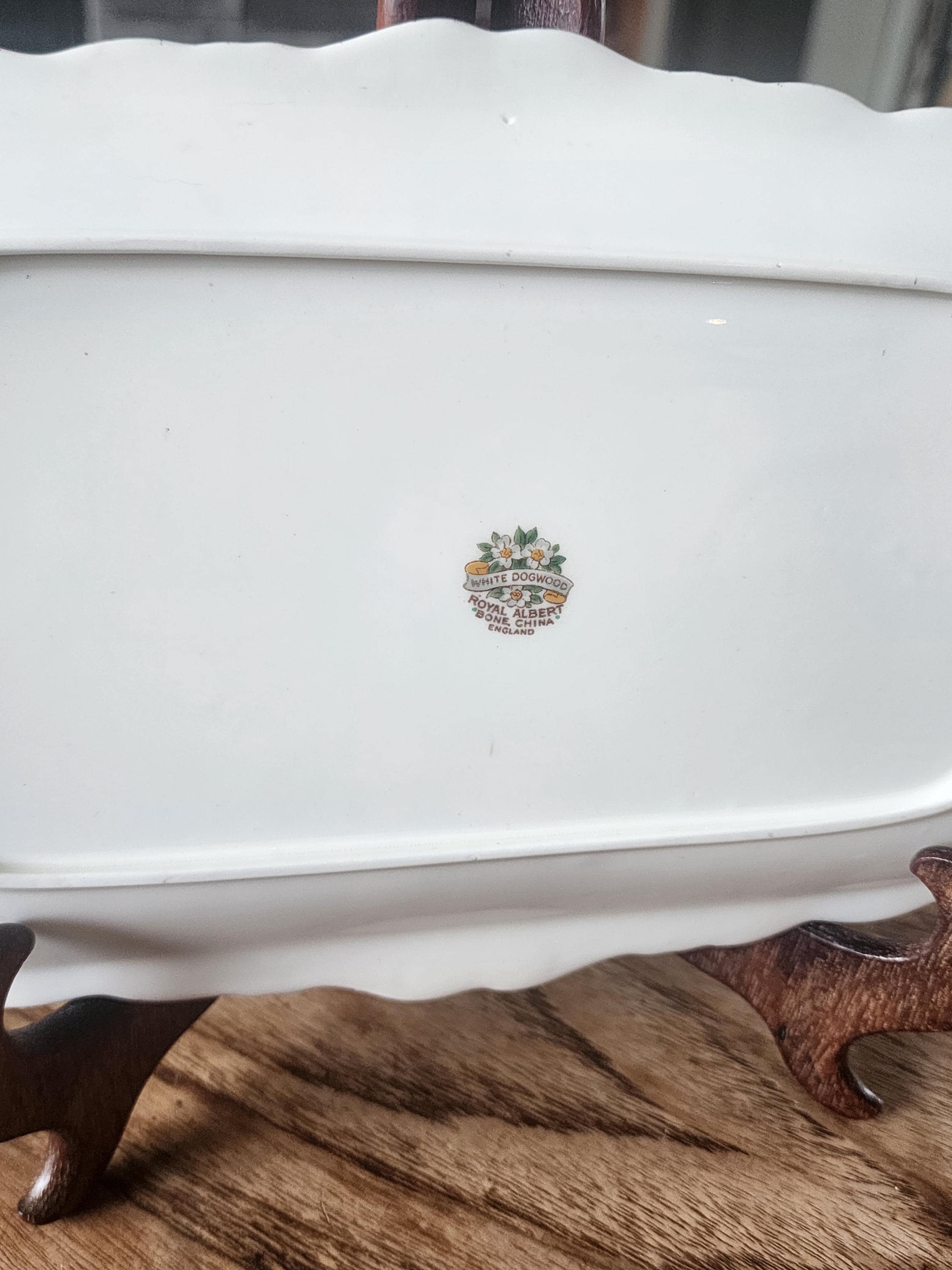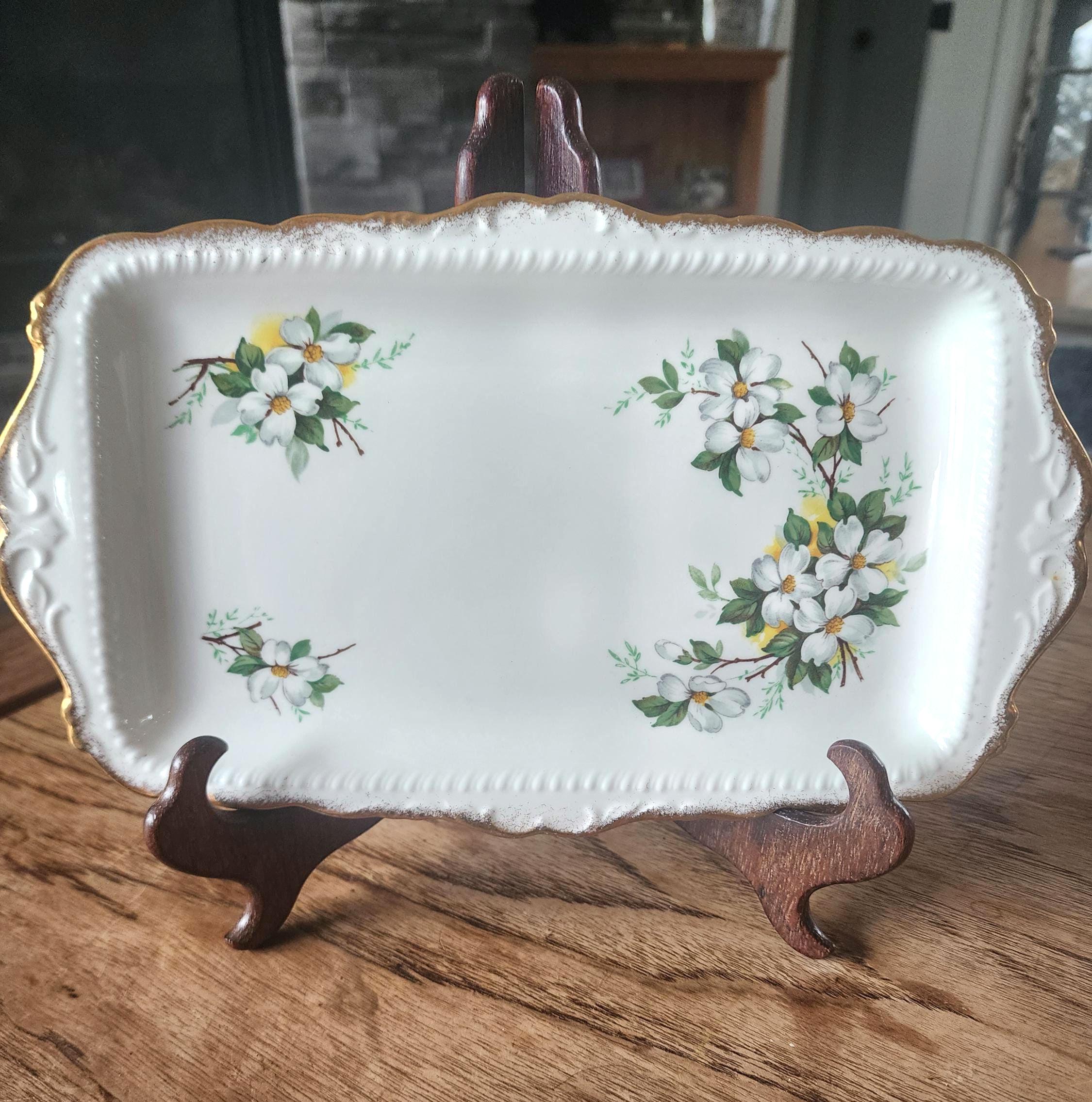 Royal Albert, the premier maker of Fine Bone China, introduced the elegant White Dogwood pattern in the 1940s. This listing is for a large sandwich plate, measuring approximately 11 1/2 inches.