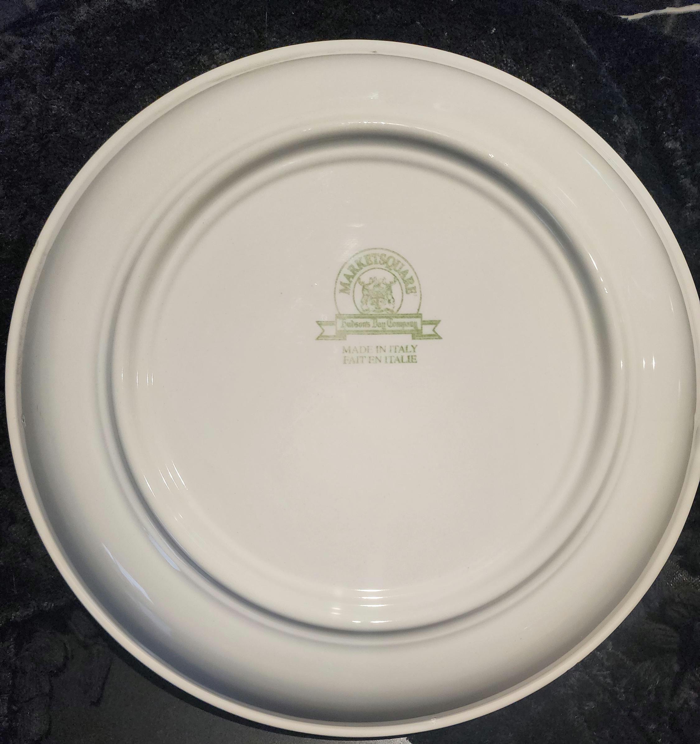 This vintage 1990s Hudson’s Bay Company Market Square plate was made in Italy and showcases the artistry of Italian ceramics. It features a hand-painted-style floral motif with a bold blue rim, making it both timeless and eye-catching.
