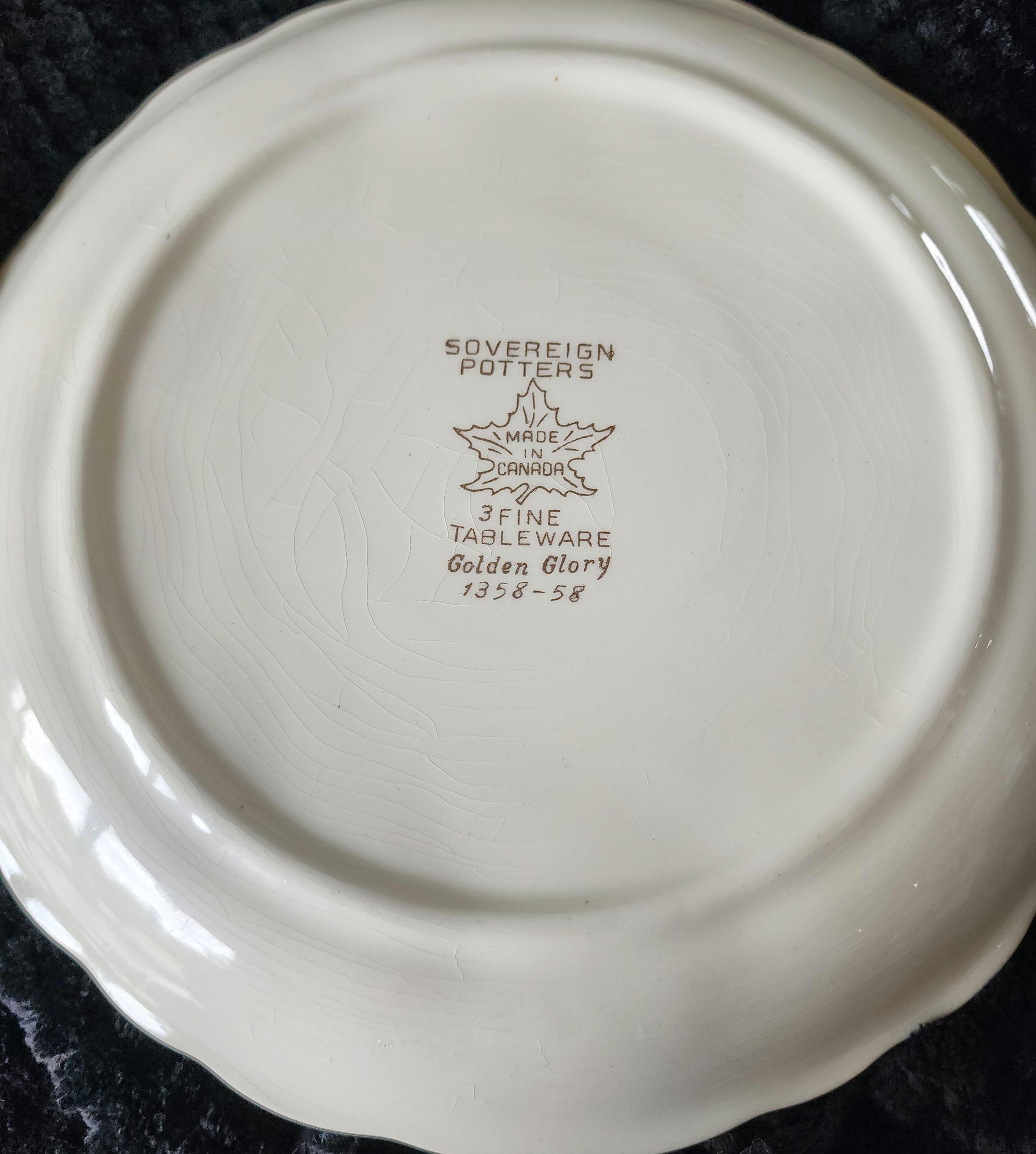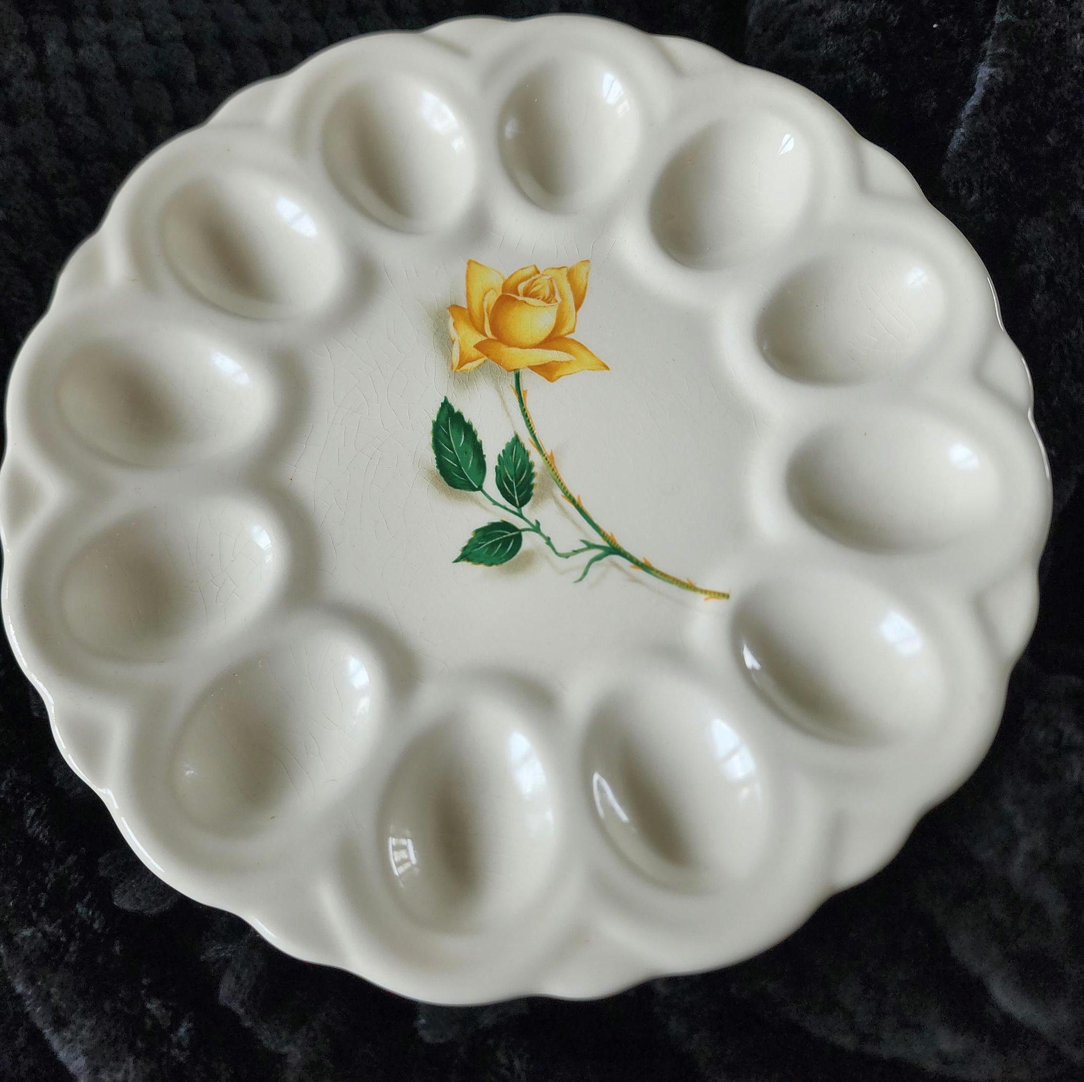 Vintage ceramic deviled egg platter, likely from Sovereign Potters Canada, featuring the charming "Golden Glory" pattern with a single long-stem yellow rose. Designed with individual depressions to hold deviled eggs perfectly, this mid-century collectible is ideal for your kitchen or display. Marked by Sovereign Potters in Hamilton, Ontario. Excellent vintage condition.