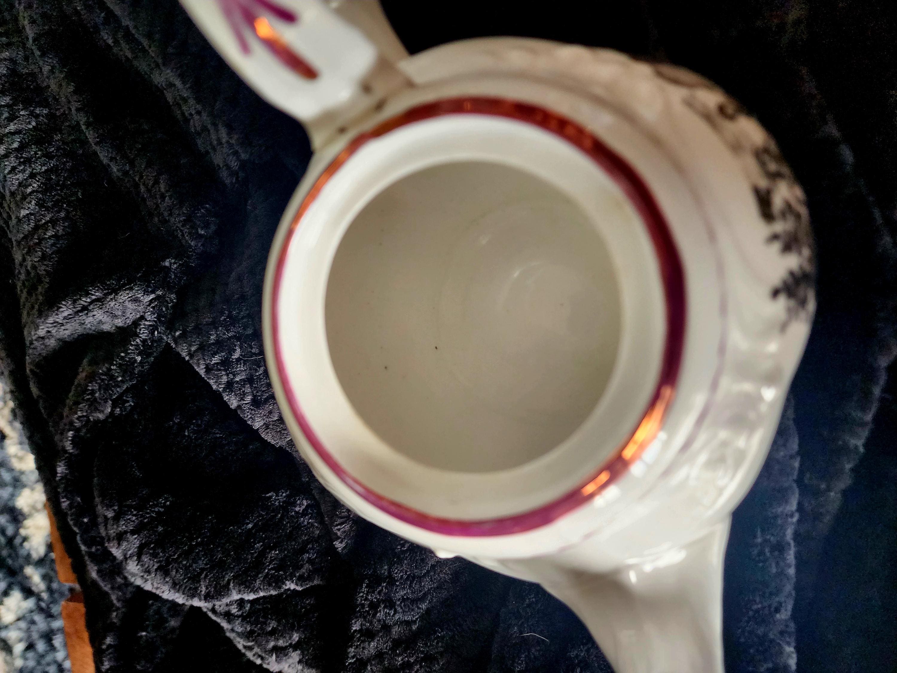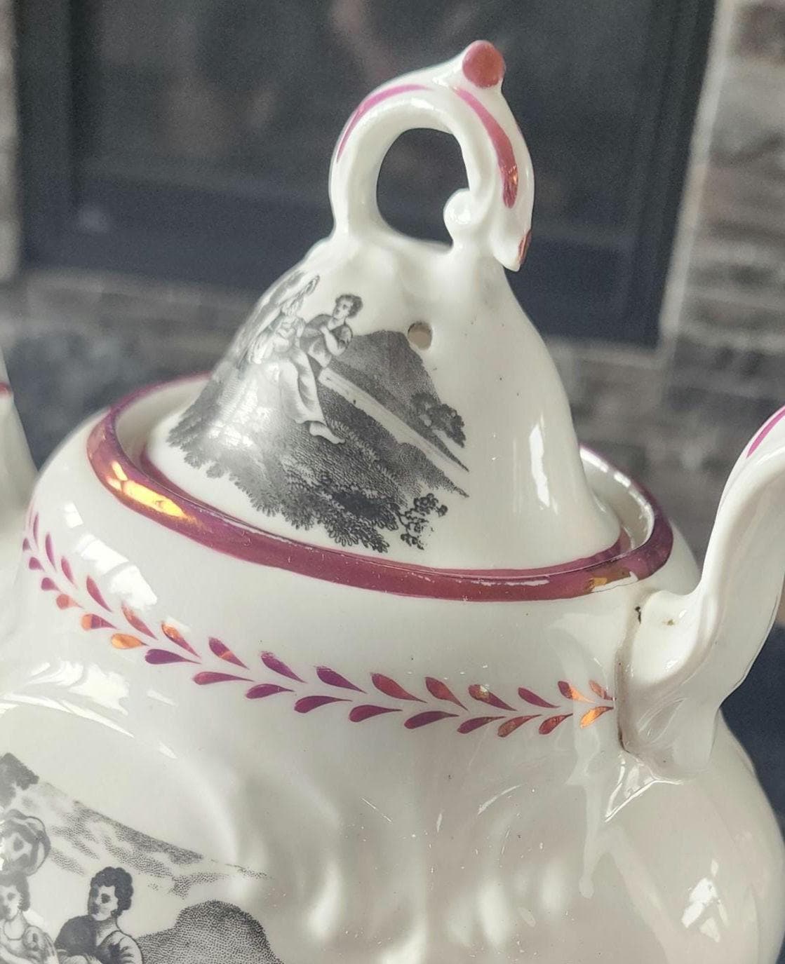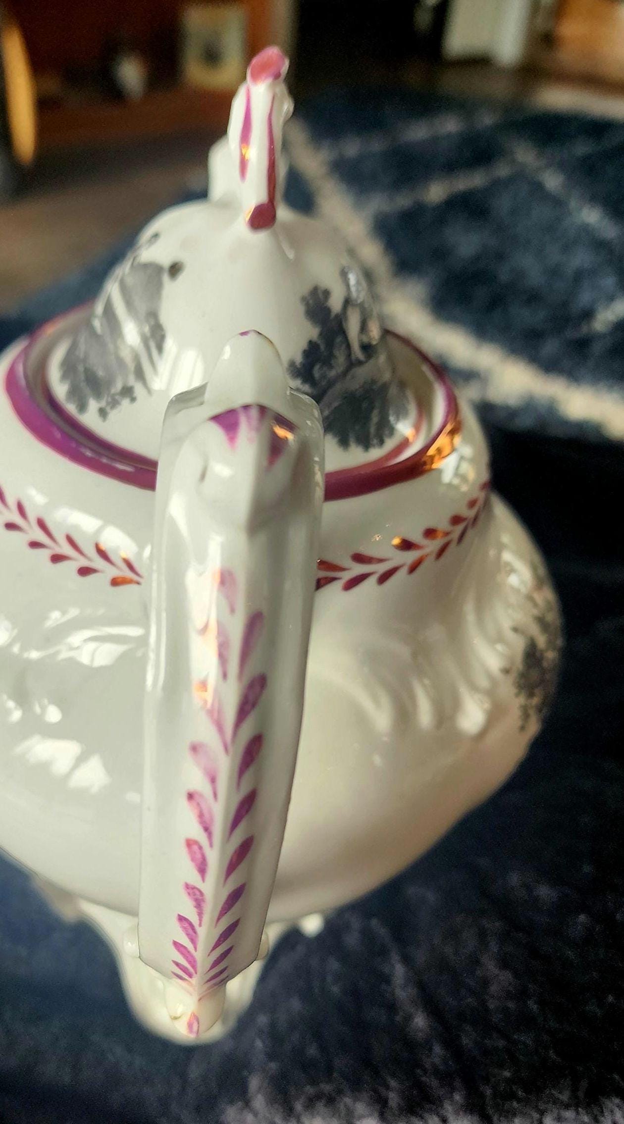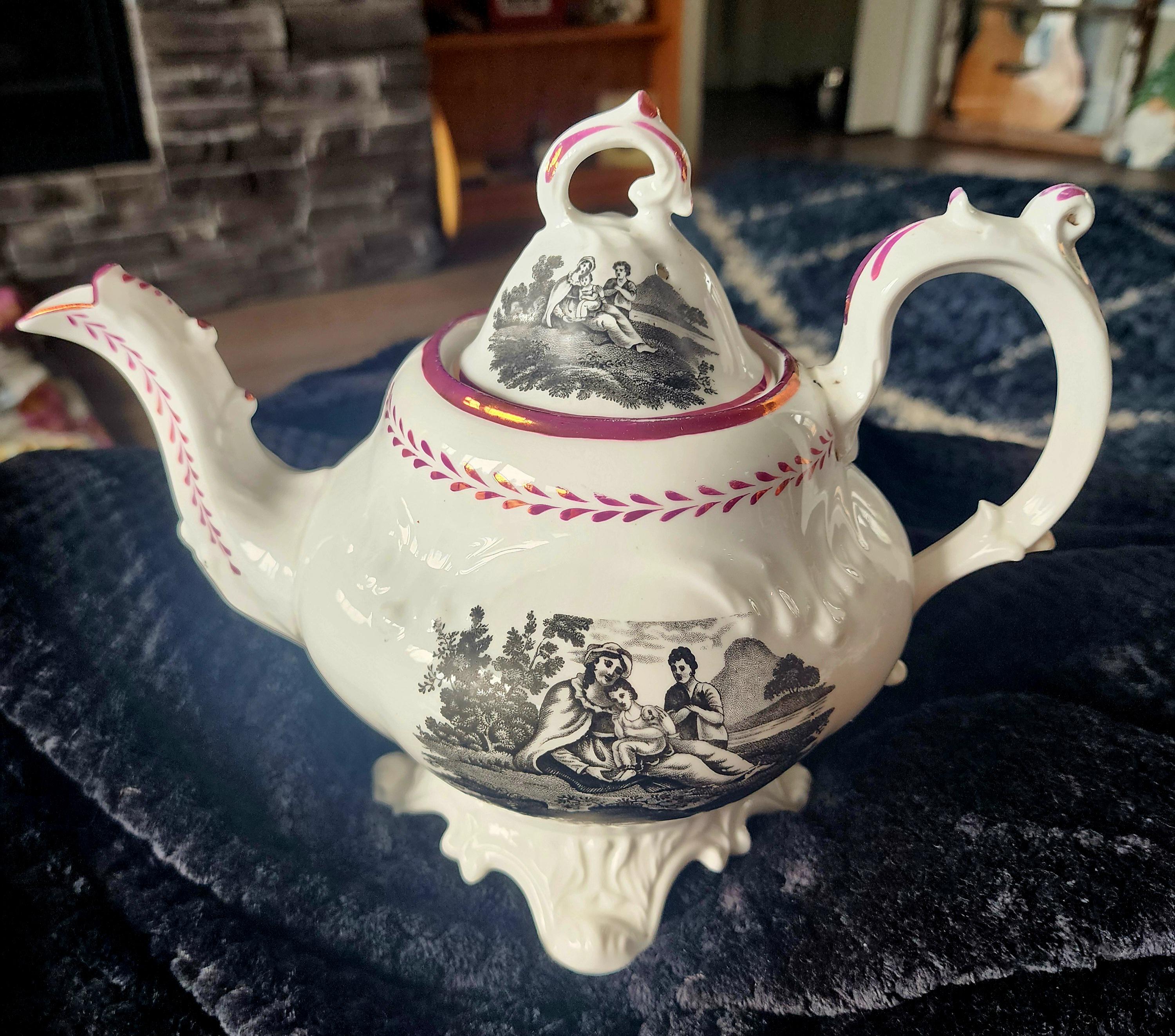 Antique Victorian Transferware Teapot – English Pastoral Scene, Burgundy Trim
