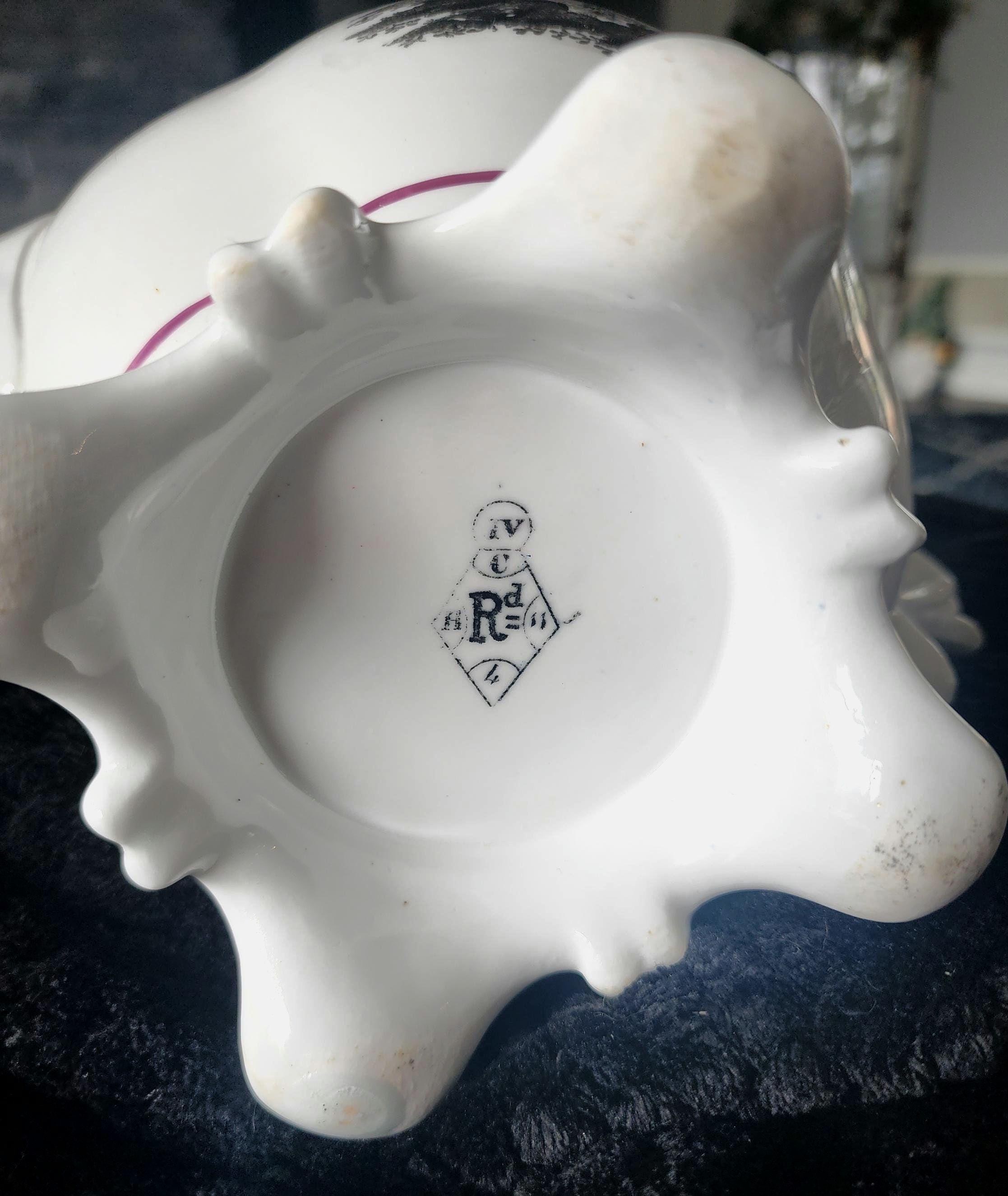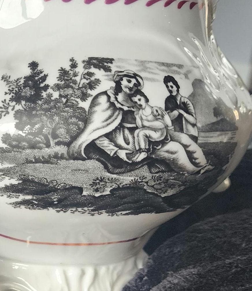Decorated with a black transferware pastoral scene on both sides, the design captures a serene countryside motif framed by ornate scrollwork.