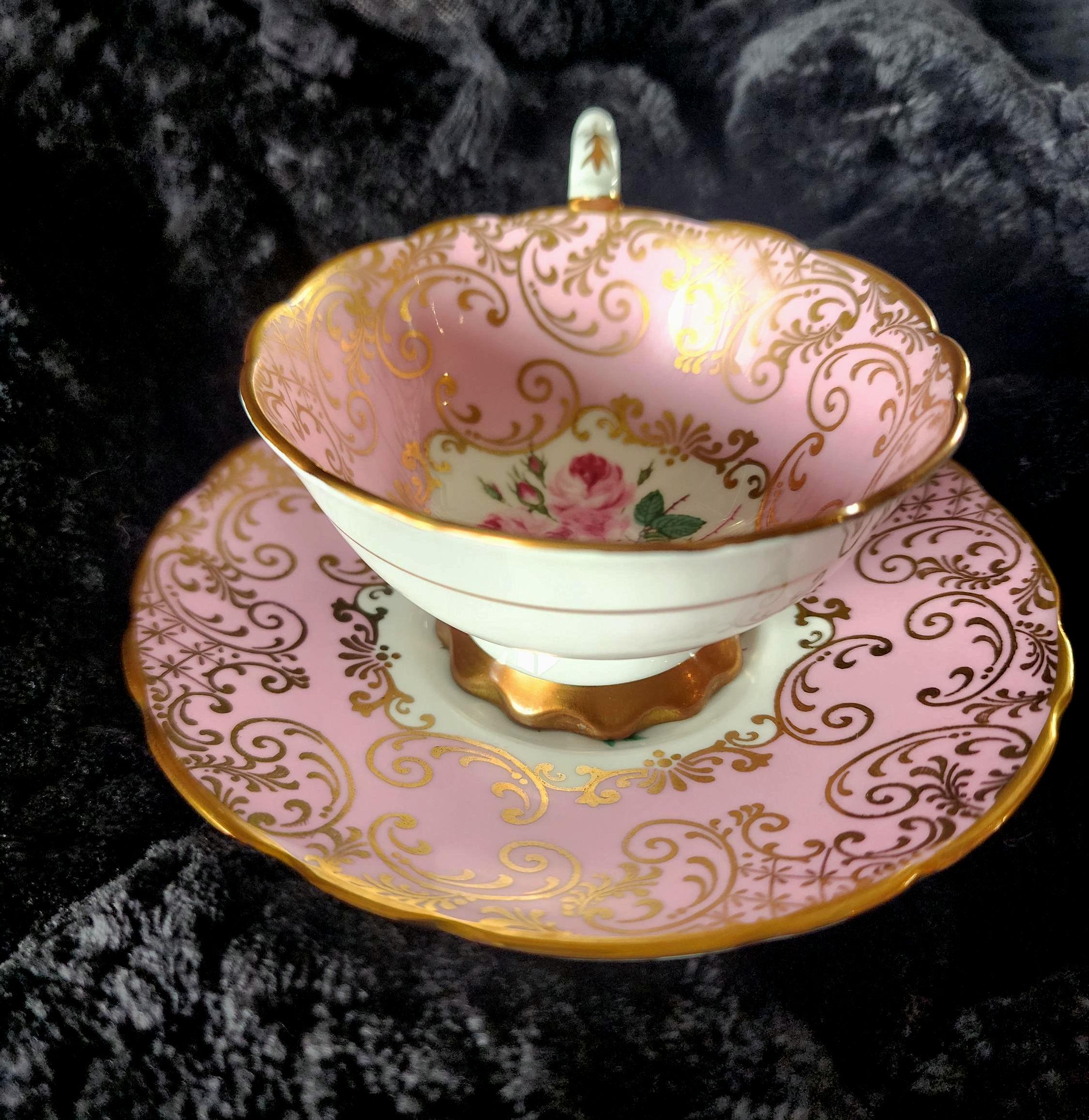 This collectible set features a soft pale pink background, lavish gold ornate trim, and a charming pink rose centered on each saucer and inside each cup, exemplifying classic English craftsmanship. Perfect for collectors, tea enthusiasts, or those seeking a statement piece for special occasions.