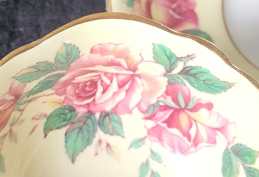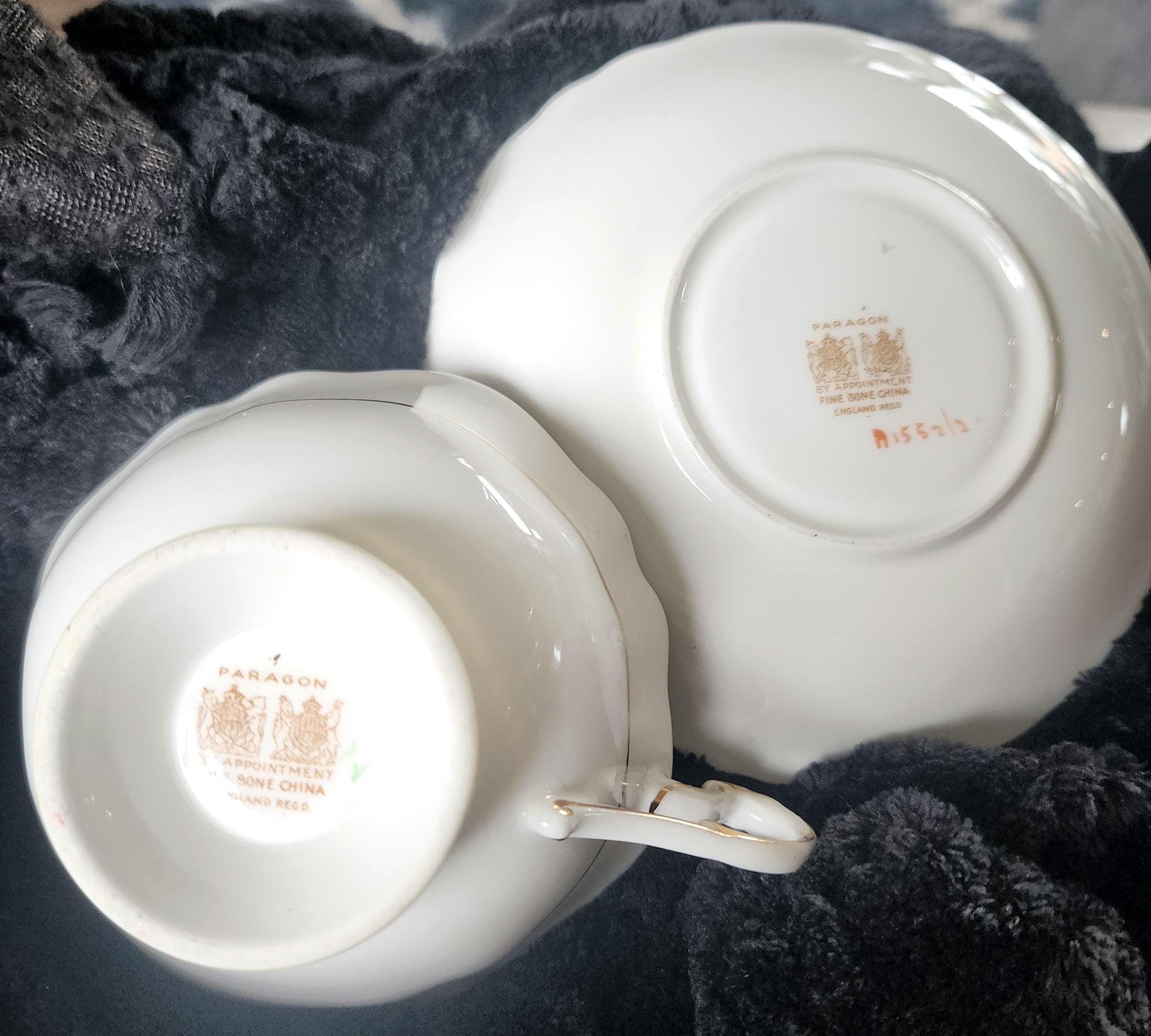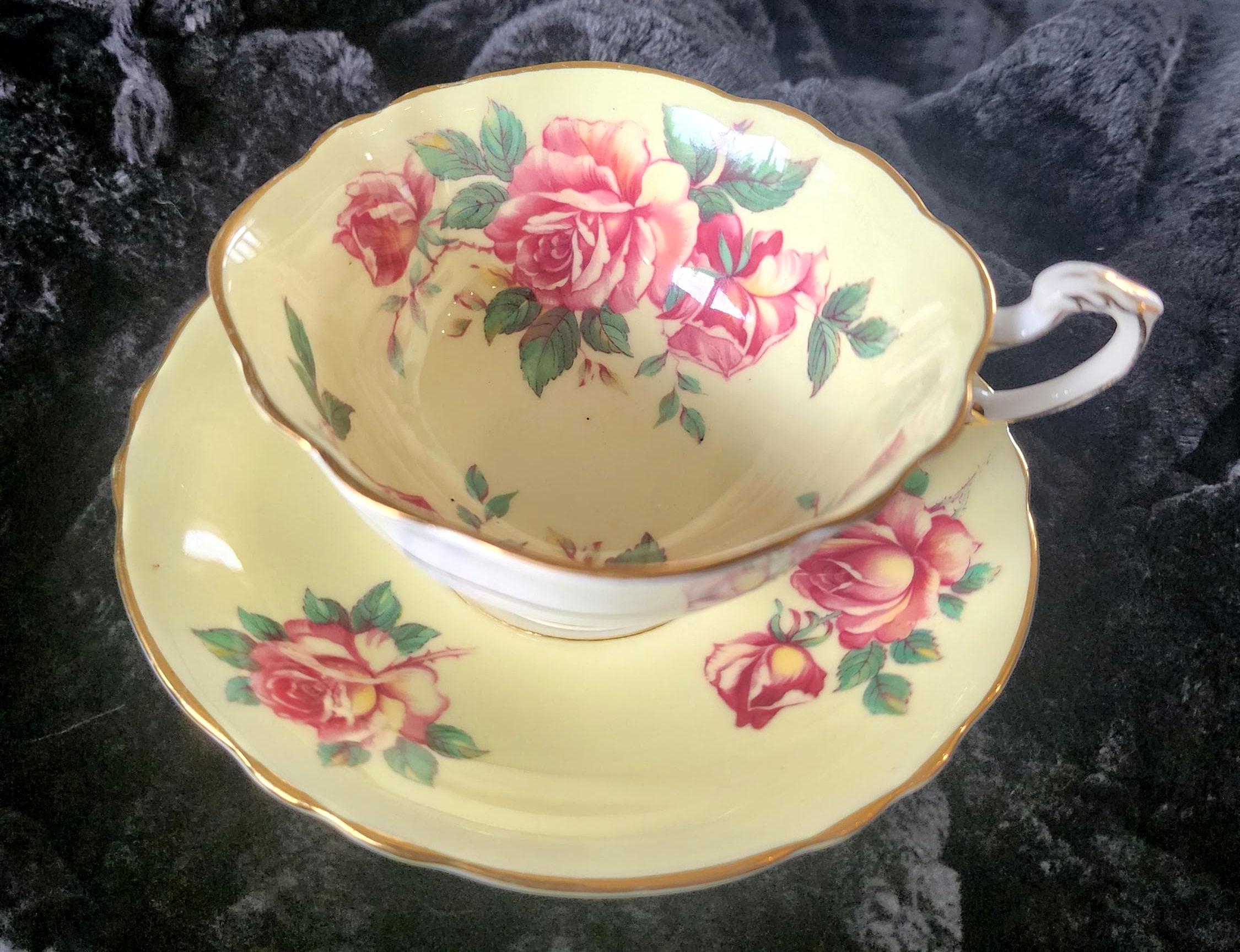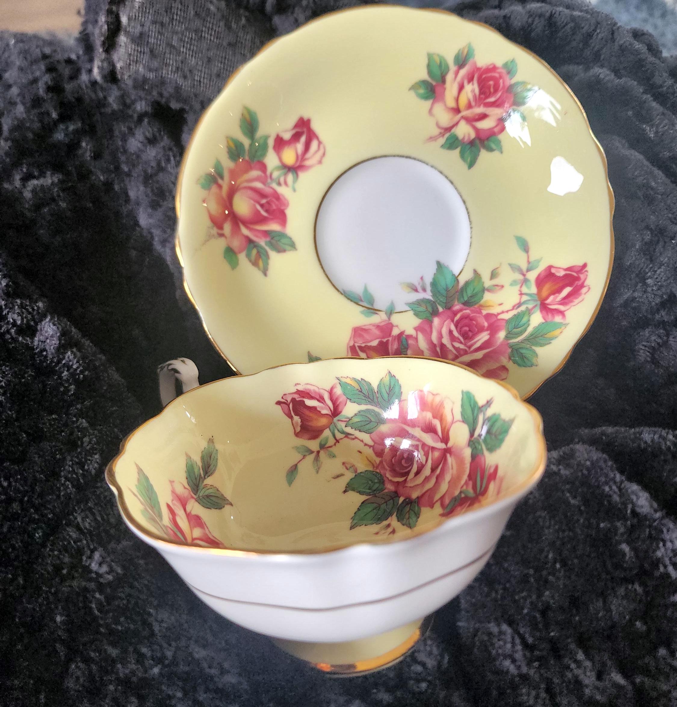 This Paragon teacup and saucer set features a striking floral design on a rich yellow background. The saucer has a white well—specifically the indentation designed to hold the teacup—creating a clean contrast against the vibrant yellow and delicate floral pattern. The teacup mirrors the saucer’s design, offering a coordinated and elegant look. Perfect for collectors or for adding a touch of classic English charm to your tea service.