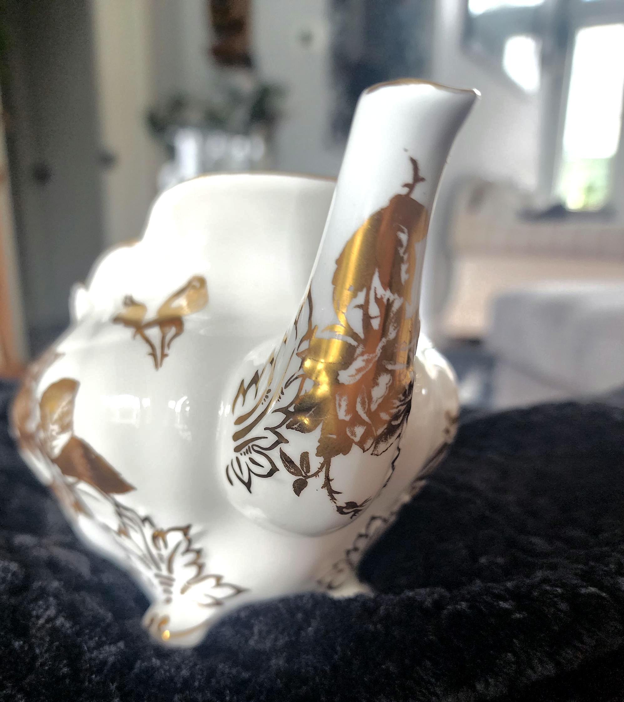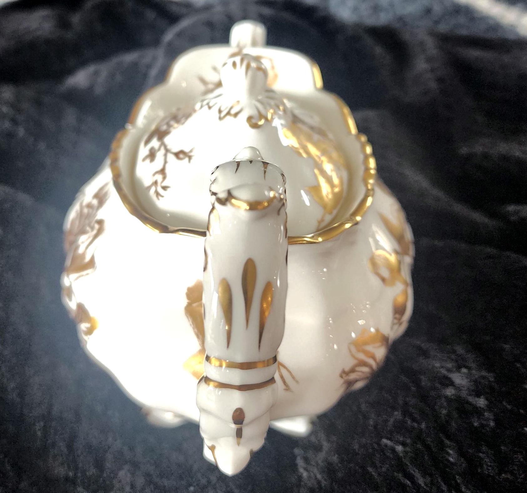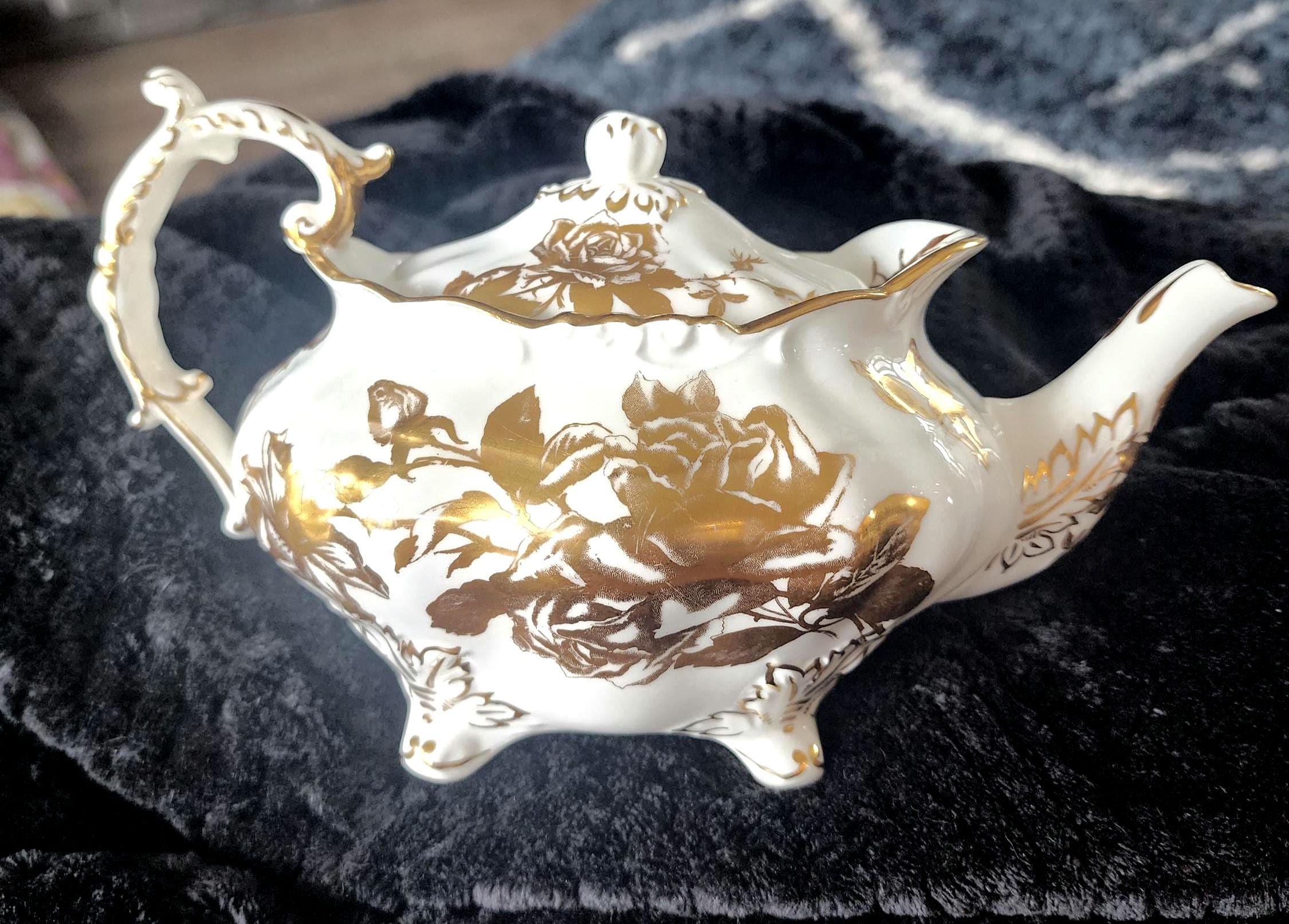 This vintage Hammersley teapot is a beautiful example of English bone china craftsmanship from the 1960s. It features the classic Aladdin shape, adorned with delicate gold floral bouquets on a pristine white background, with intricate gold detailing that adds elegance to any tea service. Perfect for collectors or as a charming addition to a vintage tea set.