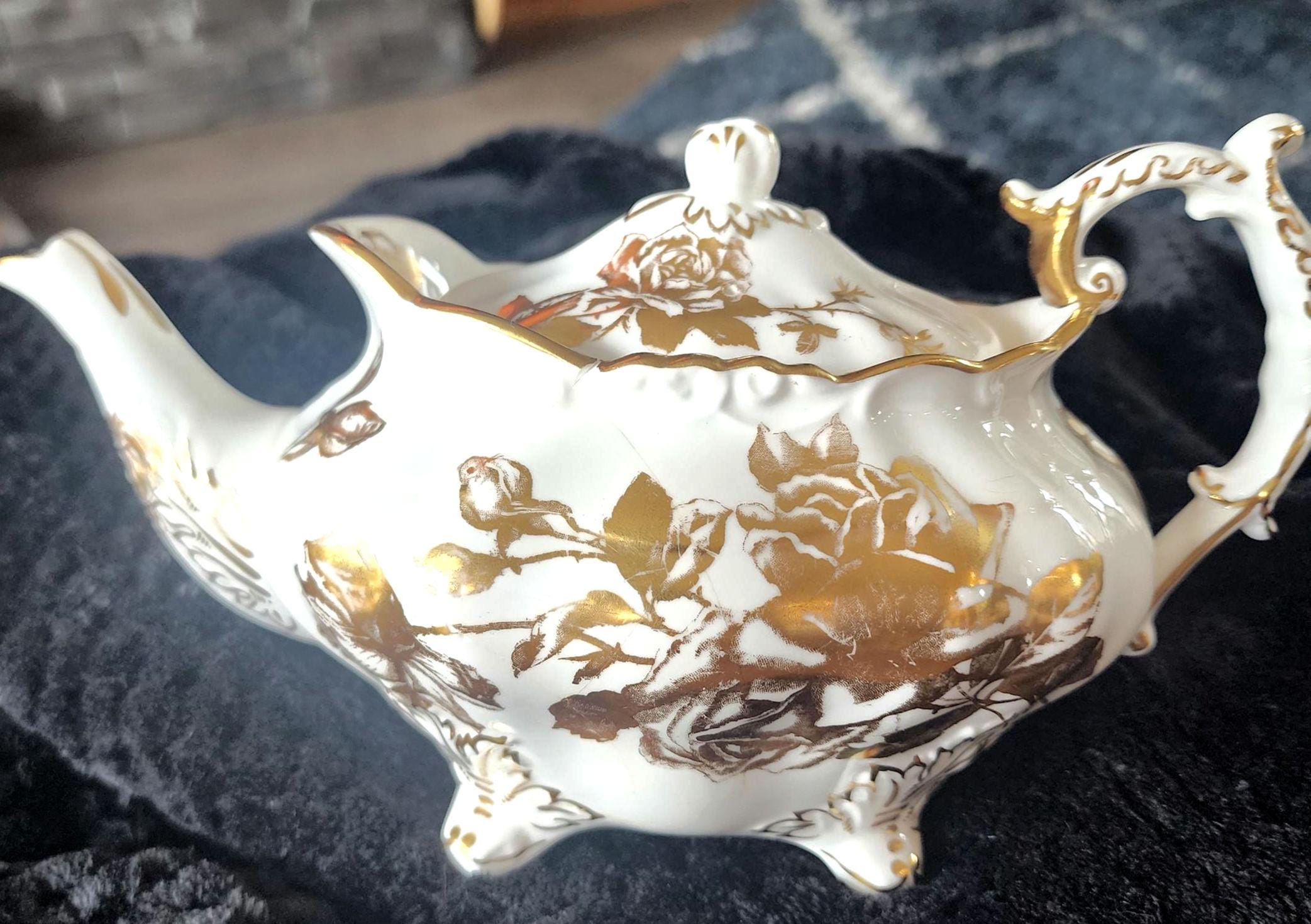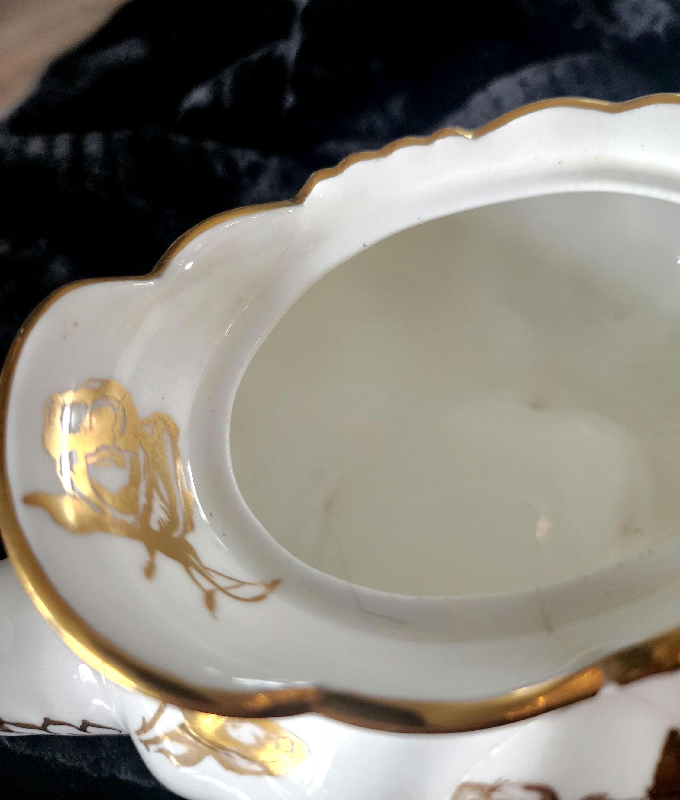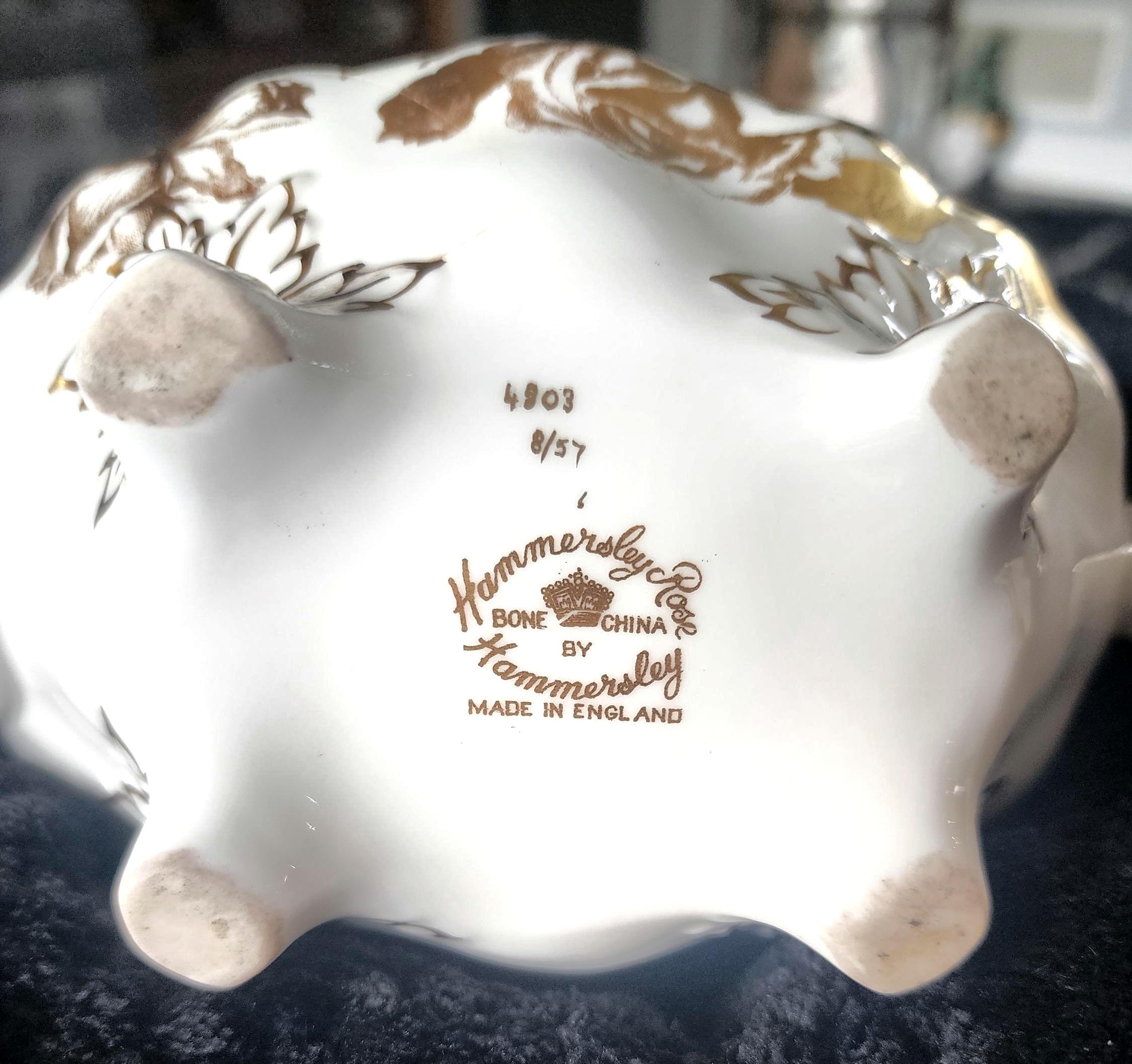 This vintage Hammersley teapot is a beautiful example of English bone china craftsmanship from the 1960s. It features the classic Aladdin shape, adorned with delicate gold floral bouquets on a pristine white background, with intricate gold detailing that adds elegance to any tea service. Perfect for collectors or as a charming addition to a vintage tea set.