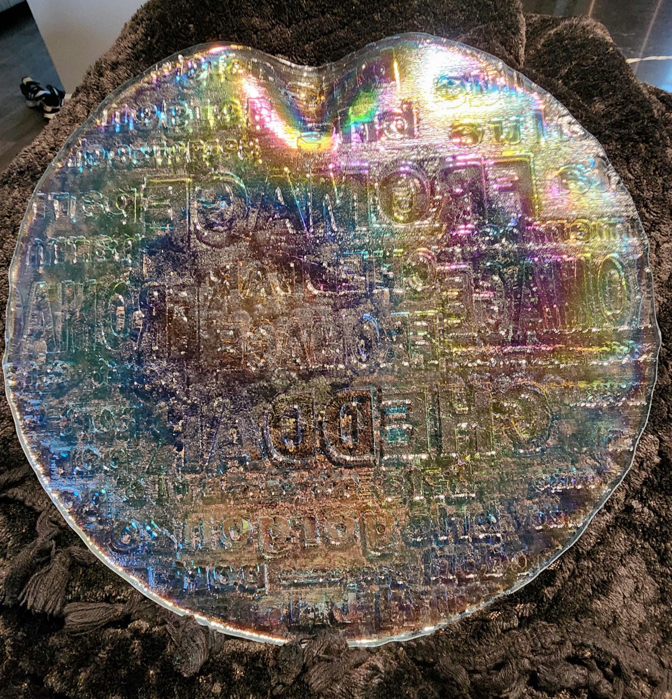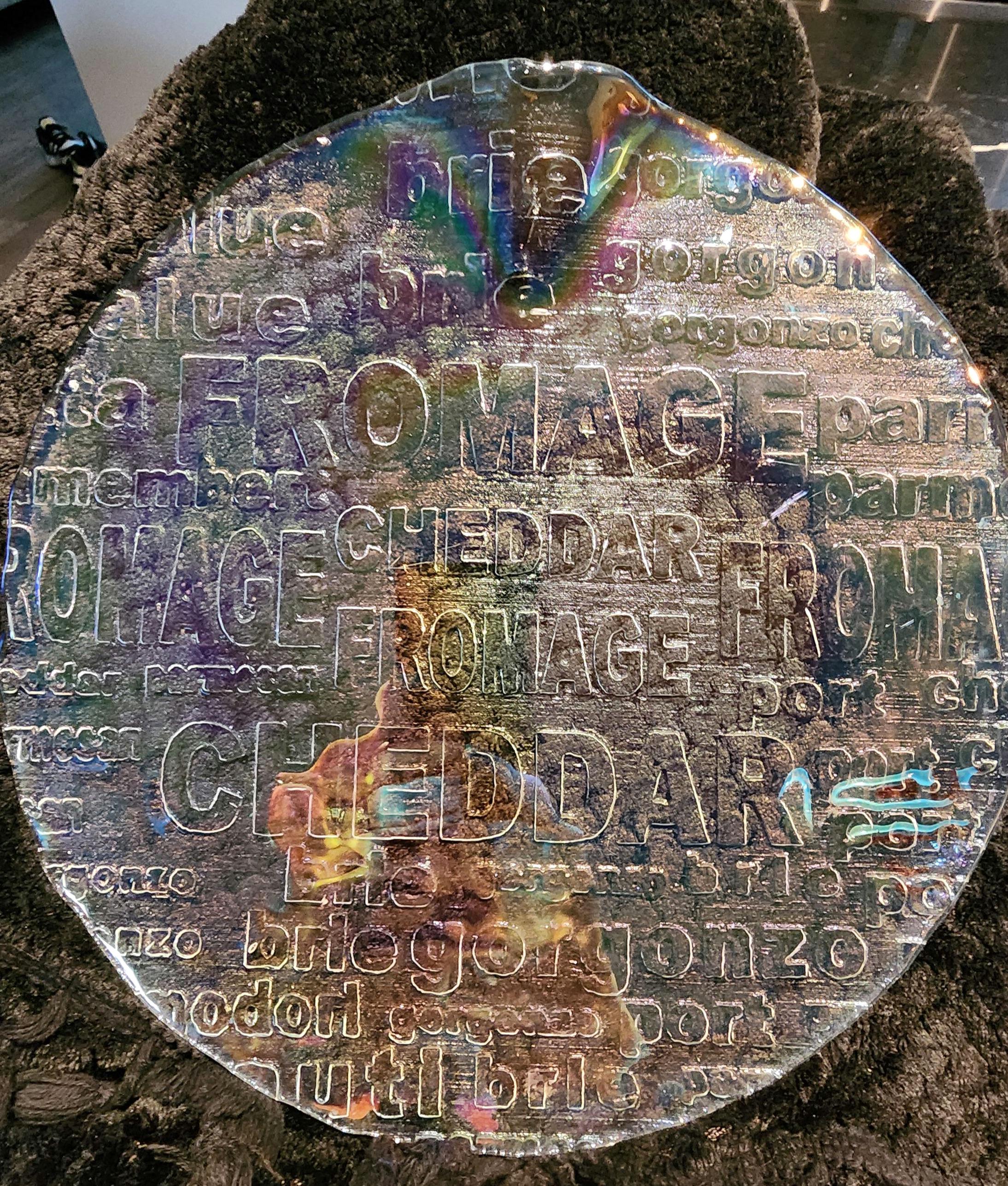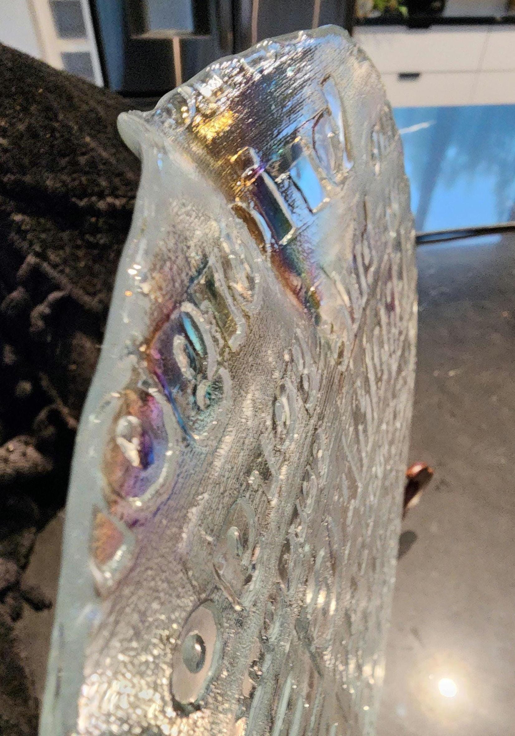Serve in style with this vintage Royal Krona crystal cheese platter, designed by celebrated Swedish designer Bengt Edenfalk. This mid-century modern piece features embossed cheese names like CHEDDAR, FROMAGE, BRIE, and GORGONZOLA, making it both decorative and functional. When held in light, the platter displays a subtle rainbow-like, oil-slick effect across its surface, adding a magical, luminous quality. Perfect for presenting an assortment of cheeses, fruits, and crackers, it brings a touch of Scandinavian elegance to any gathering. A collectible piece for design lovers and entertaining enthusiasts alike.