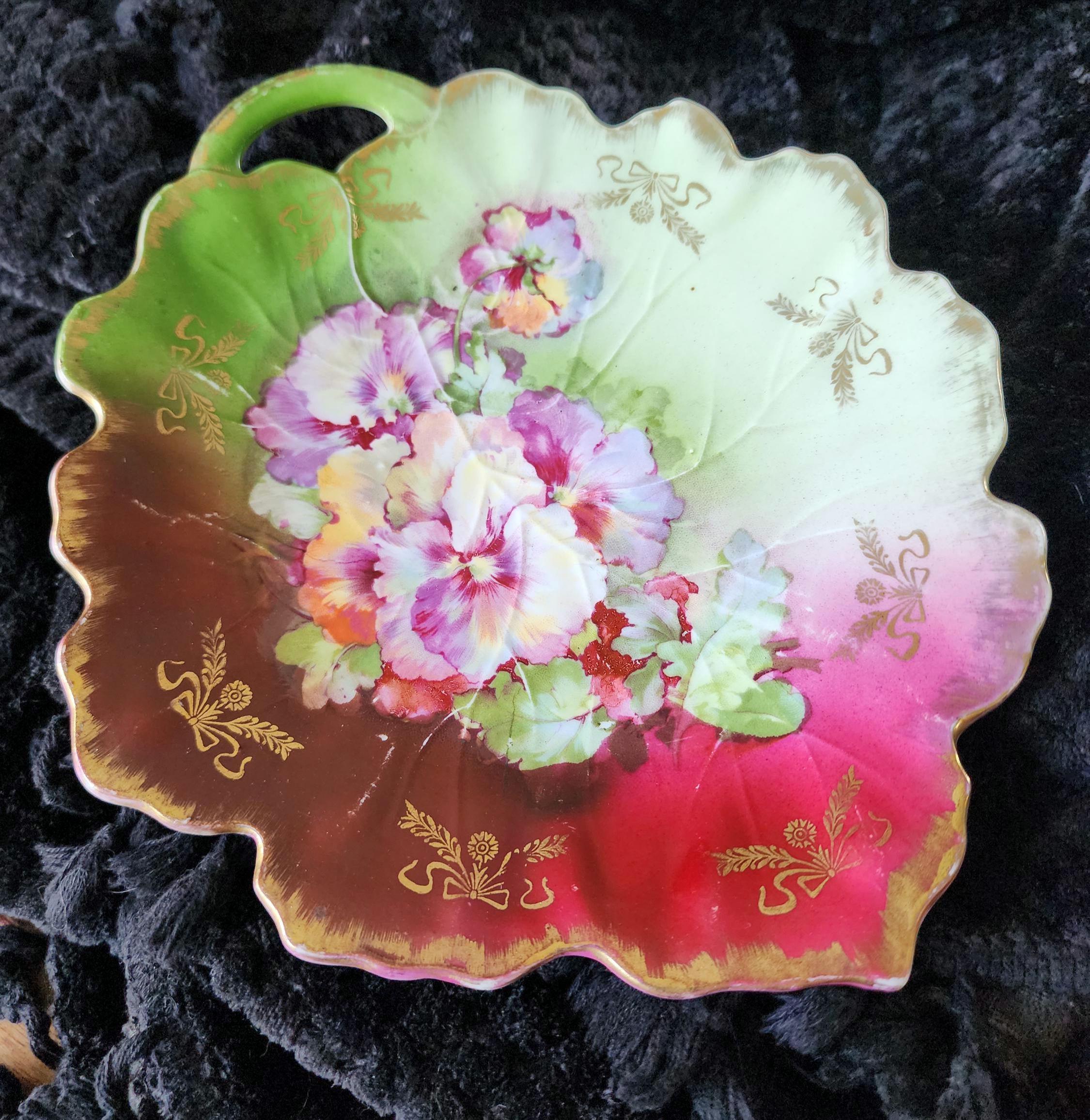 Antique Bavarian Hand Painted Pansy Porcelain Plate with Handle & Gold Gilt – c.1900