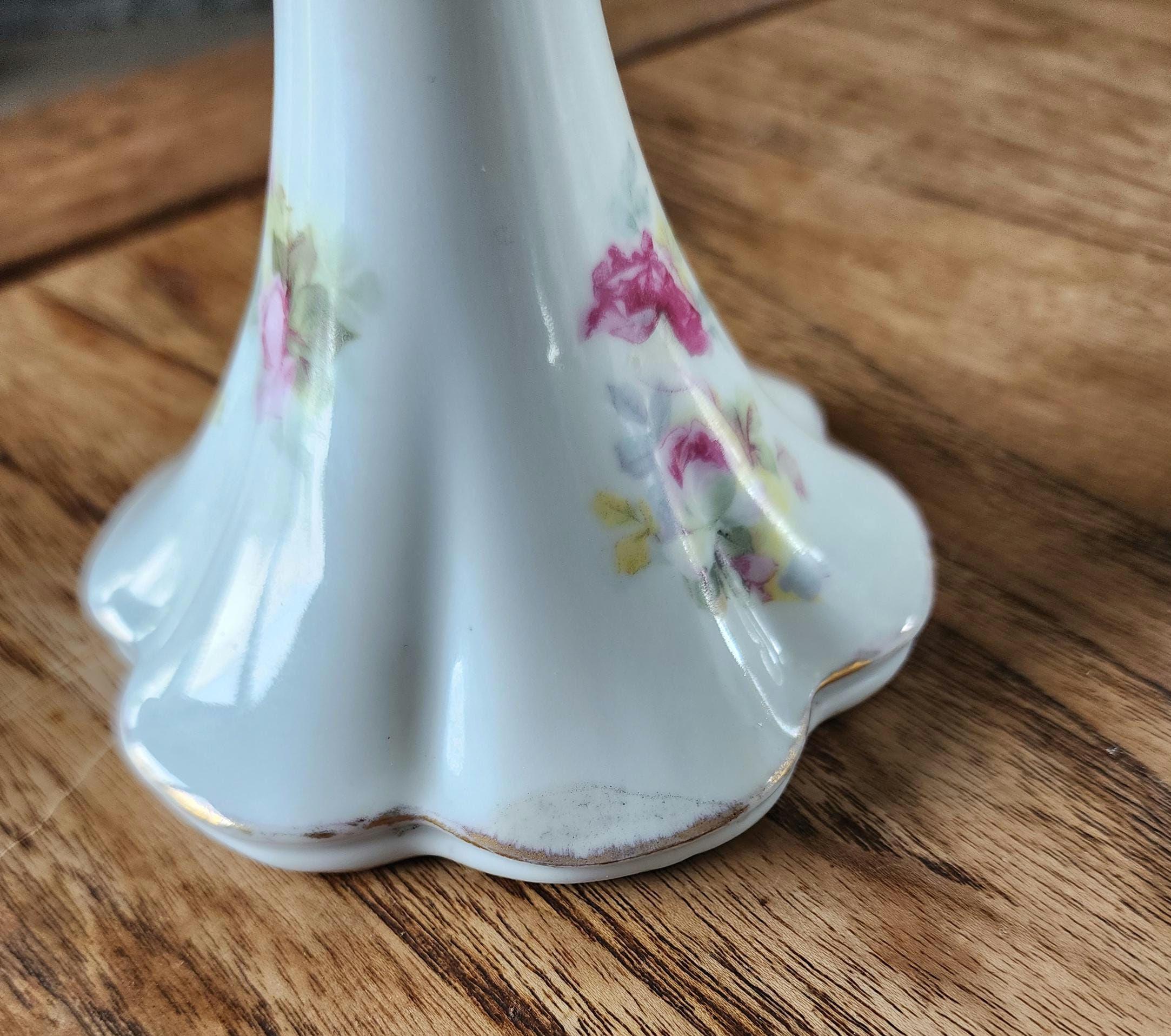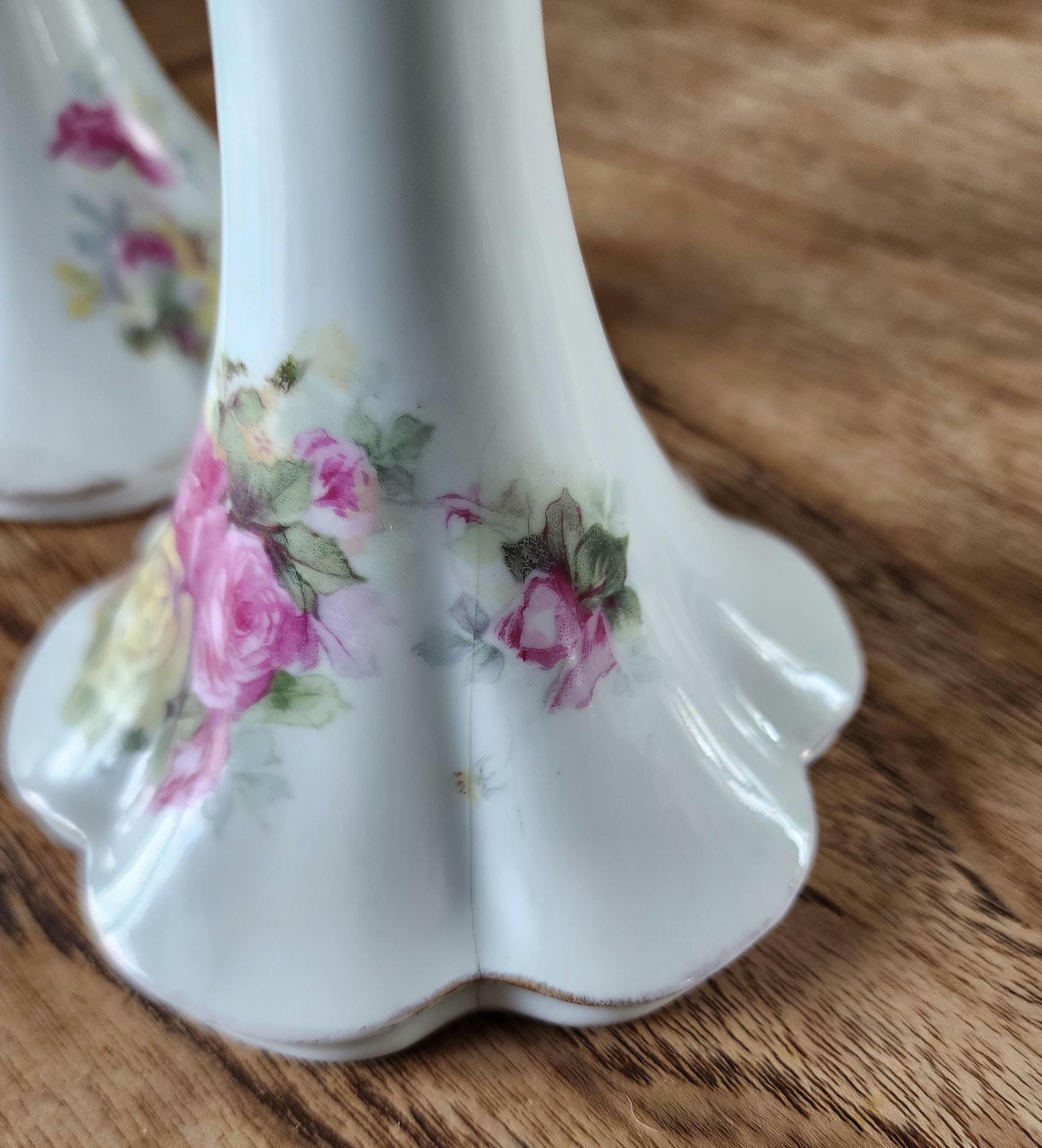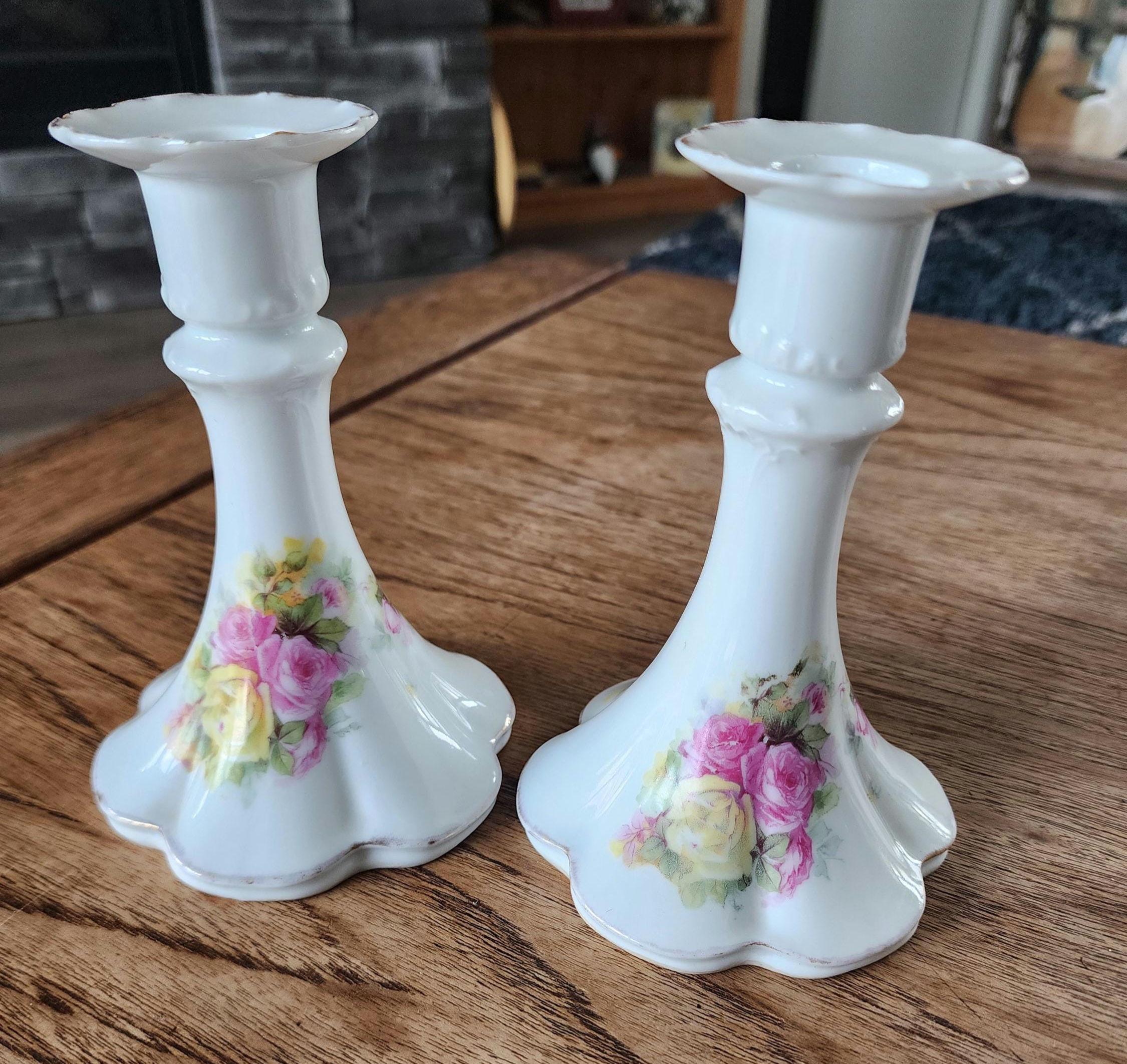 One candle holder has a tiny hairline and minor scuff, as shown in the photos, but it does not affect overall beauty or stability. These vintage candle holders are perfect for collectors of German porcelain, antique tableware, or floral décor, and they make a charming addition to a mantel, dining table, or display cabinet.