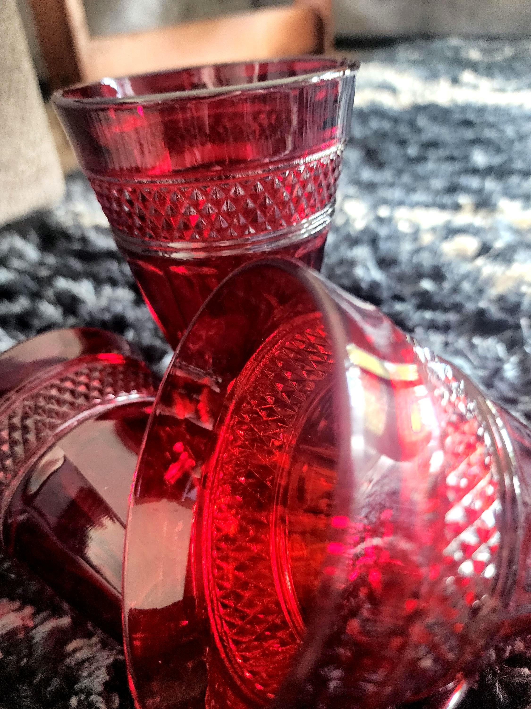 This rare vintage Viking Glass “Mt. Vernon” ruby red goblet captures the elegance and craftsmanship of mid-century American glassmaking.