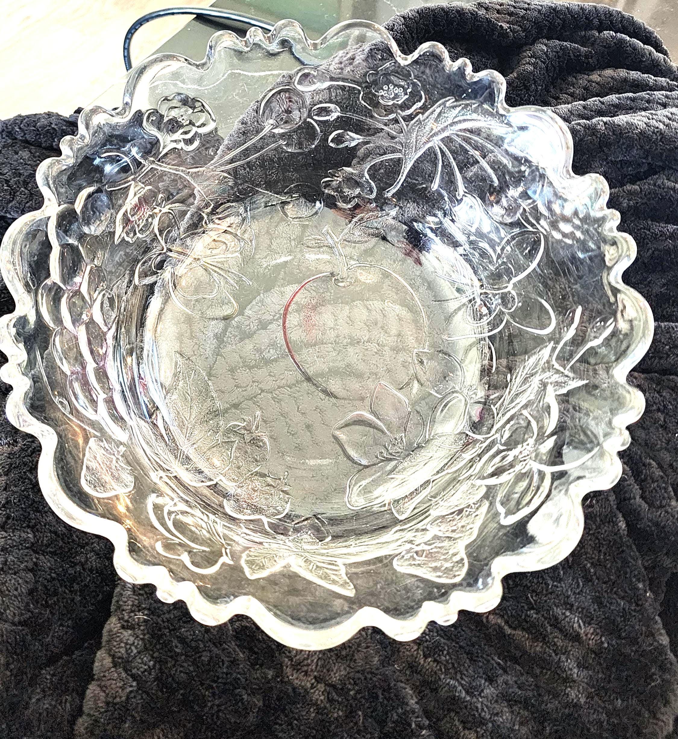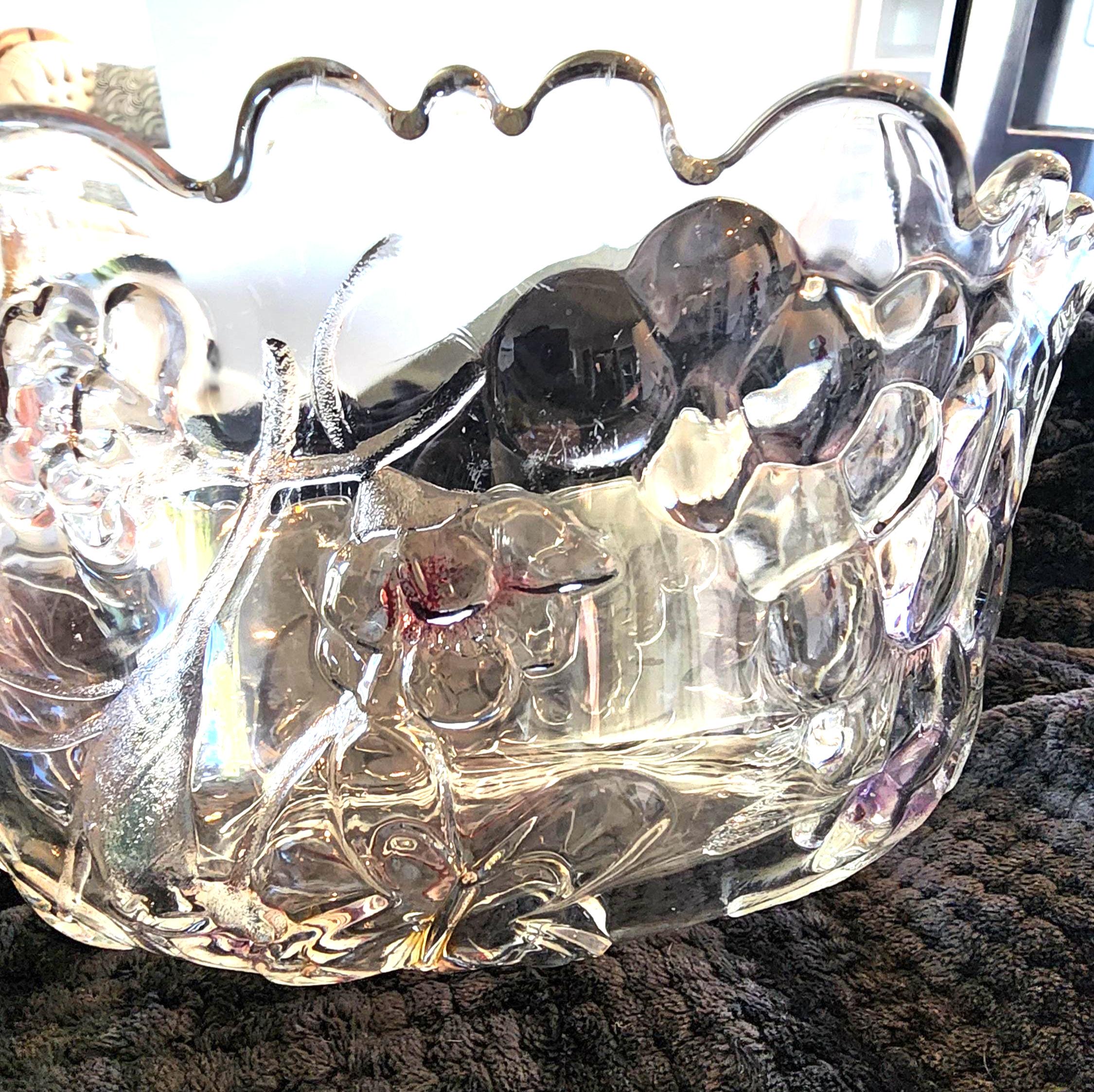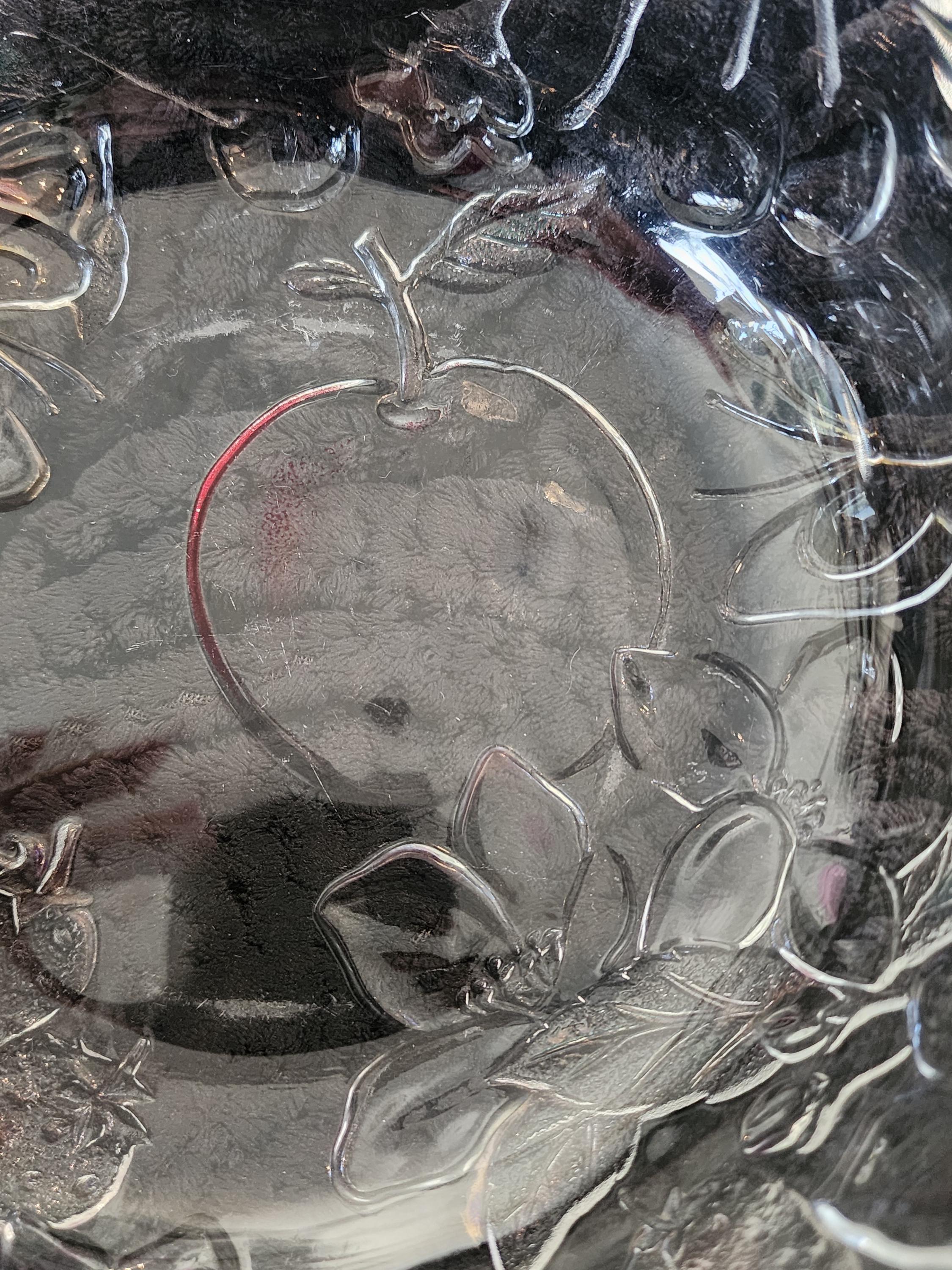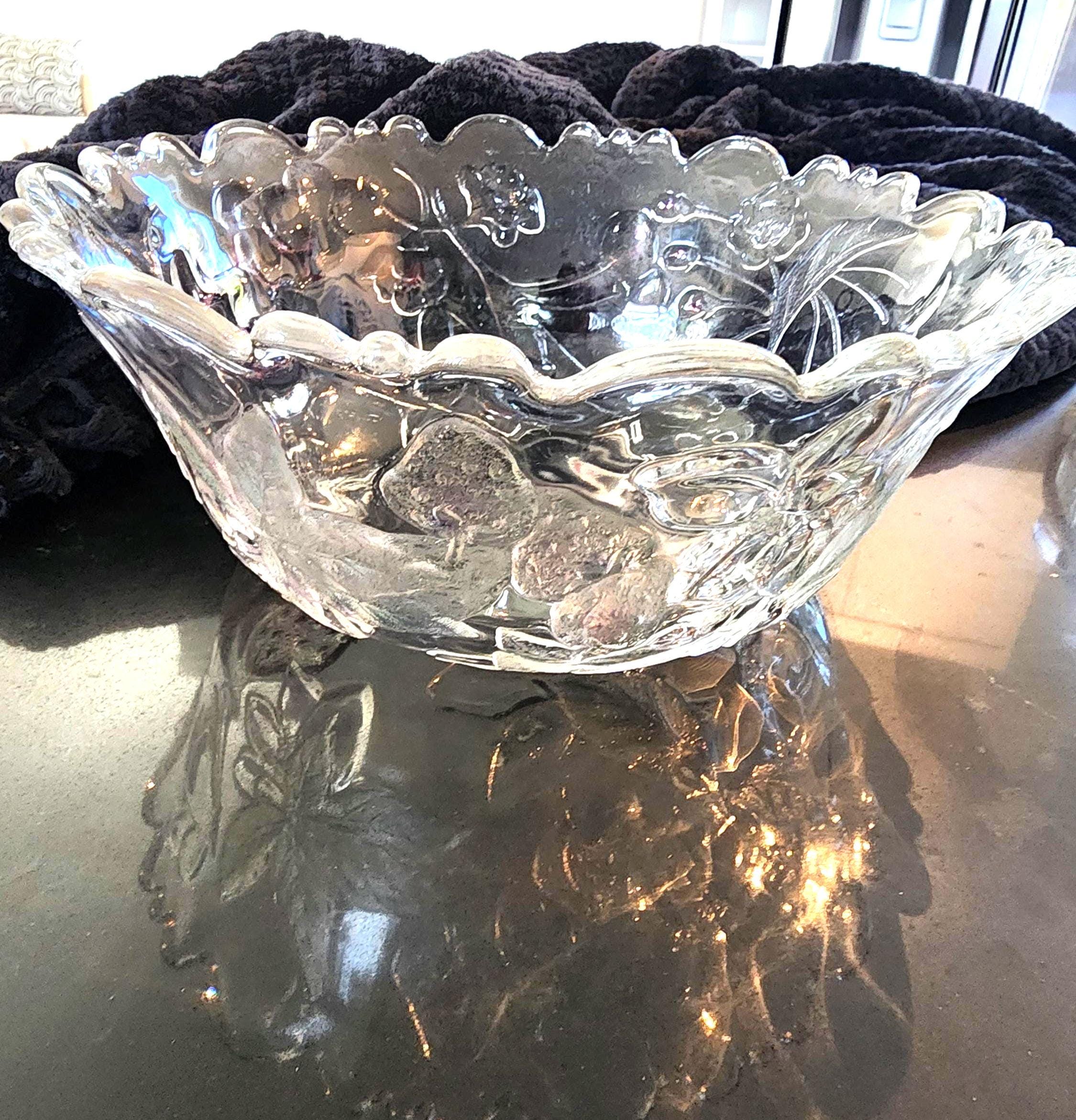 This stunning Studio Nova “Fruit Harvest” pressed glass fruit bowl showcases beautifully detailed embossed designs of apples, strawberries, grapes, and leaves.