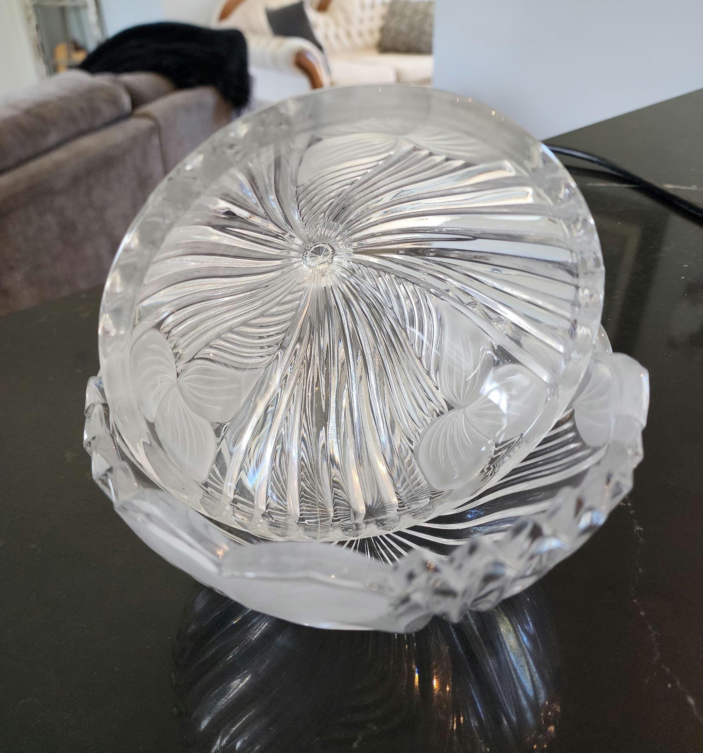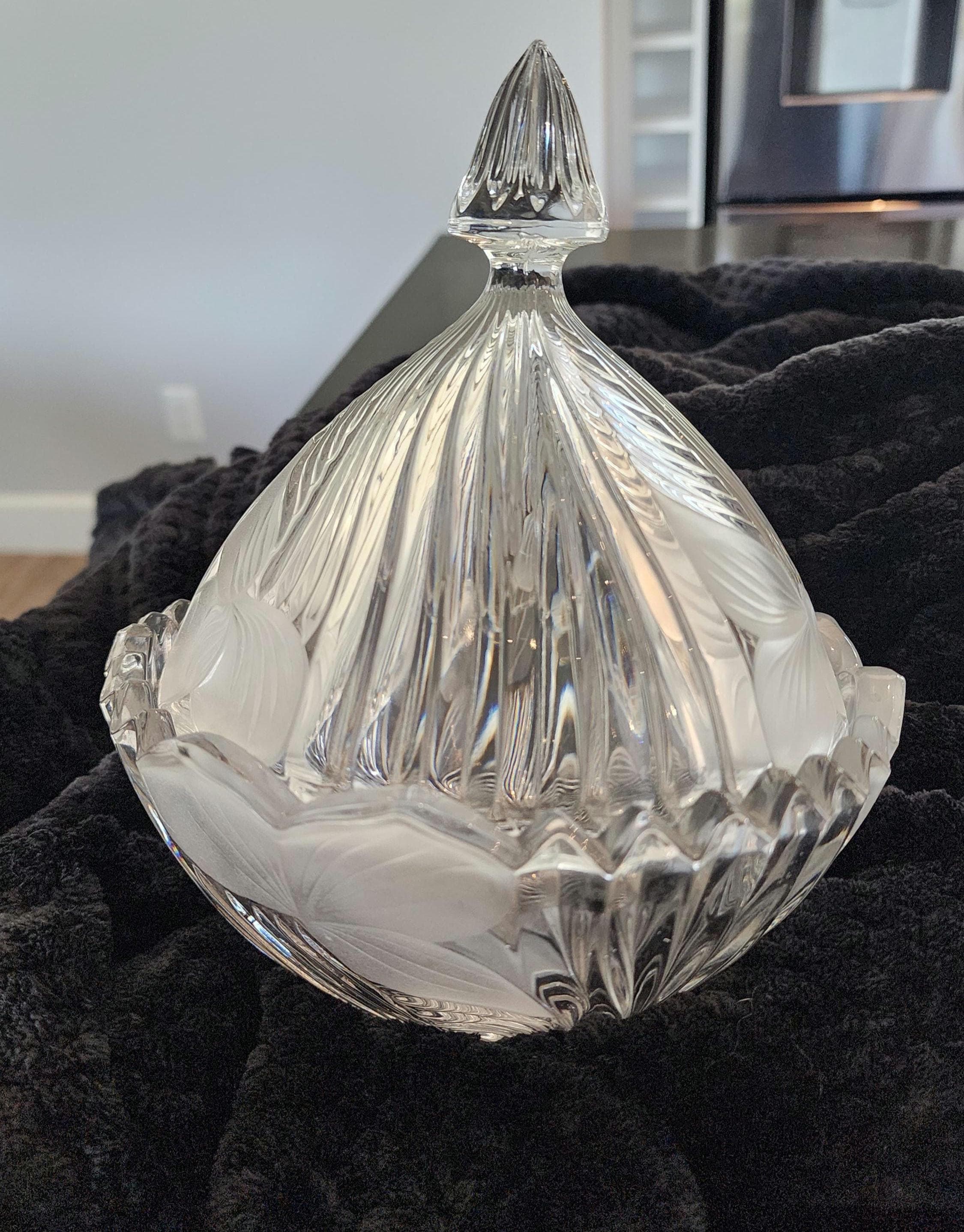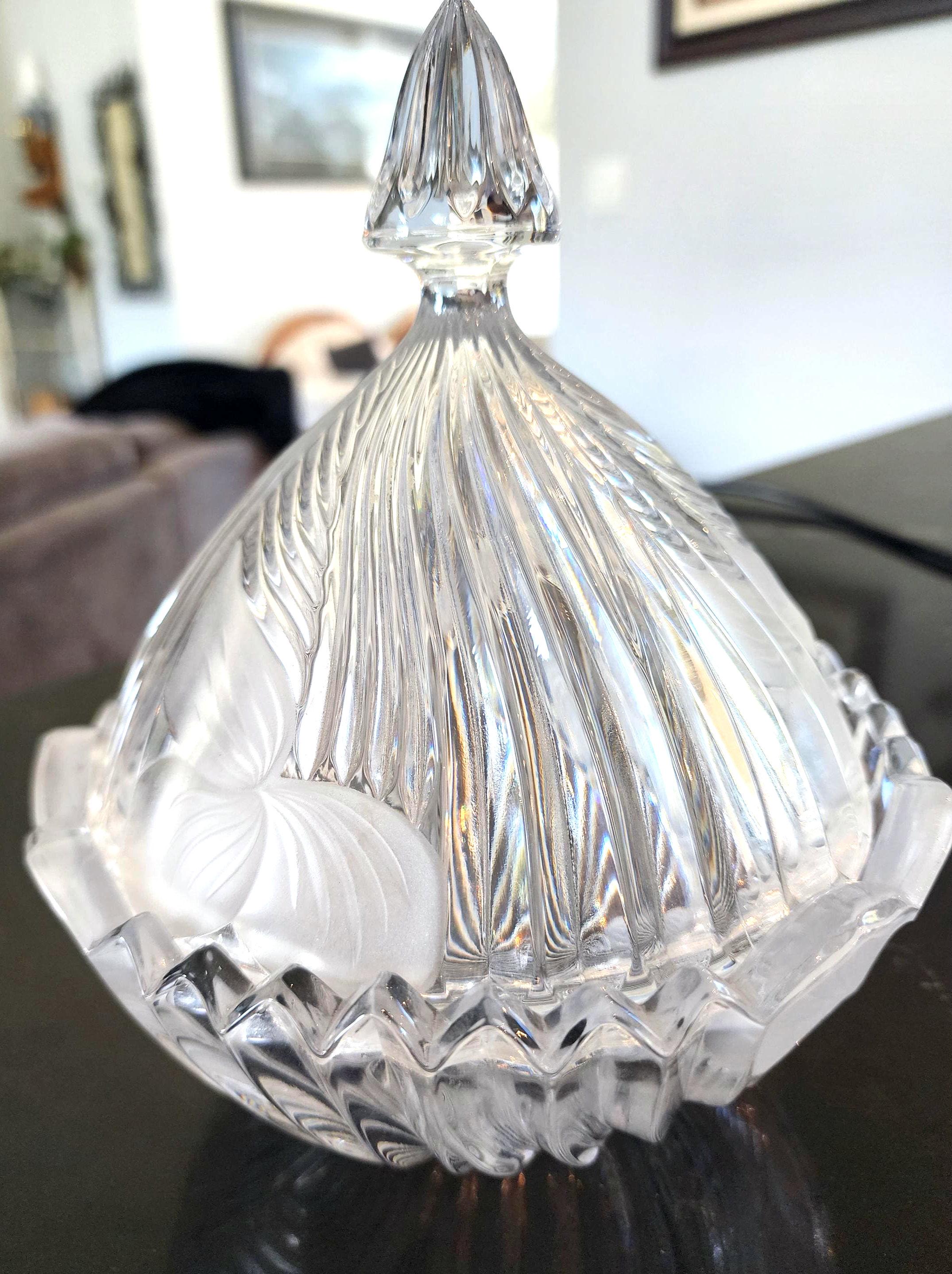 This stunning vintage Sutton Place Lead Crystal Candy Dish showcases timeless elegance and craftsmanship. Made with 24% lead crystal, it features beautifully frosted and etched trillium leaves that add a delicate, refined touch. Perfect as a candy dish, nut bowl, or centerpiece, this piece shines brilliantly under light and complements any elegant home décor.