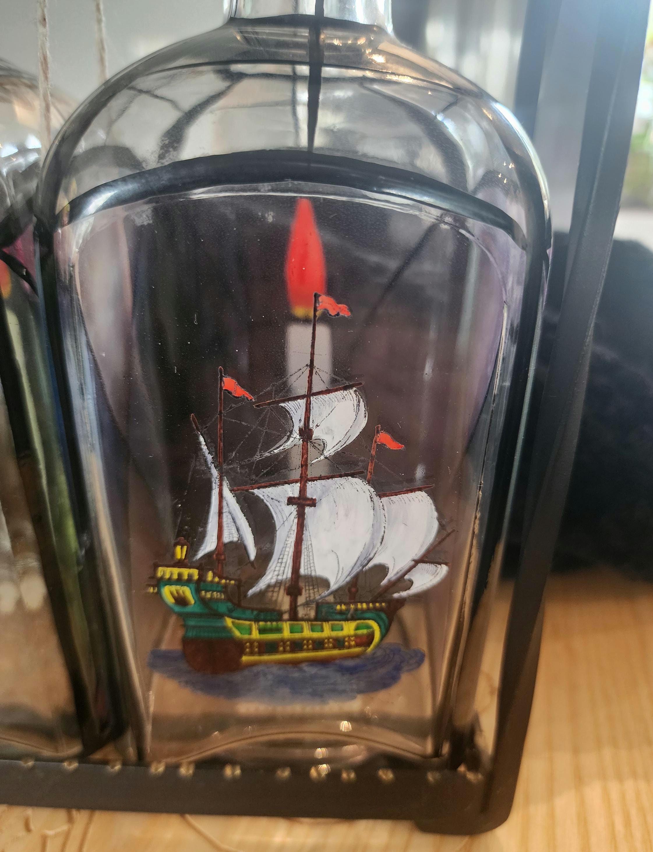 It features the intricate “Schiff + Nadel” (Ship & Needle) design — one decanter hand-painted with a sailing ship, the other with a sailor or guard, both accented with charming candle motifs on the front.