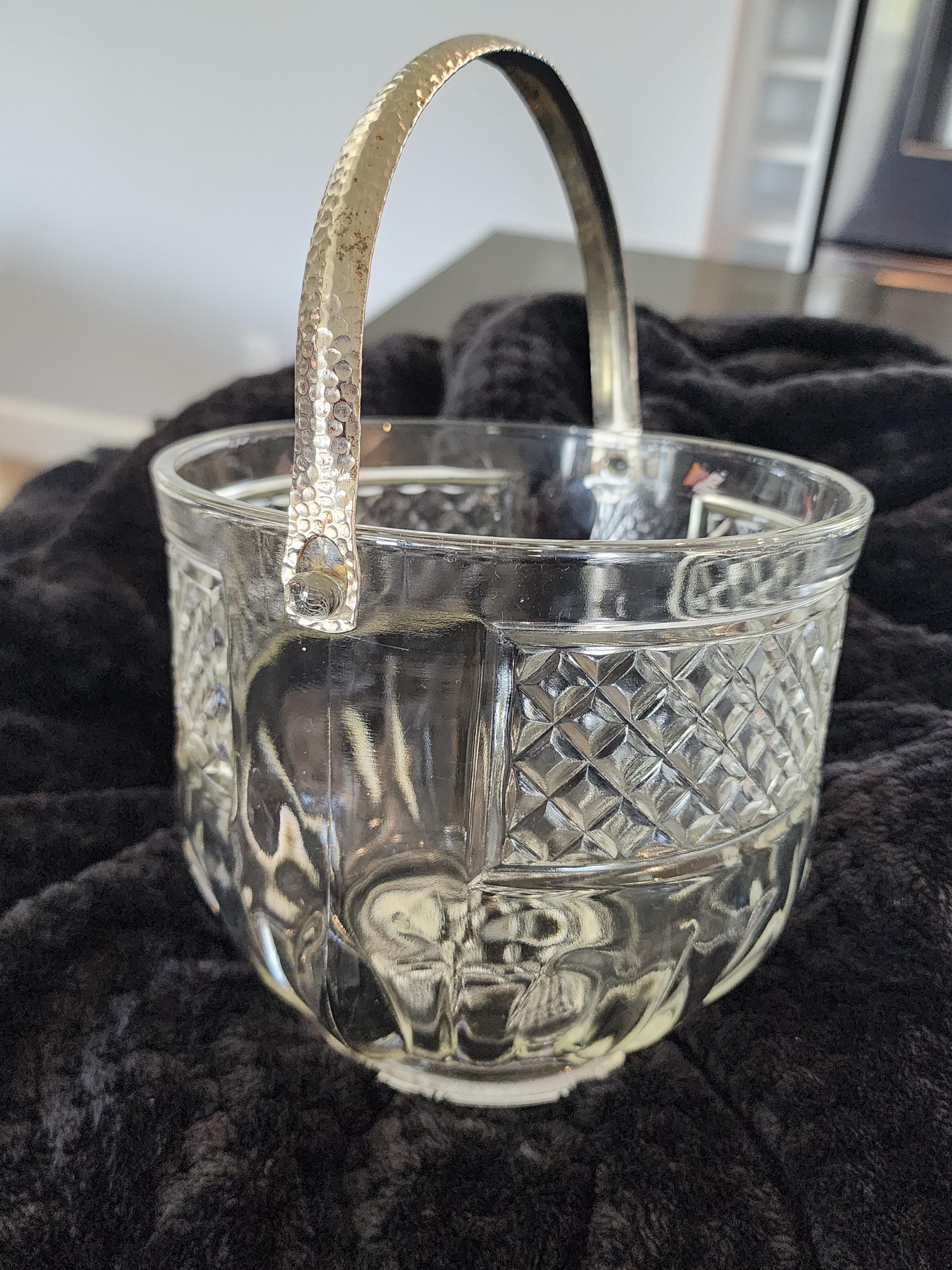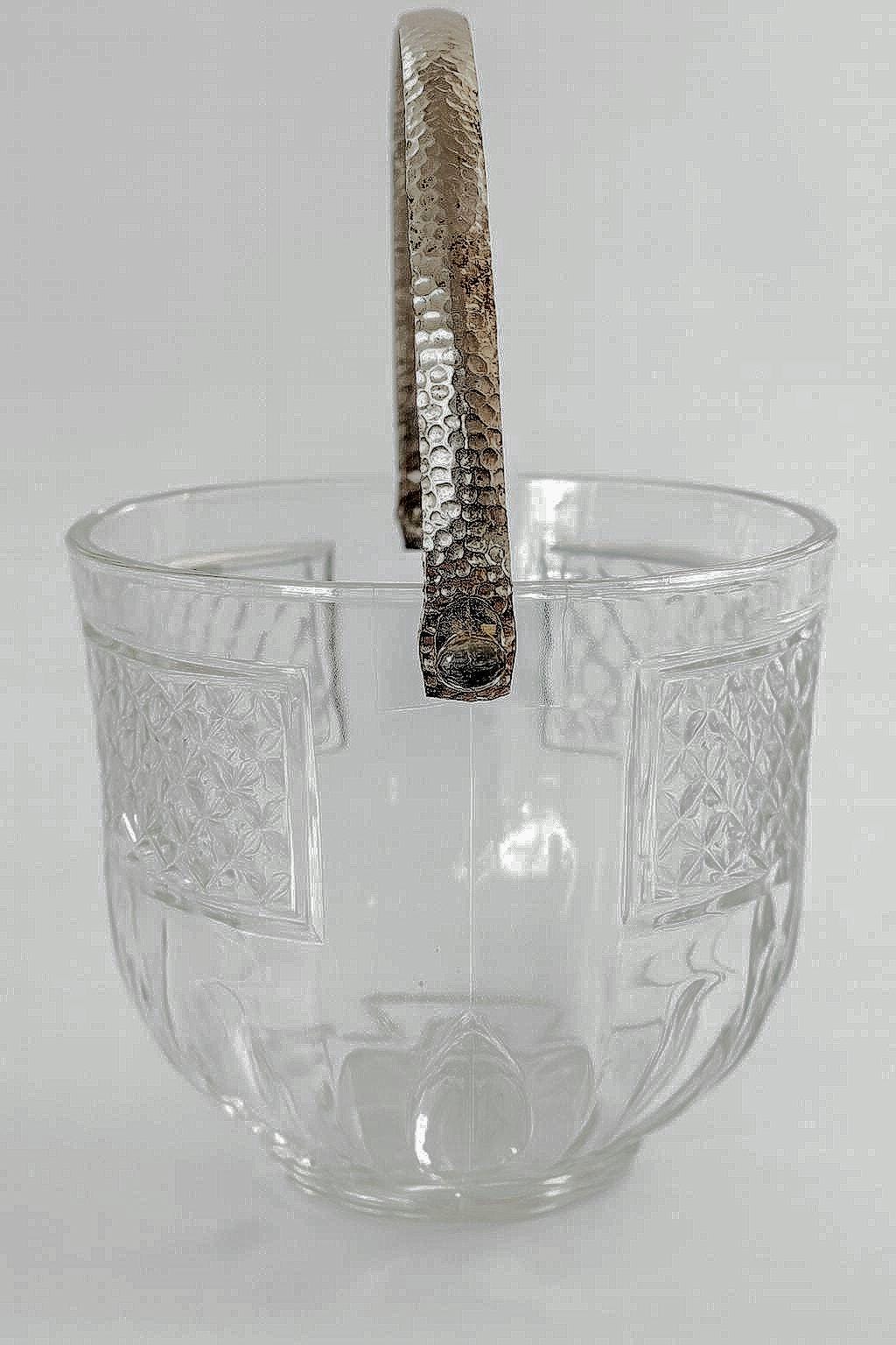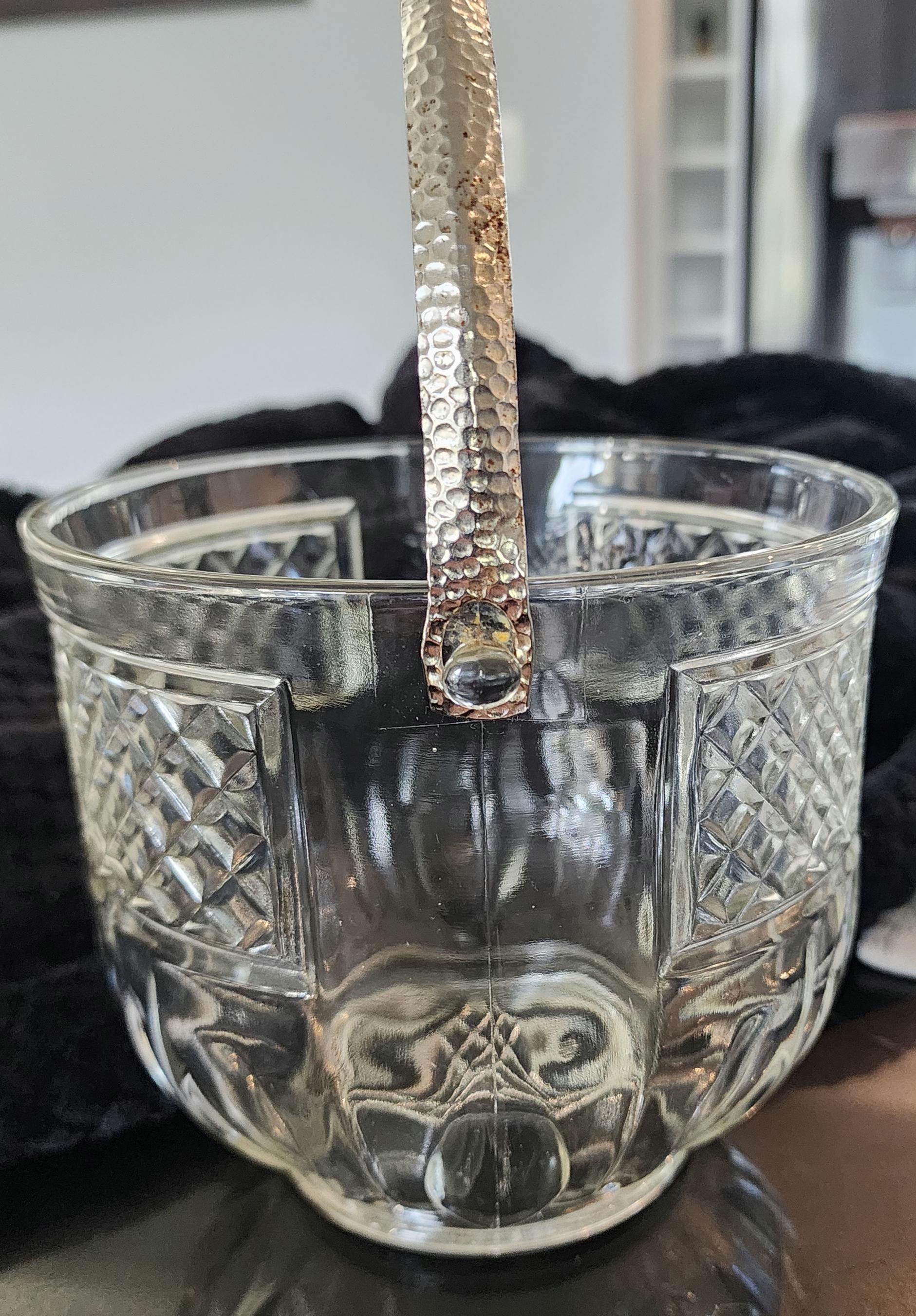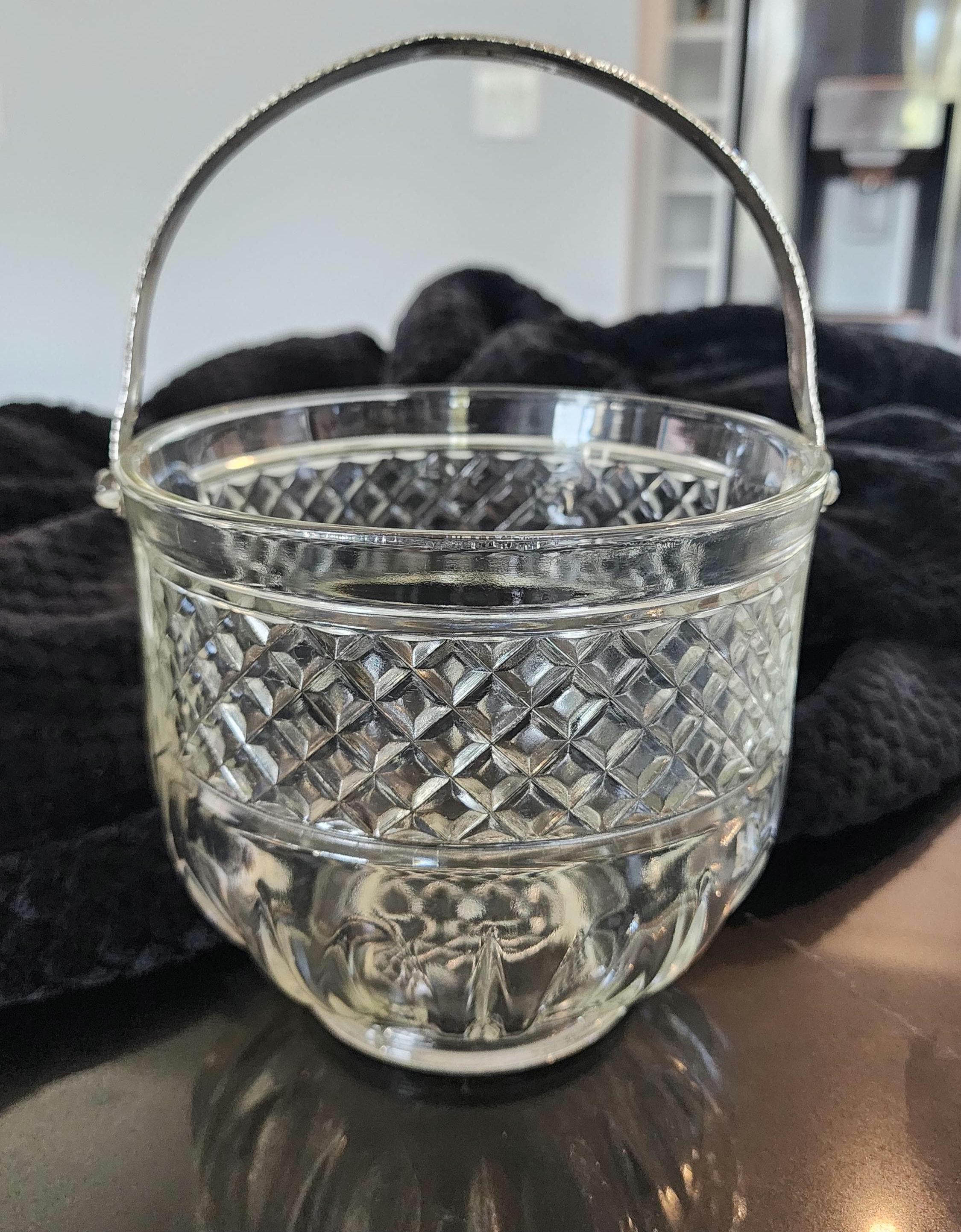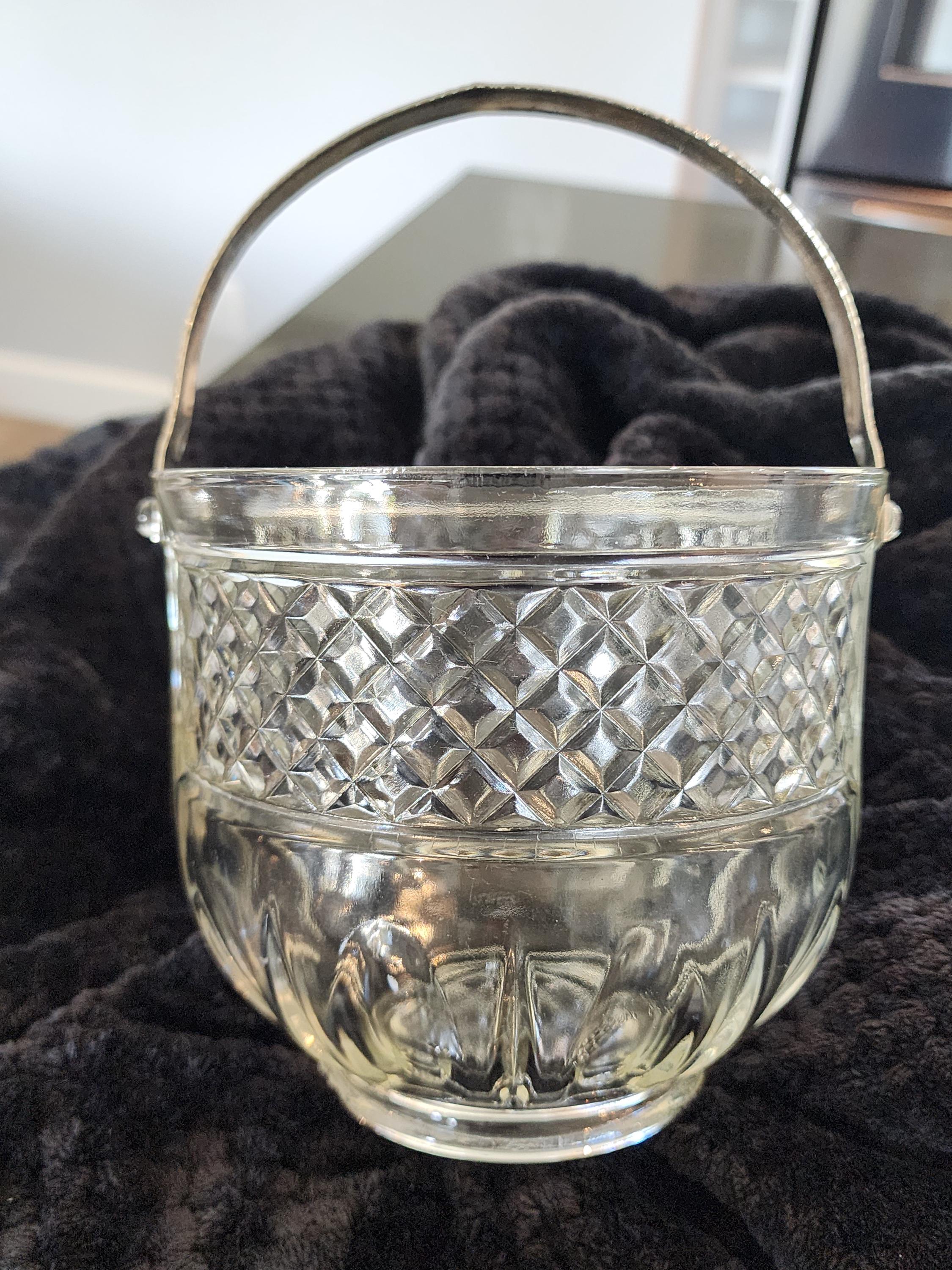 This beautiful vintage pressed glass ice bucket features a classic diamond-cut design with a paneled lower section and a sturdy hammered metal handle. Perfect for your home bar, entertaining guests, or as a stylish décor piece.