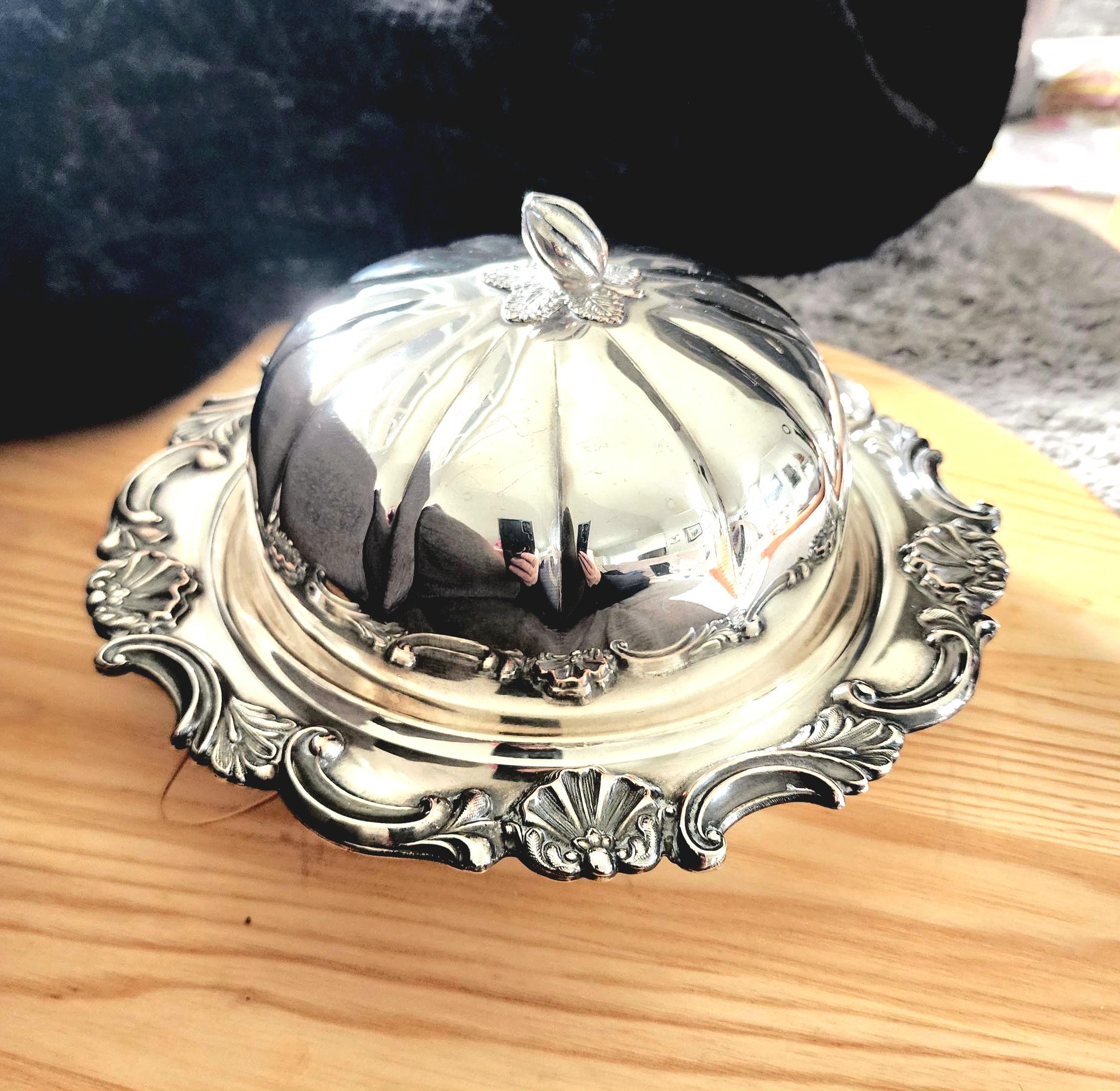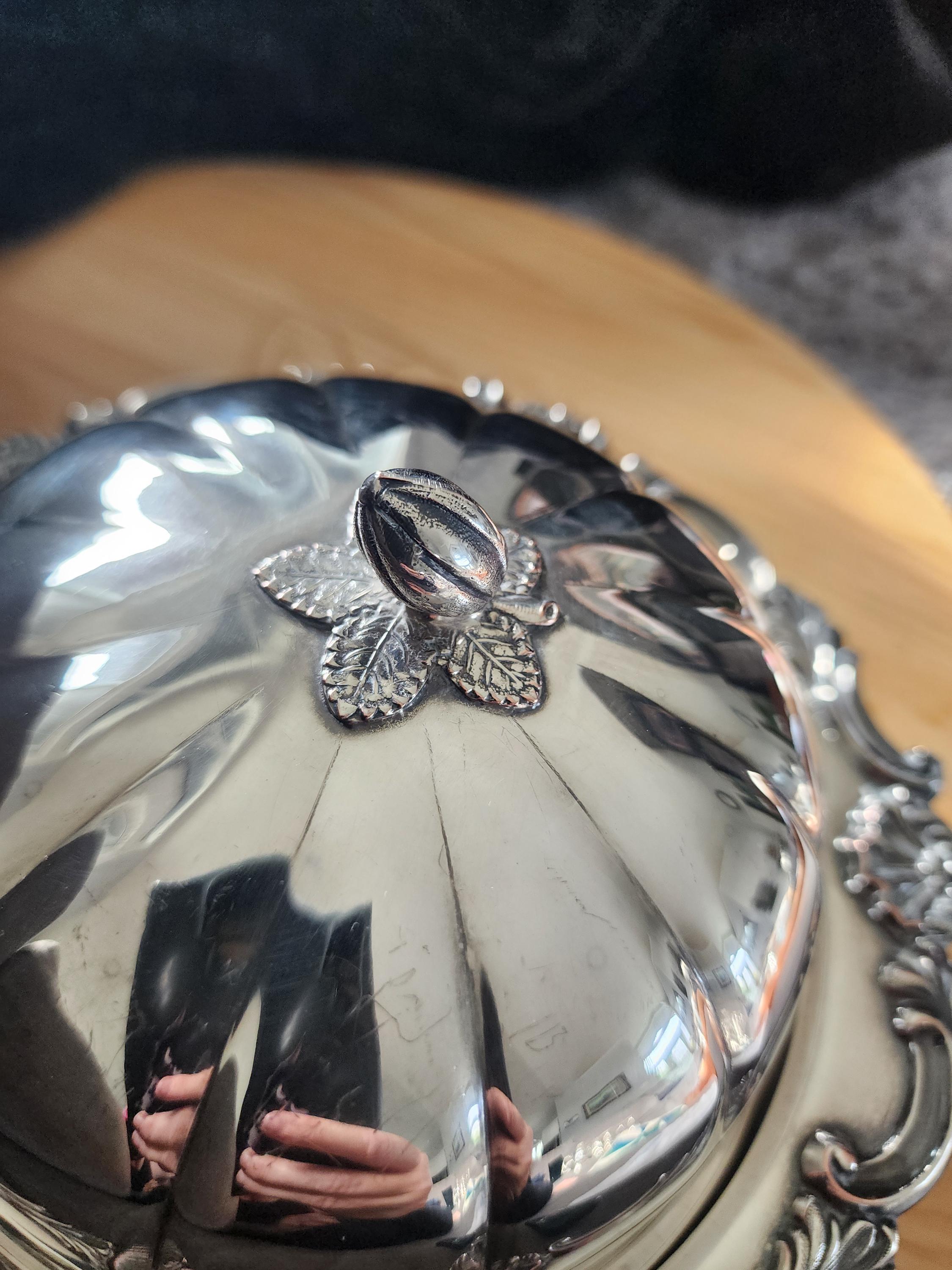 Crafted in lustrous silver plate, this elegant serving piece features an ornate Rococo border adorned with graceful scrolls and shell motifs. Lift the gleaming dome lid, crowned with a delicate leaf-and-bud finial, to reveal the original removable egg insert — designed to hold four eggs in perfect symmetry.