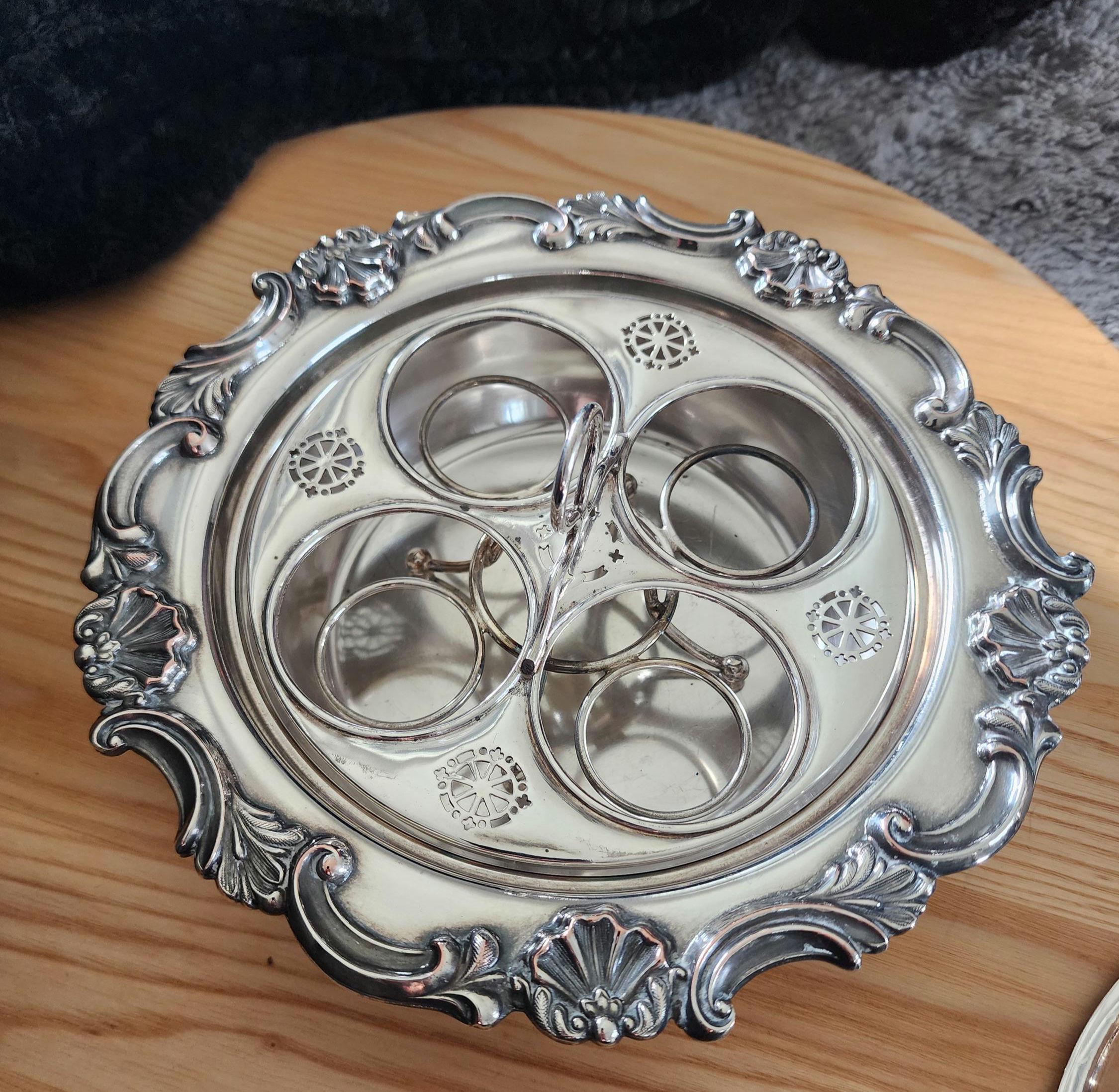 Bring a touch of old-world English charm to your breakfast table with this exquisite vintage Sheffield Reproduction egg cruet set.