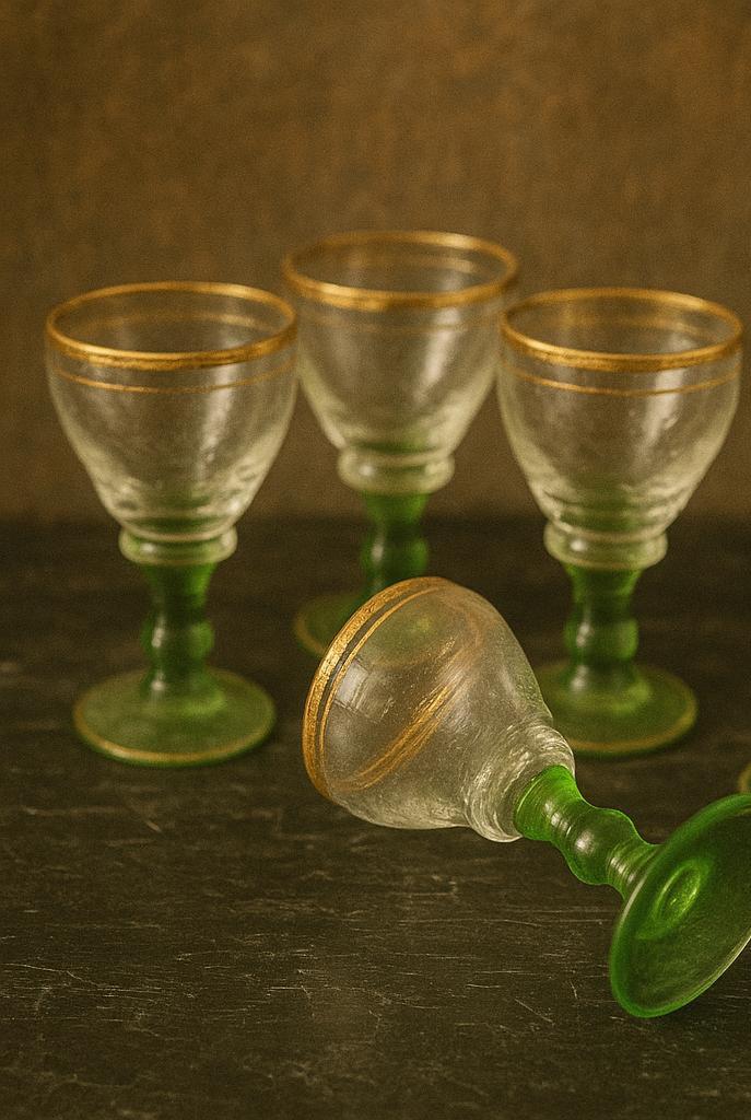 Elegant vintage cordial glasses featuring a clear bowl, rich emerald green stem, and gold rim accents. A timeless mid-century design that adds a touch of sophistication to any bar or table setting.