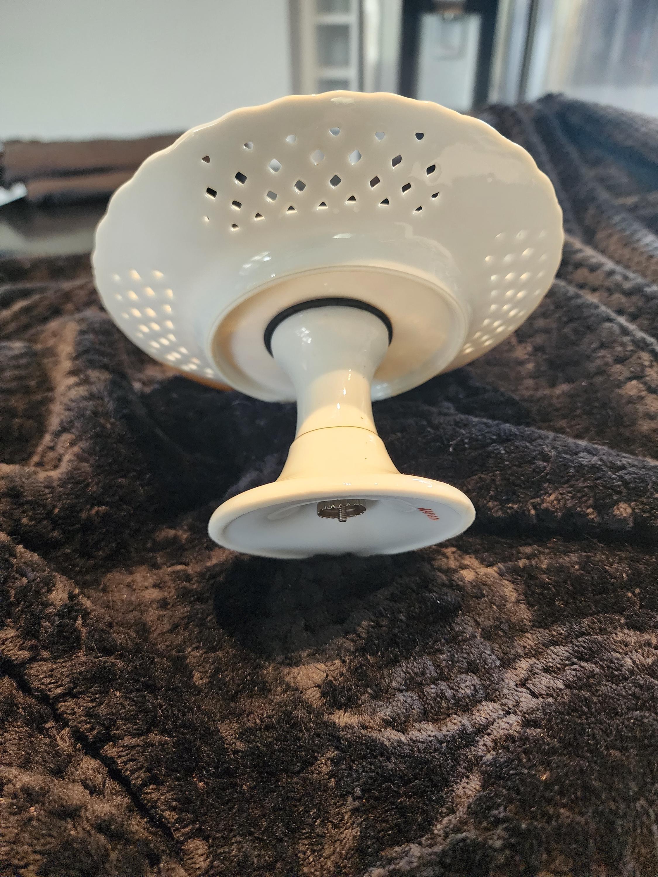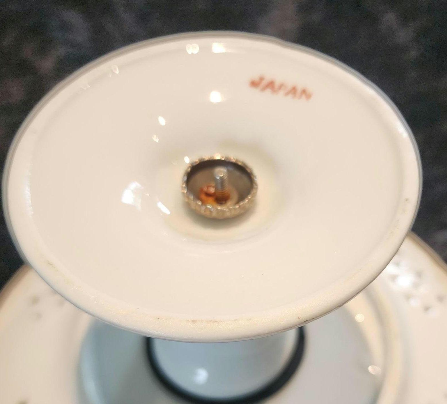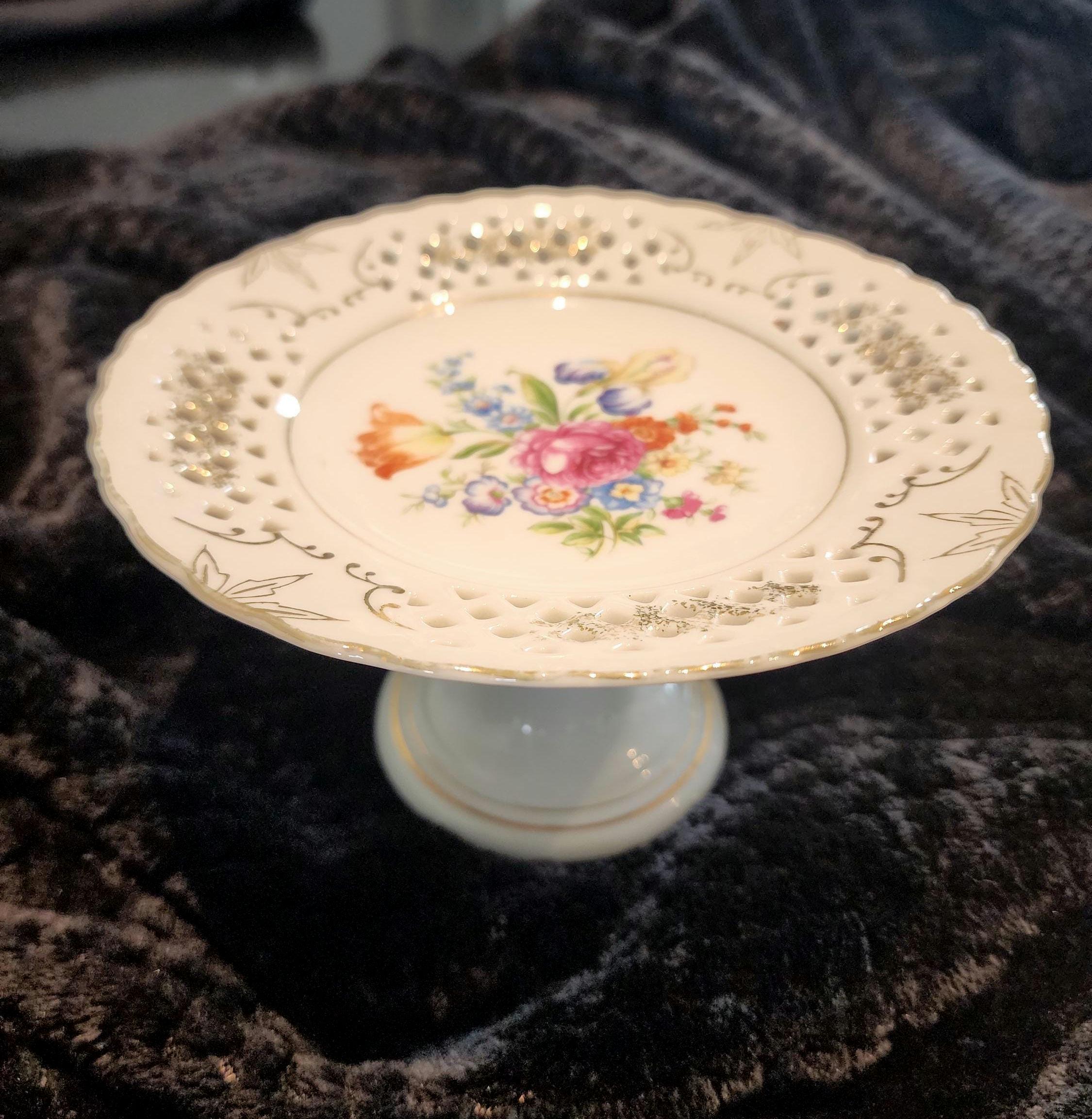 This beautiful vintage porcelain pedestal compote from Japan features a delicate reticulated (pierced) rim with a vibrant floral centerpiece and elegant gold trim accents.