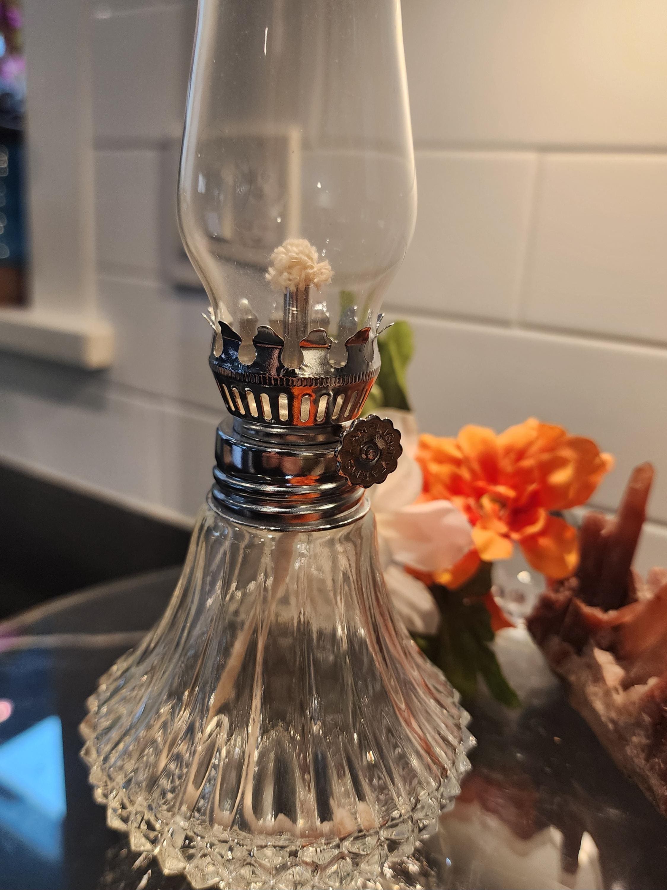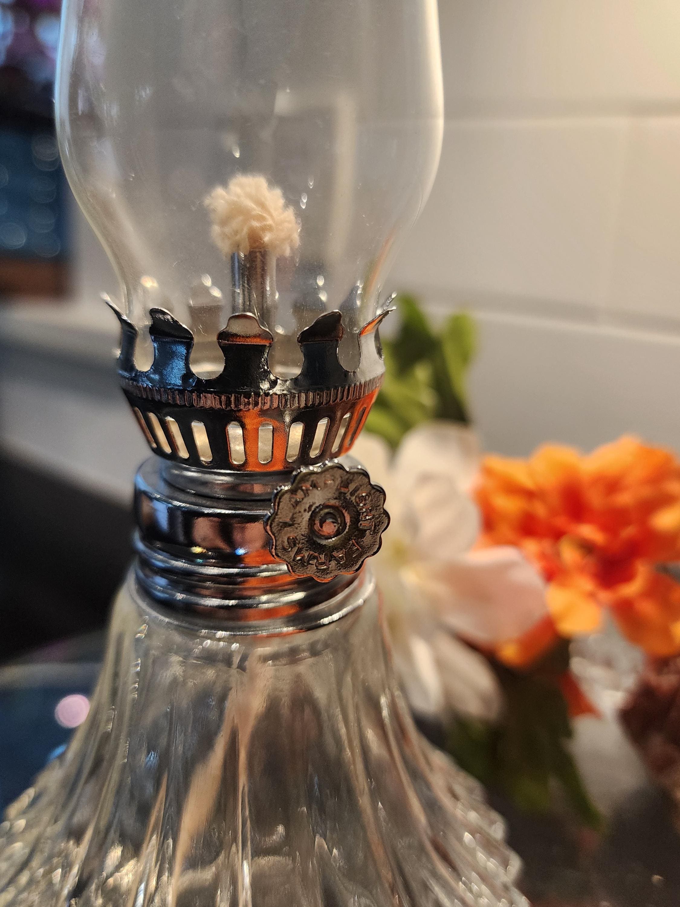 This lovely vintage-style clear glass mini oil lamp is in mint, never-used condition — a charming collectible with timeless appeal.
