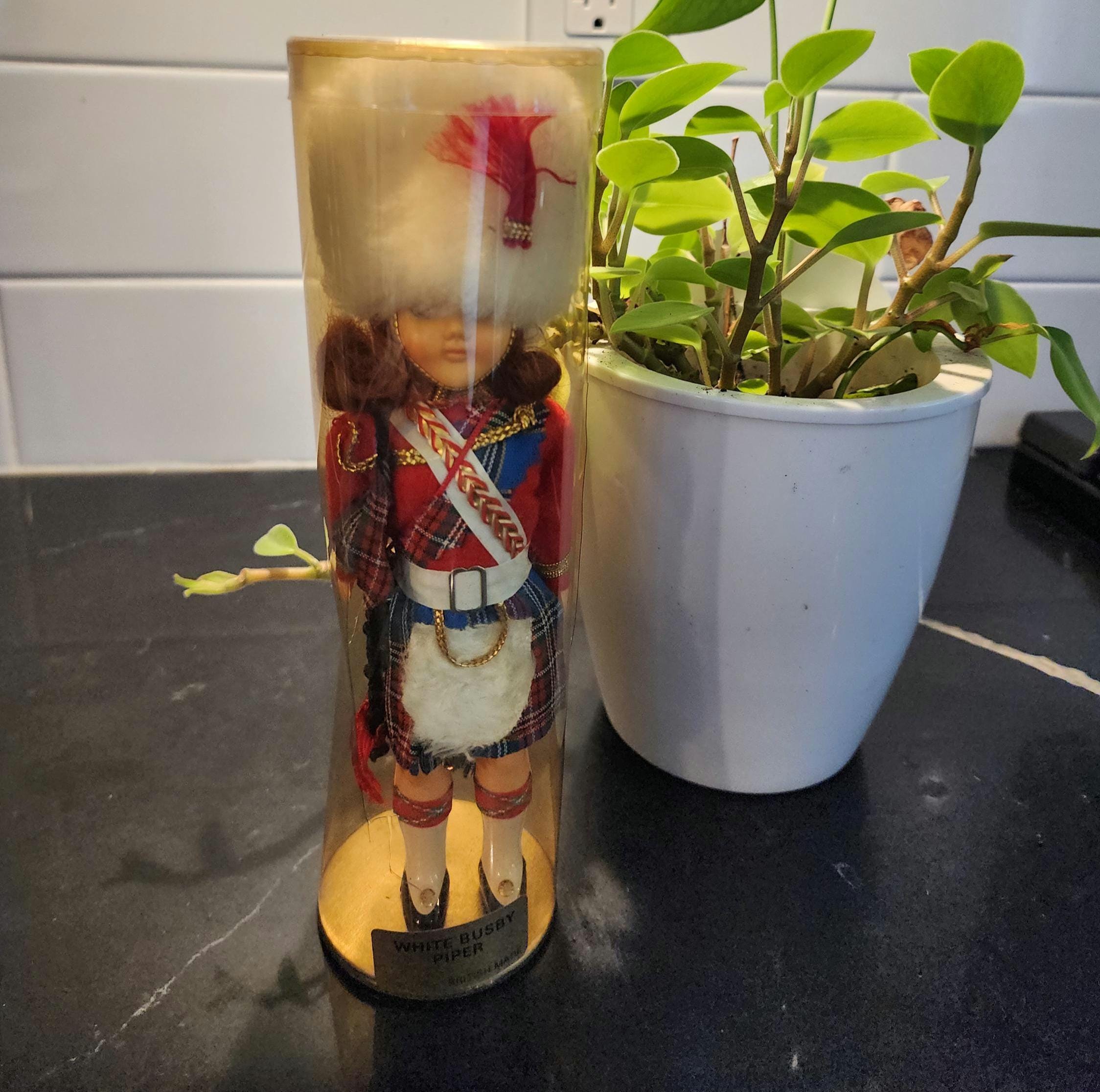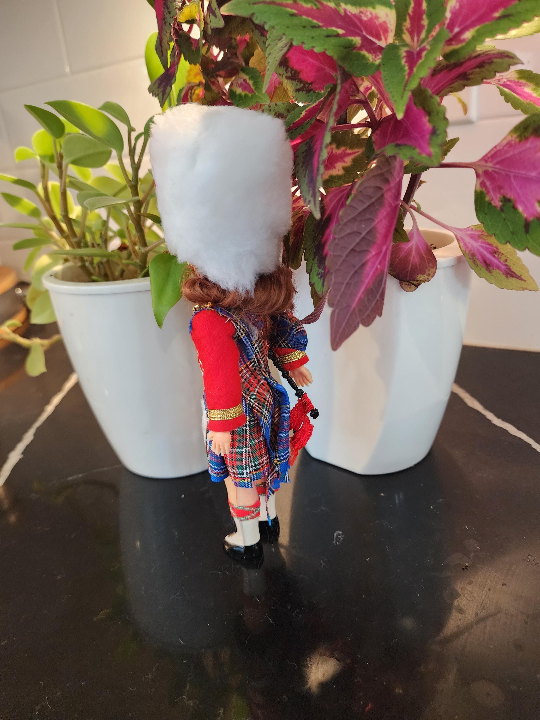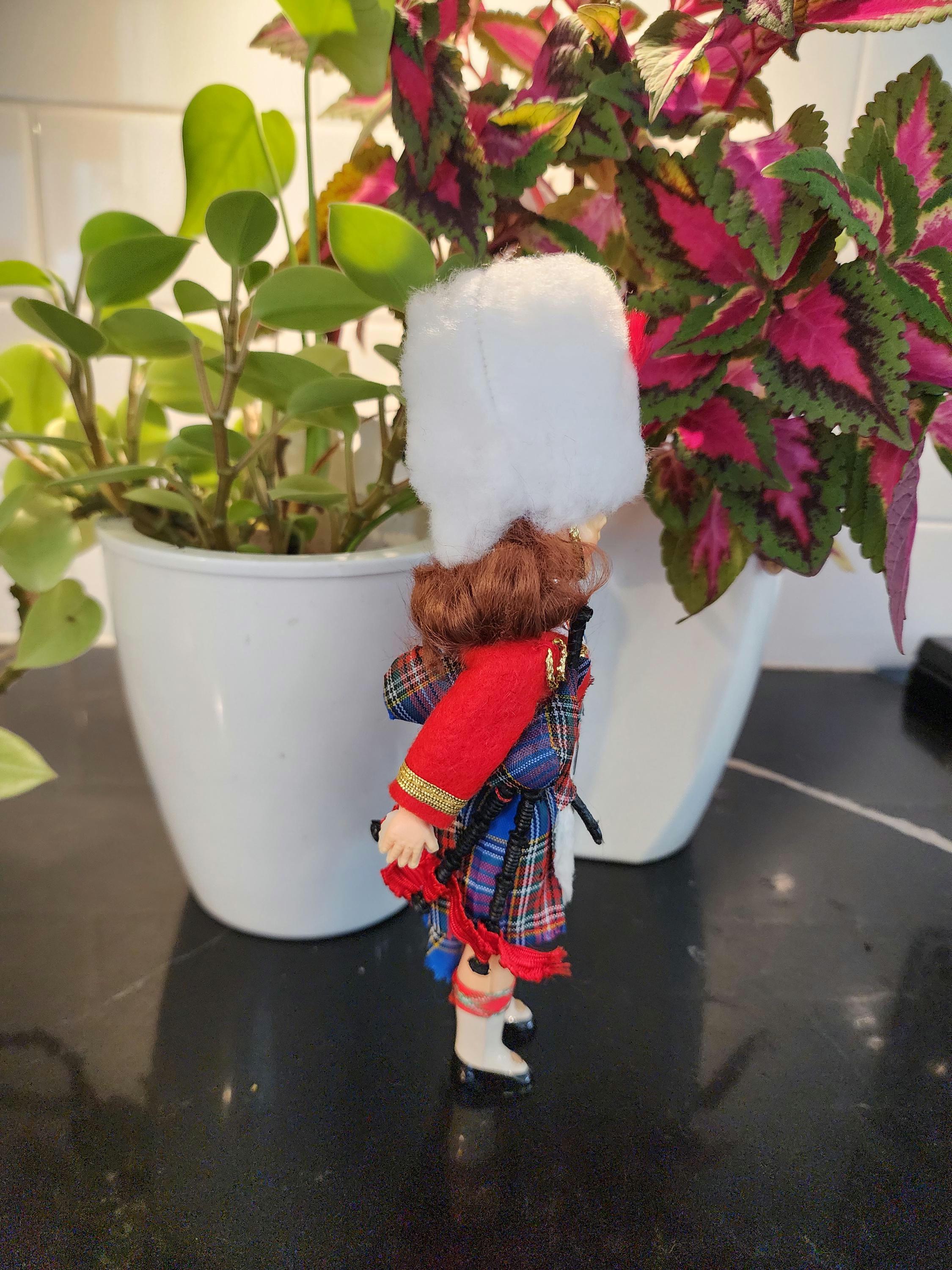 Step back in time with this delightful vintage Scottish souvenir doll, the White Busby Piper, dressed in a beautifully detailed Highland piper uniform.
