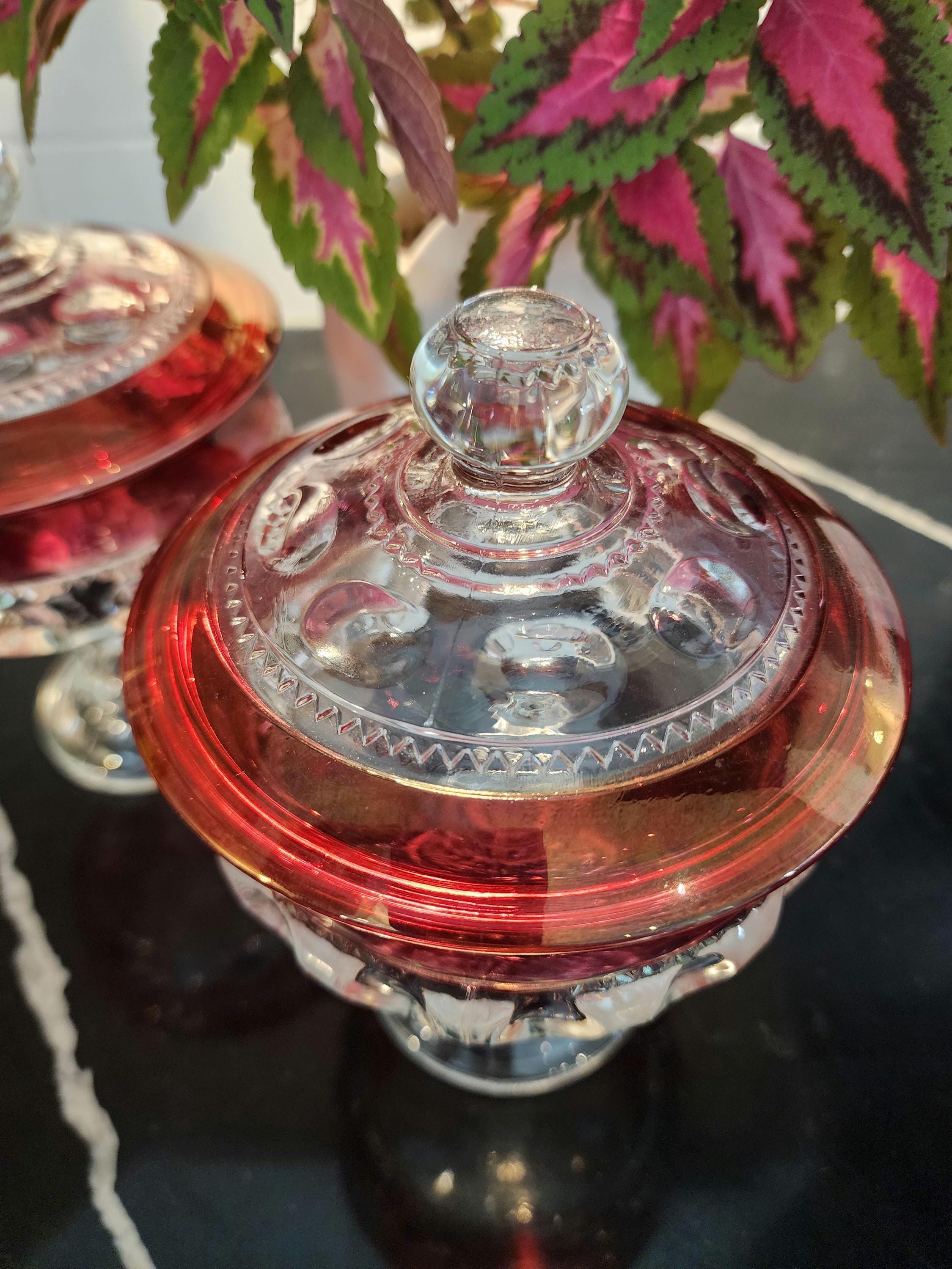 This stunning vintage Indiana Glass “Kings Crown” compote with lid dates to the late 1940s–early 1950s and features the classic thumbprint band design with a rich ruby flashed rim over clear pressed glass.