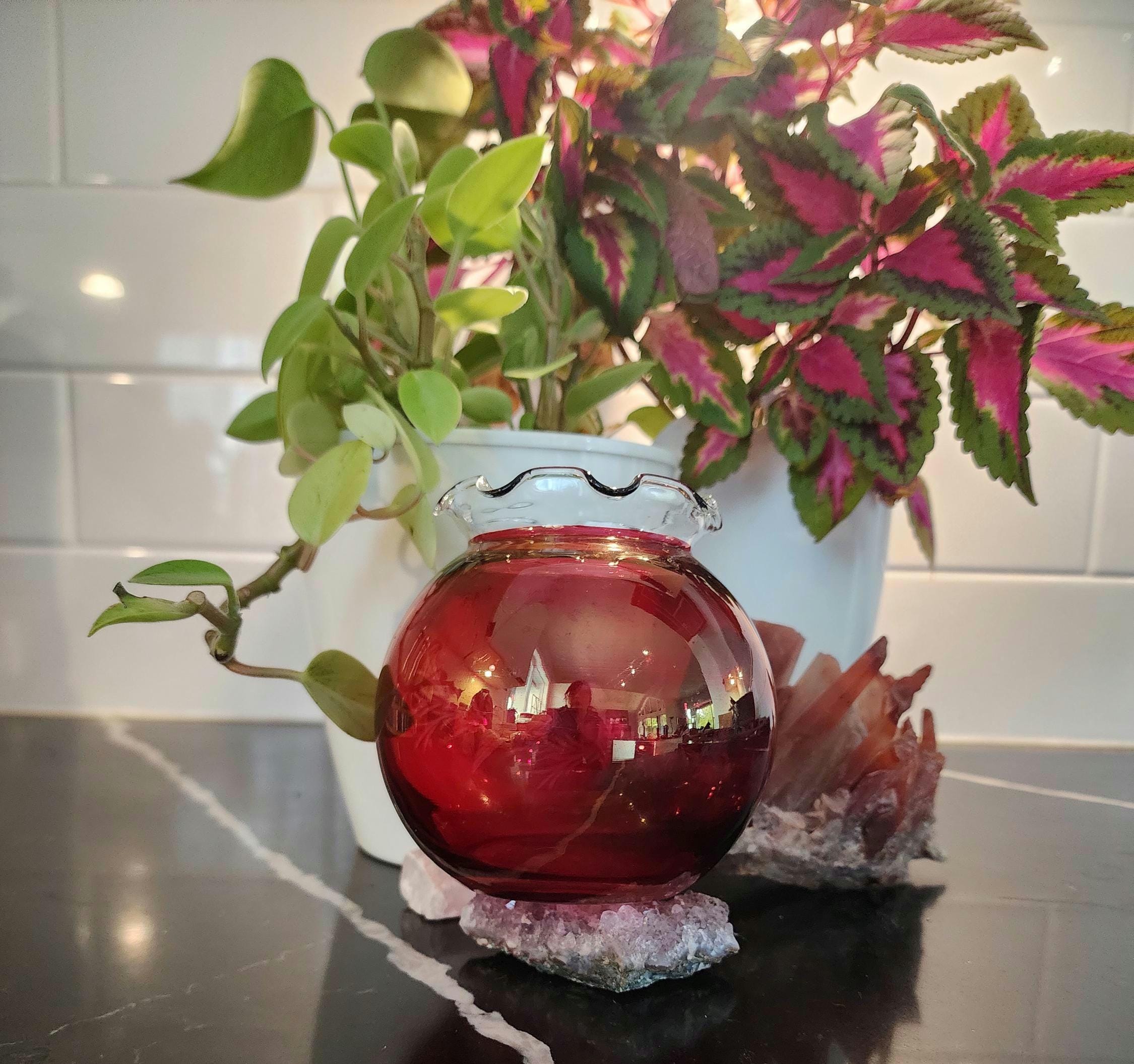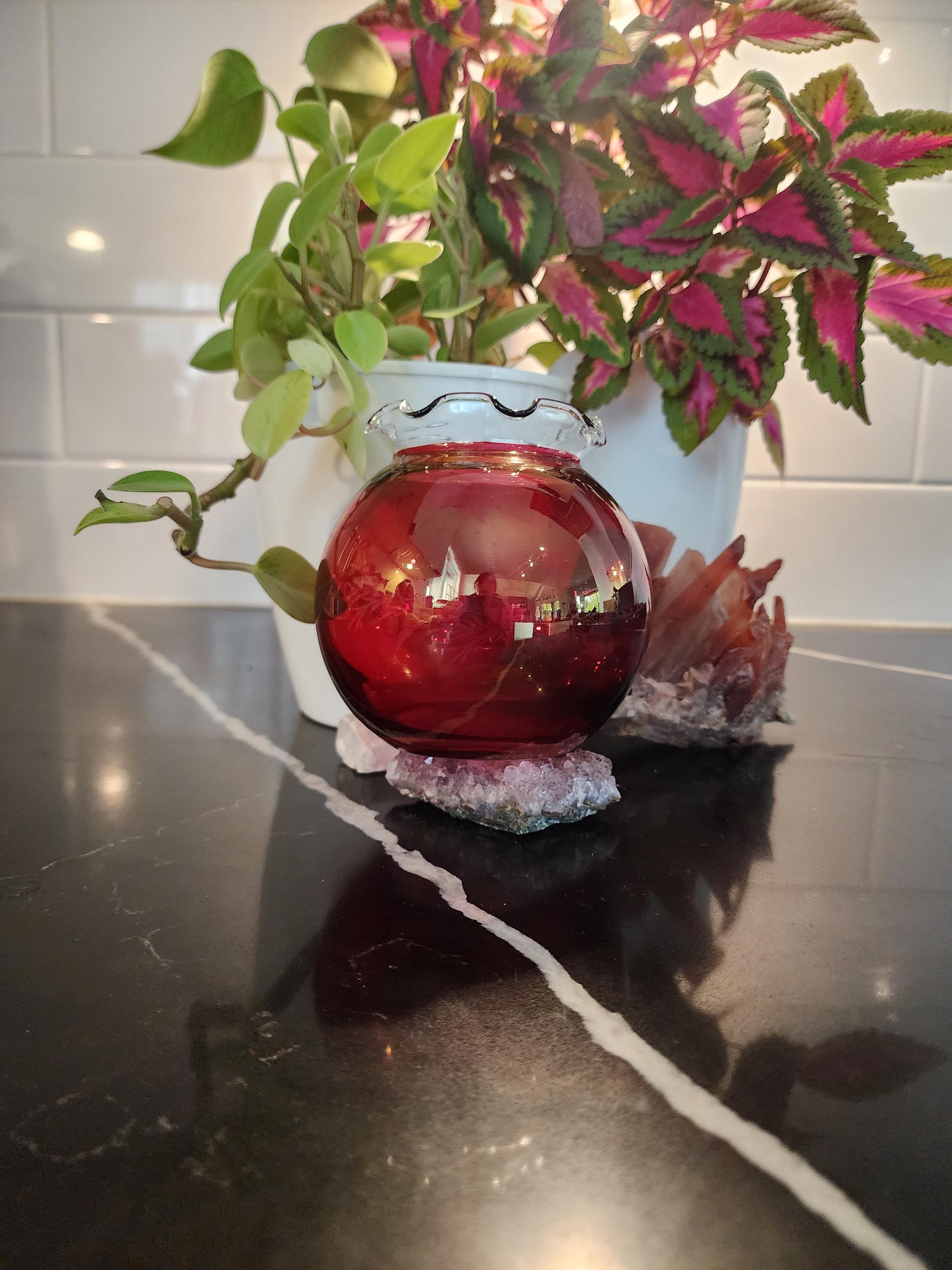 Color: Ruby red with clear ruffled rim