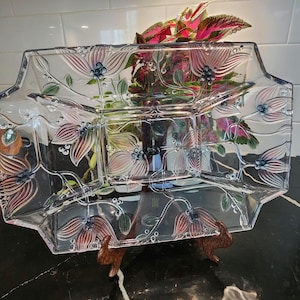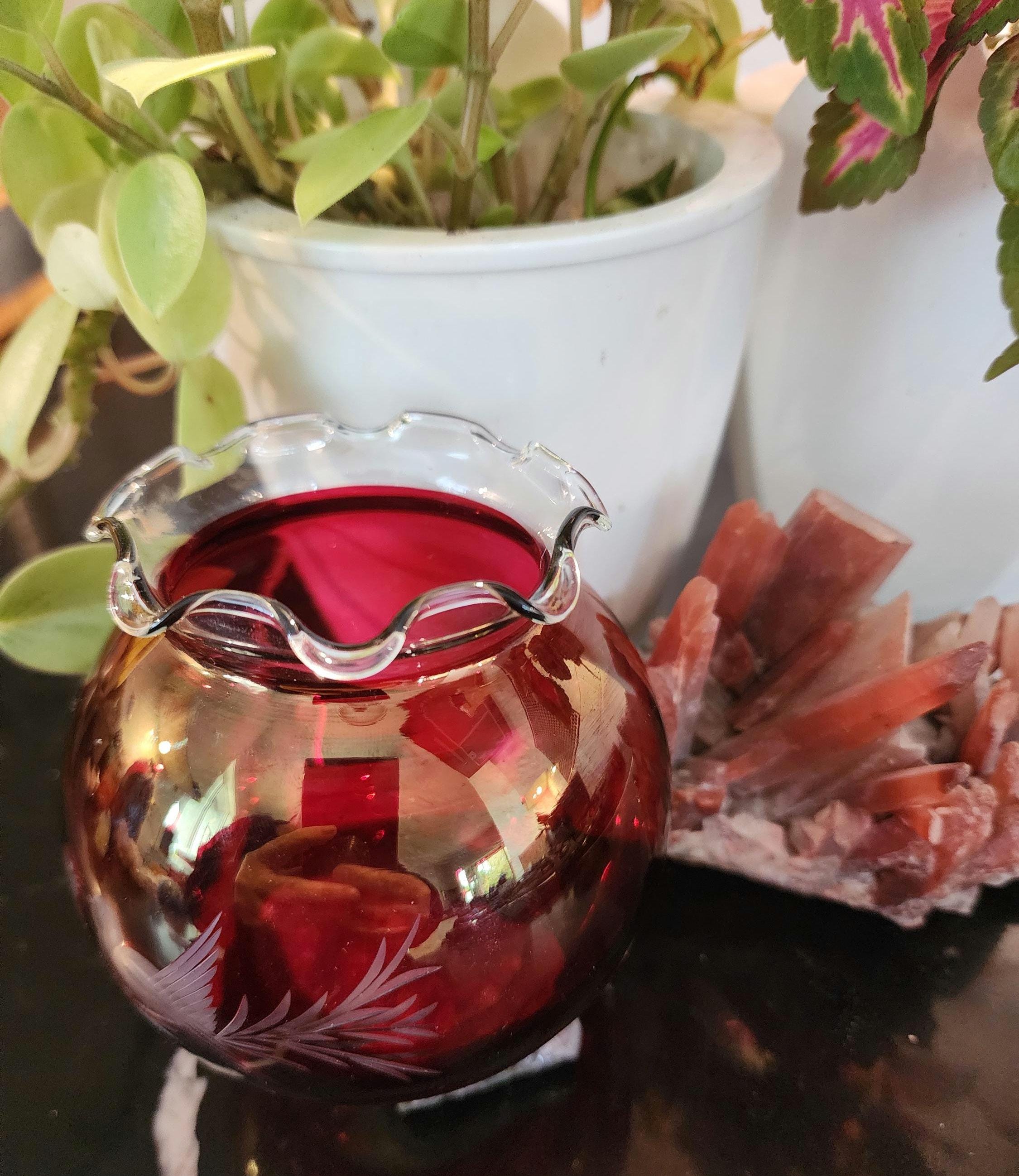 This vintage ruby red hand-blown rose bowl features beautiful etched birds and foliage on a radiant cranberry body. The clear ruffled rim and rich color give it an elegant glow when placed in natural light.