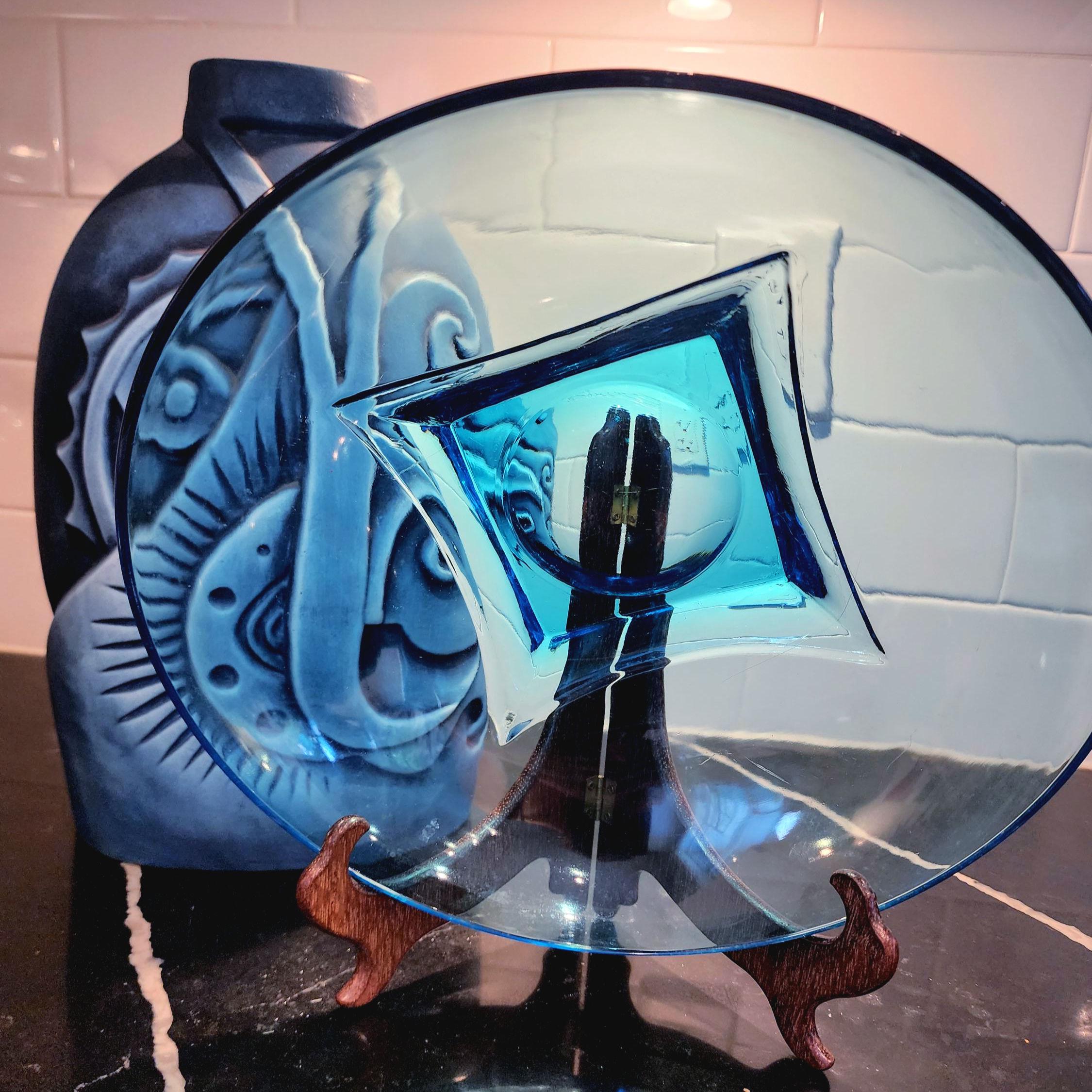 This vintage aqua blue art glass bowl is a show-stopping mid-century modern piece that brings color, weight, and elegance to any space.