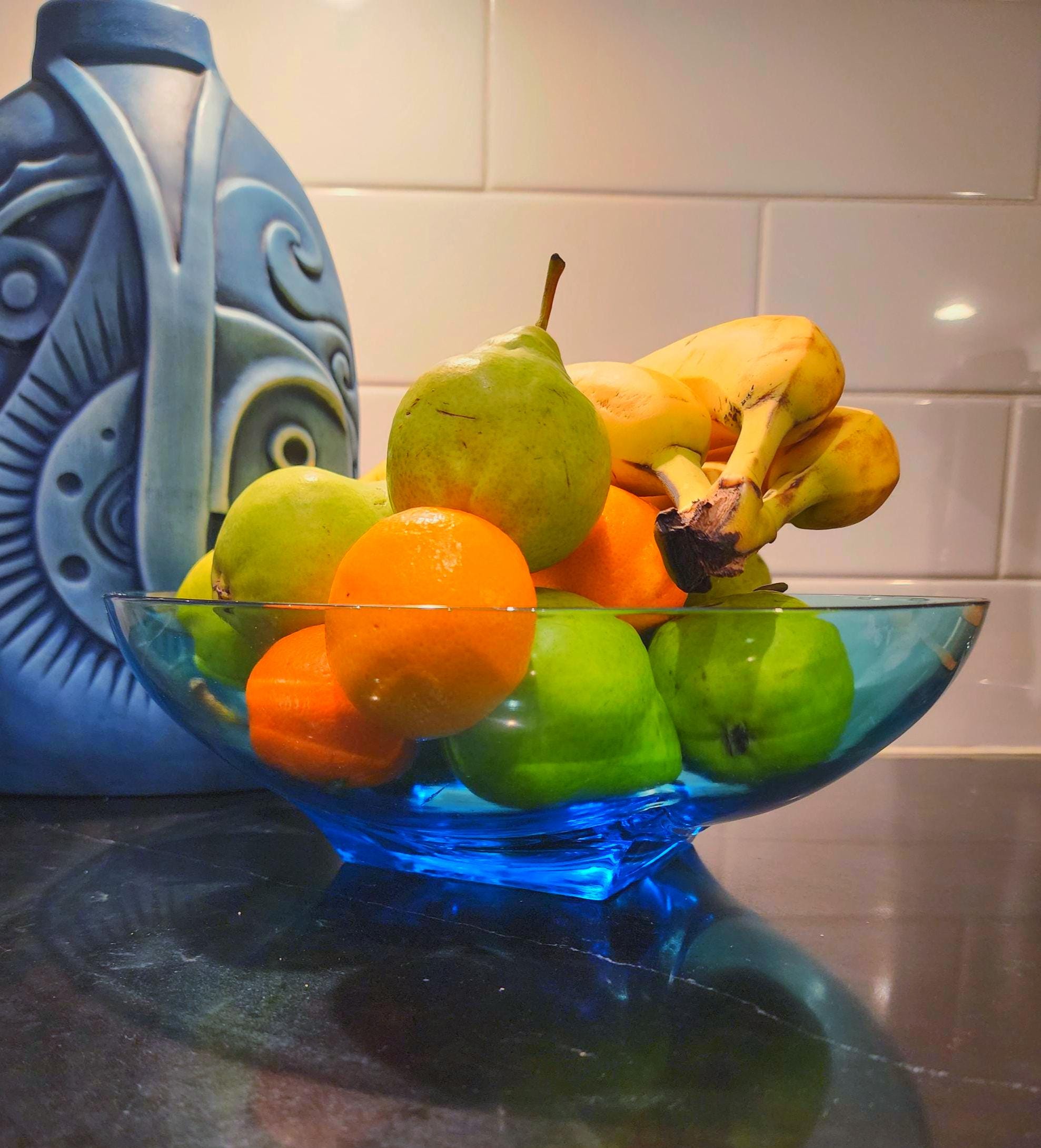 With its thick, light-catching base that gently thins toward the rim, it showcases the refined look of hand-blown craftsmanship. The square pedestal design glows beautifully in sunlight — perfect as a fruit bowl, centerpiece, or collectible display for any vintage lover.