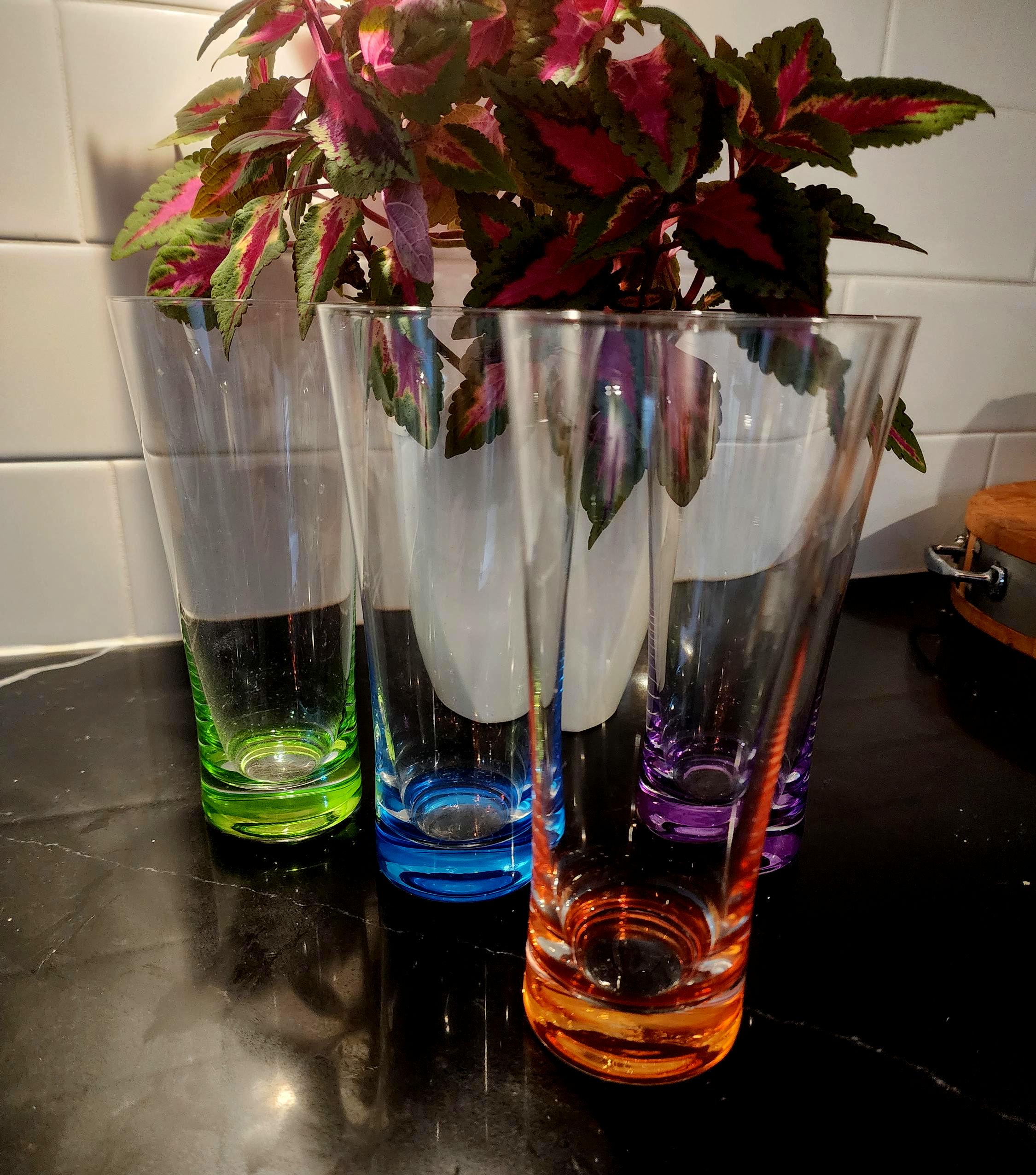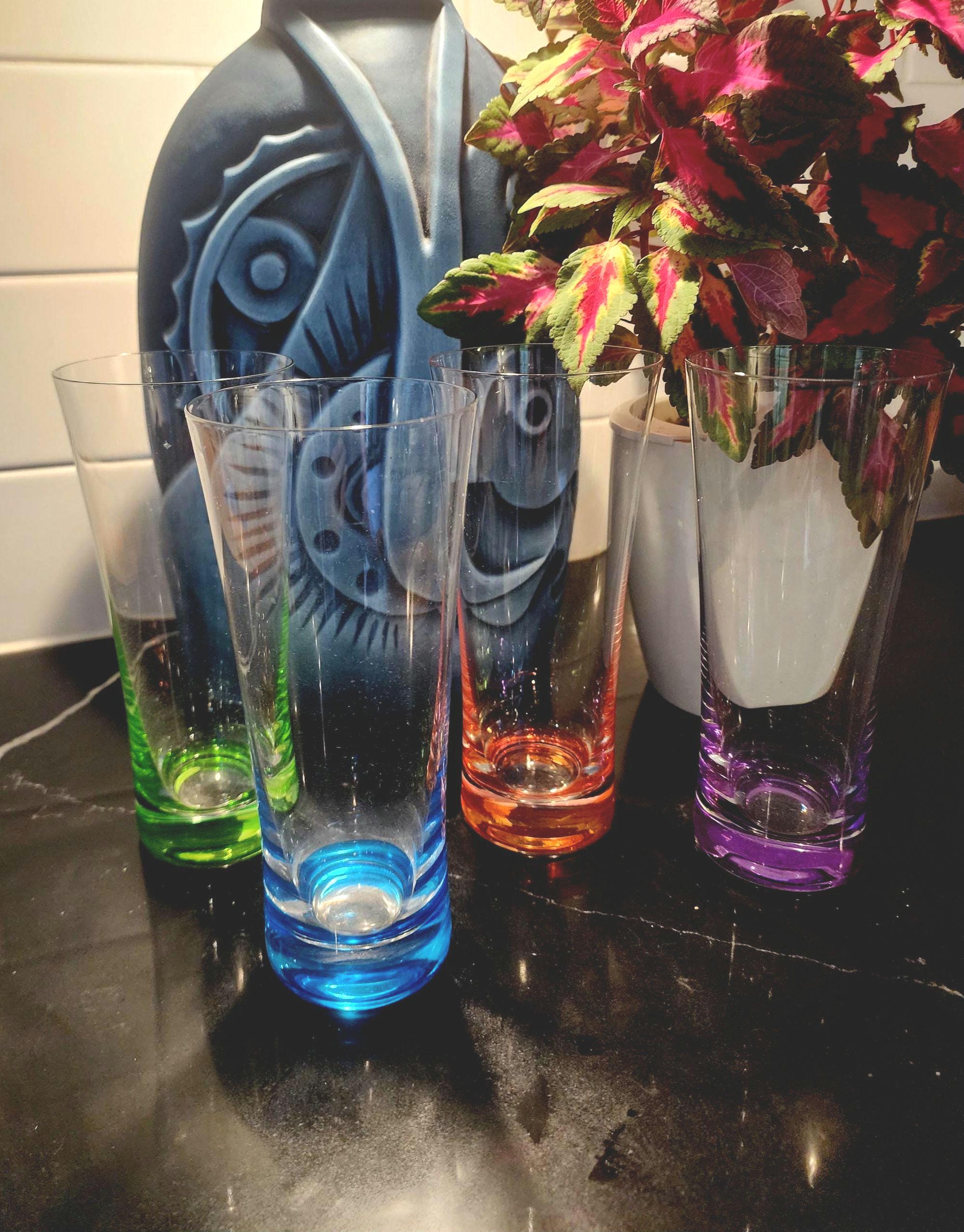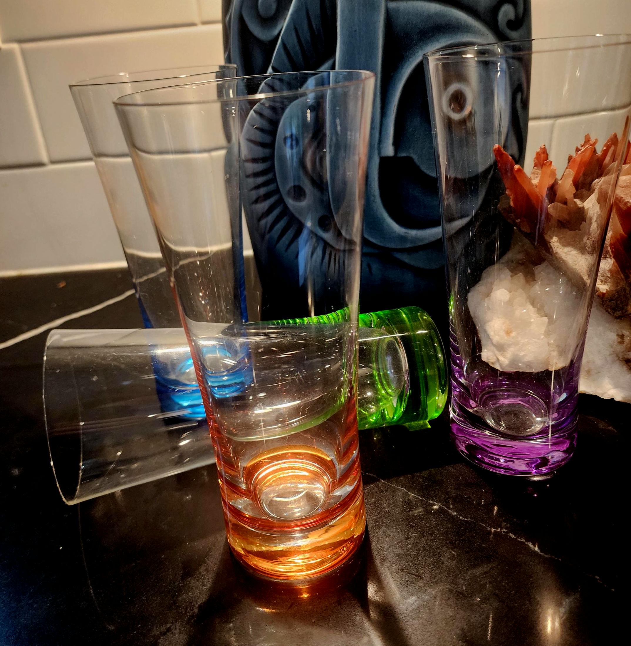 Add a splash of color and retro charm to your table with this set of 4 vibrant highball glasses in perfect condition! Each clear glass features a thick, weighted colored base — in green, blue, purple, and orange — that glows beautifully when light hits.