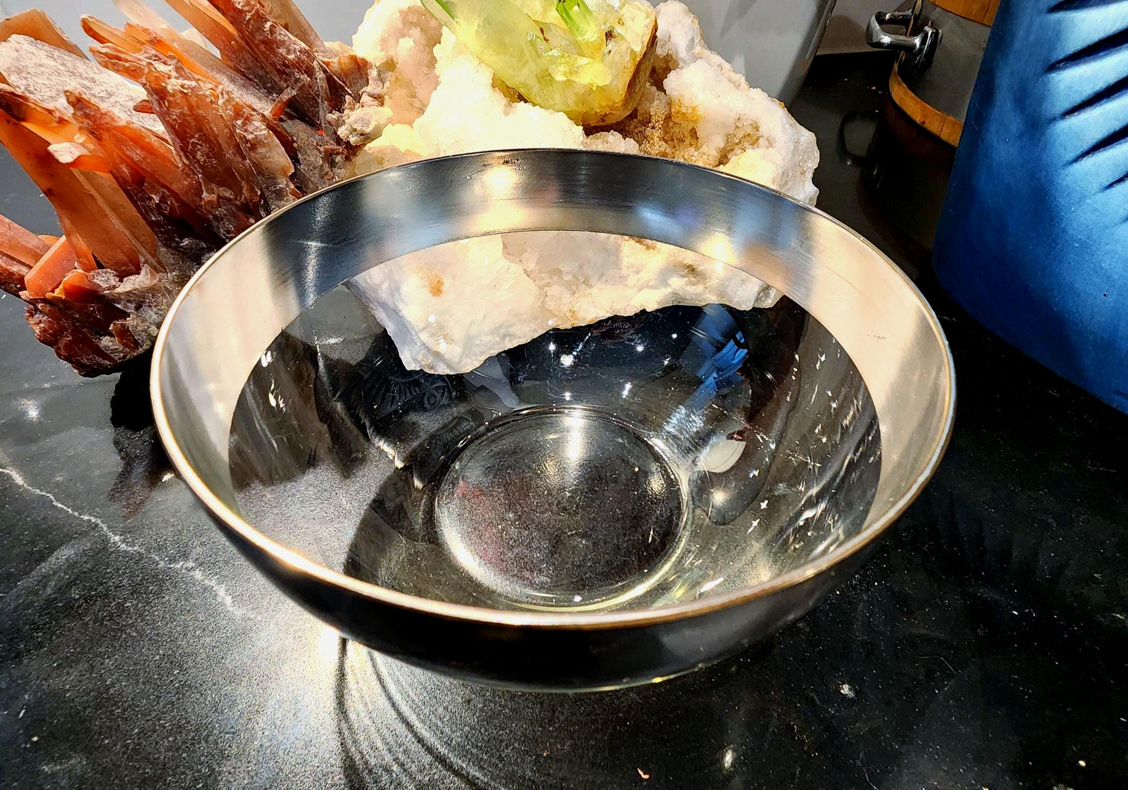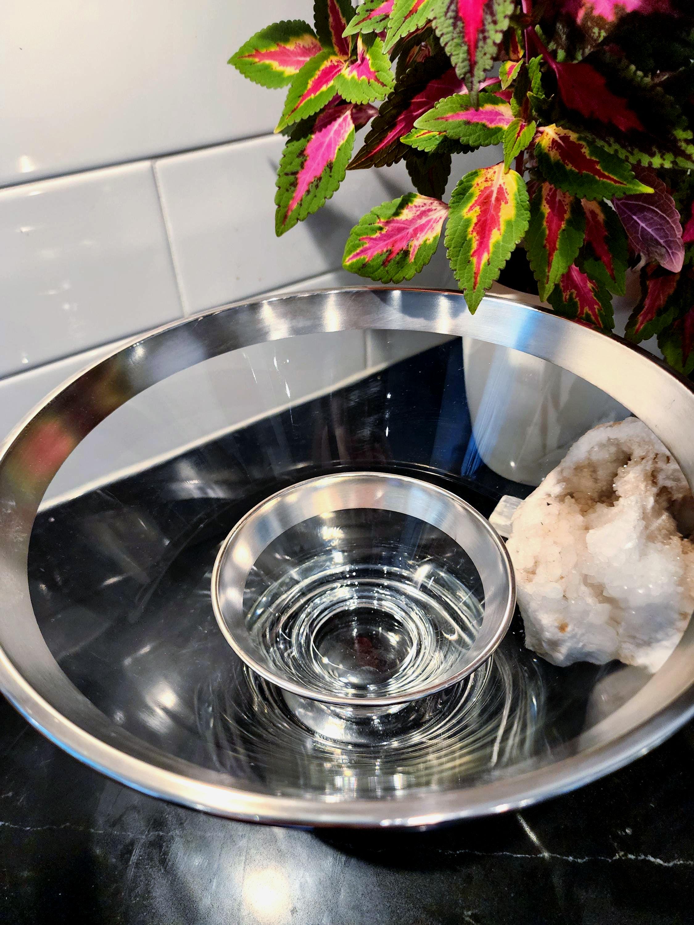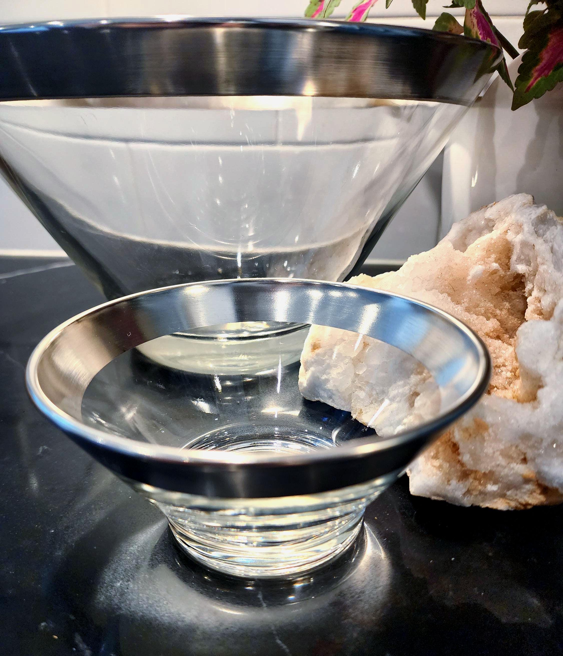 Originally designed with a metal hanger to suspend the smaller bowl above the larger one (not included), this set still shines on its own — perfect for chips, dips, fruit, or as a timeless centerpiece for your next gathering 🍸
