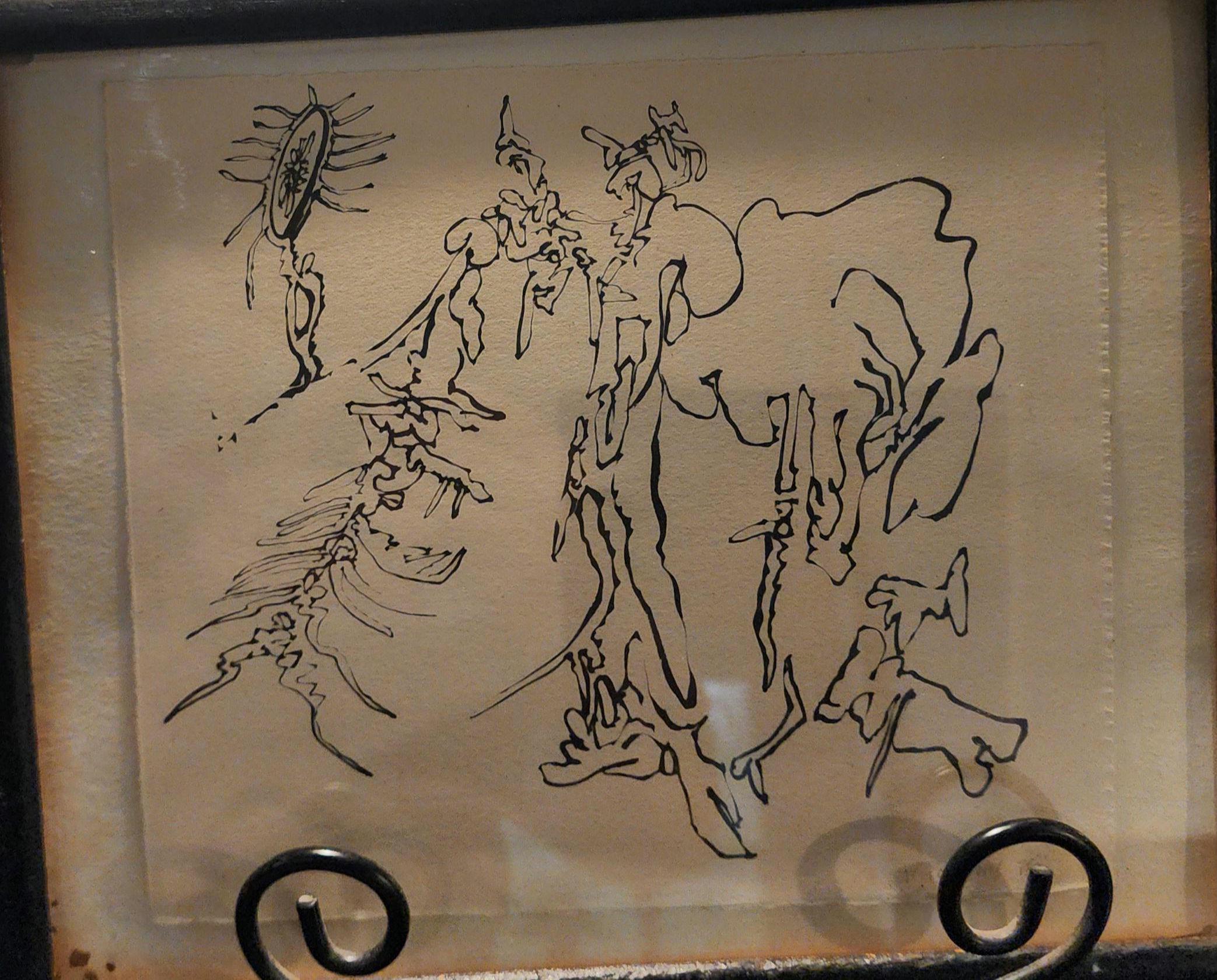 Rendered in bold yet graceful lines on heavy artist-grade paper, the composition suggests movement, balance, and transformation — hallmarks of the surrealist and abstract experimentation that marked this period.