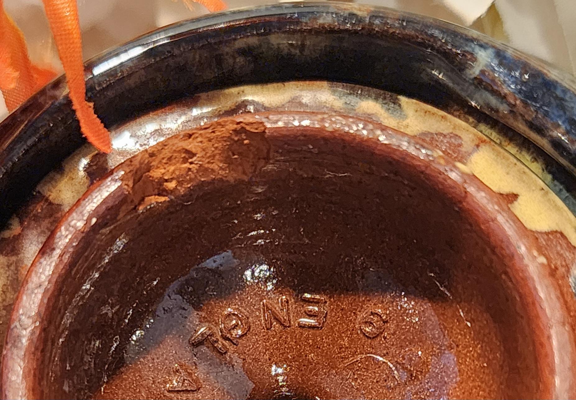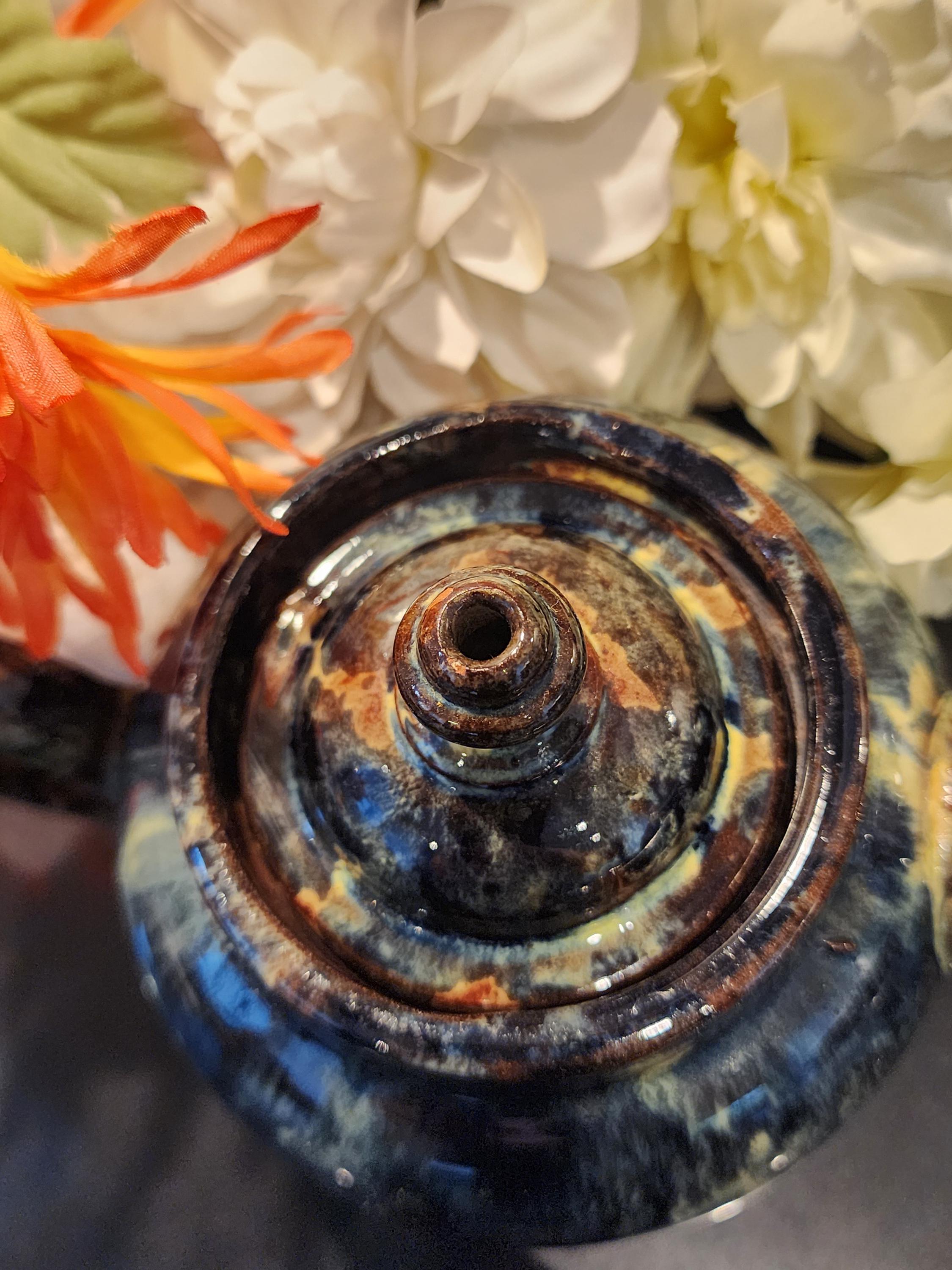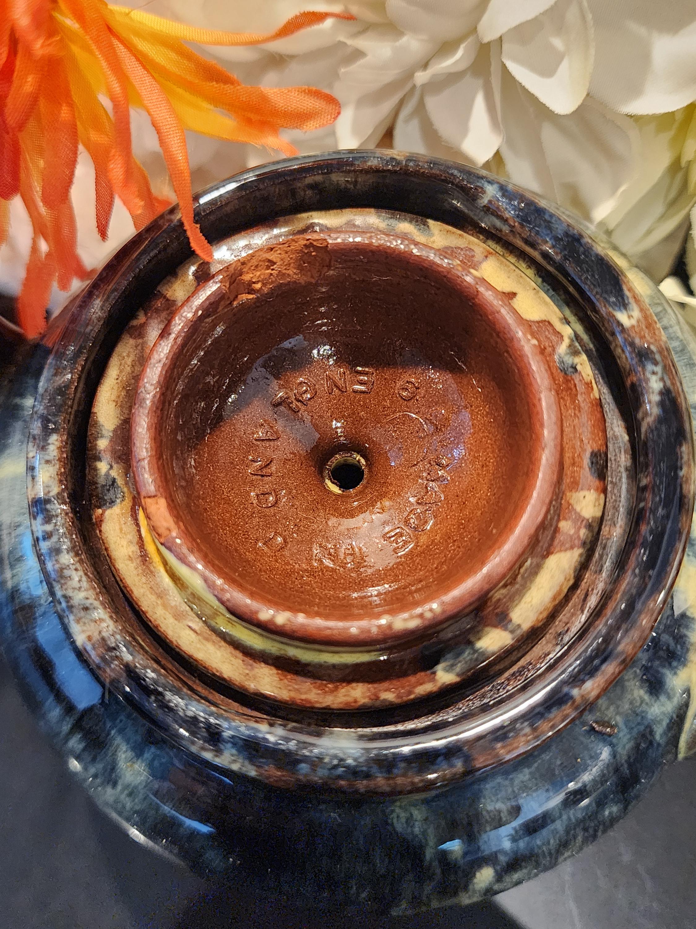 Finish: Multitone glossy drip glaze (navy, brown, cream)