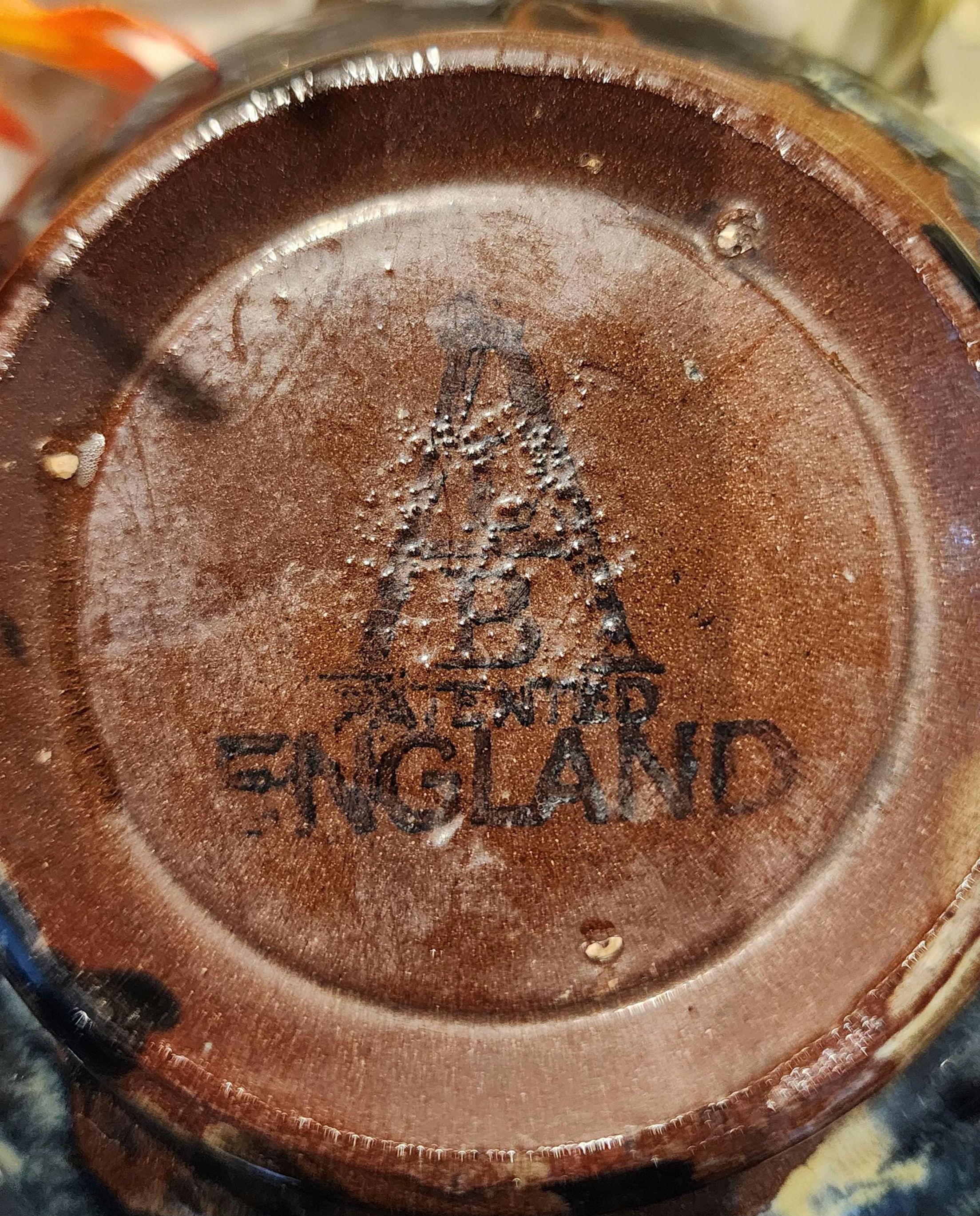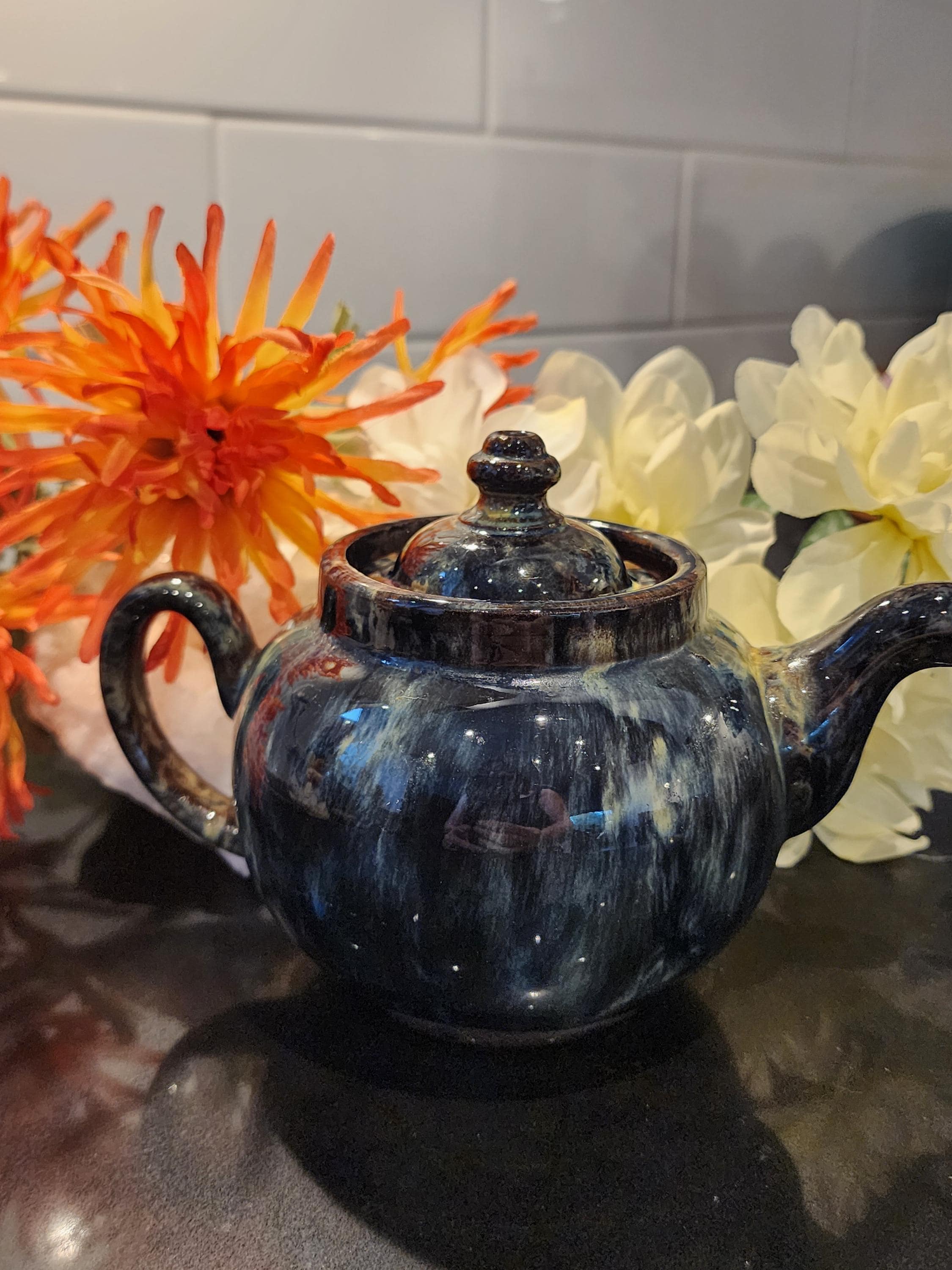 This handcrafted F.B.A. (F.B. Atkinson & Co.) teapot was made in England, featuring a beautifully rich, glossy drip-glaze that flows in deep tones of navy blue, brown, and cream. Each piece from this era was individually glazed, creating a one-of-a-kind marbled finish that looks stunning from every angle.