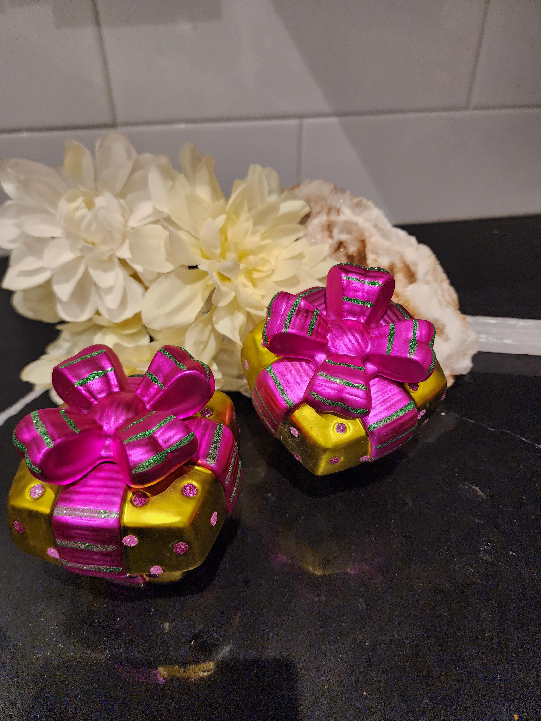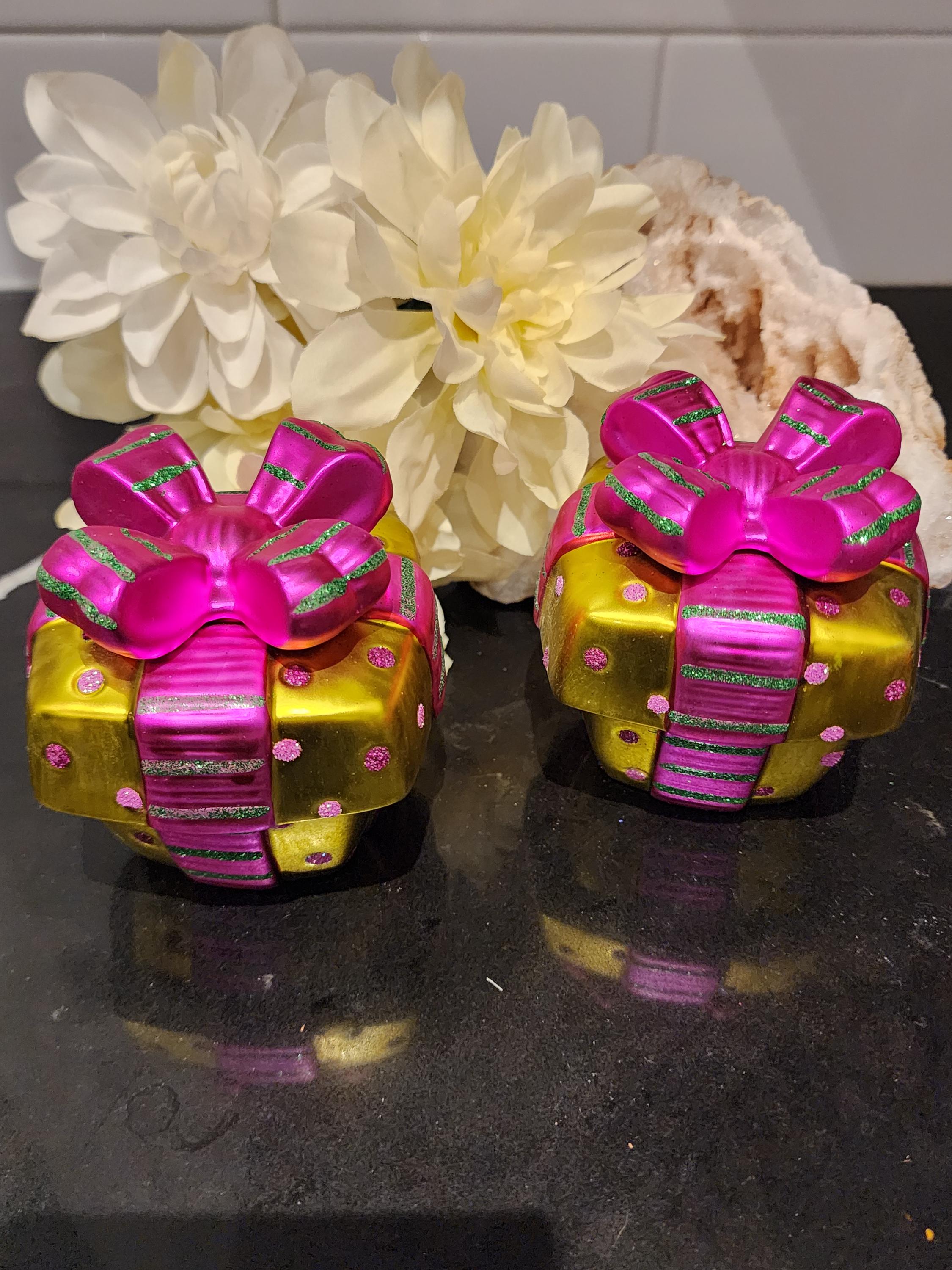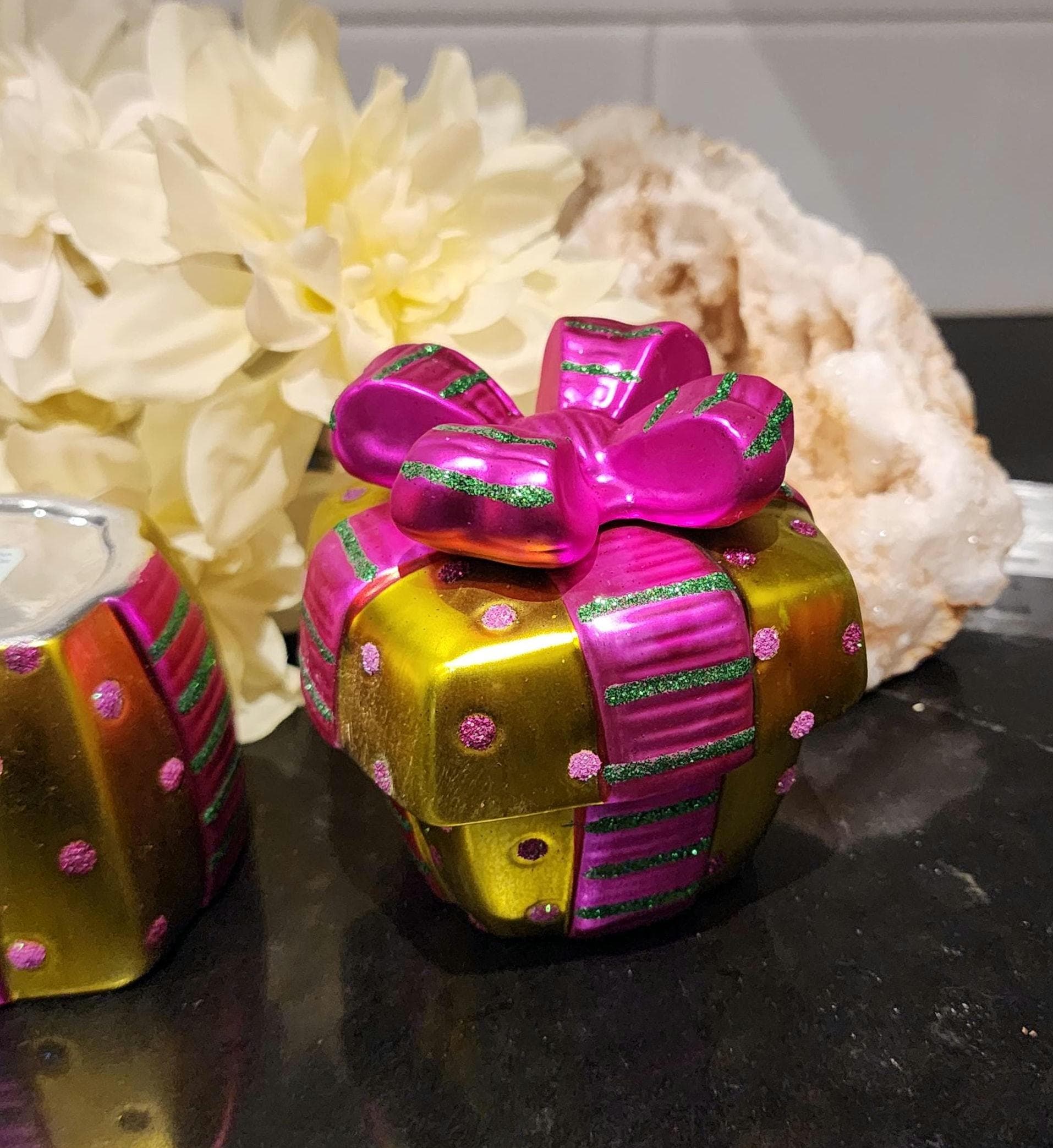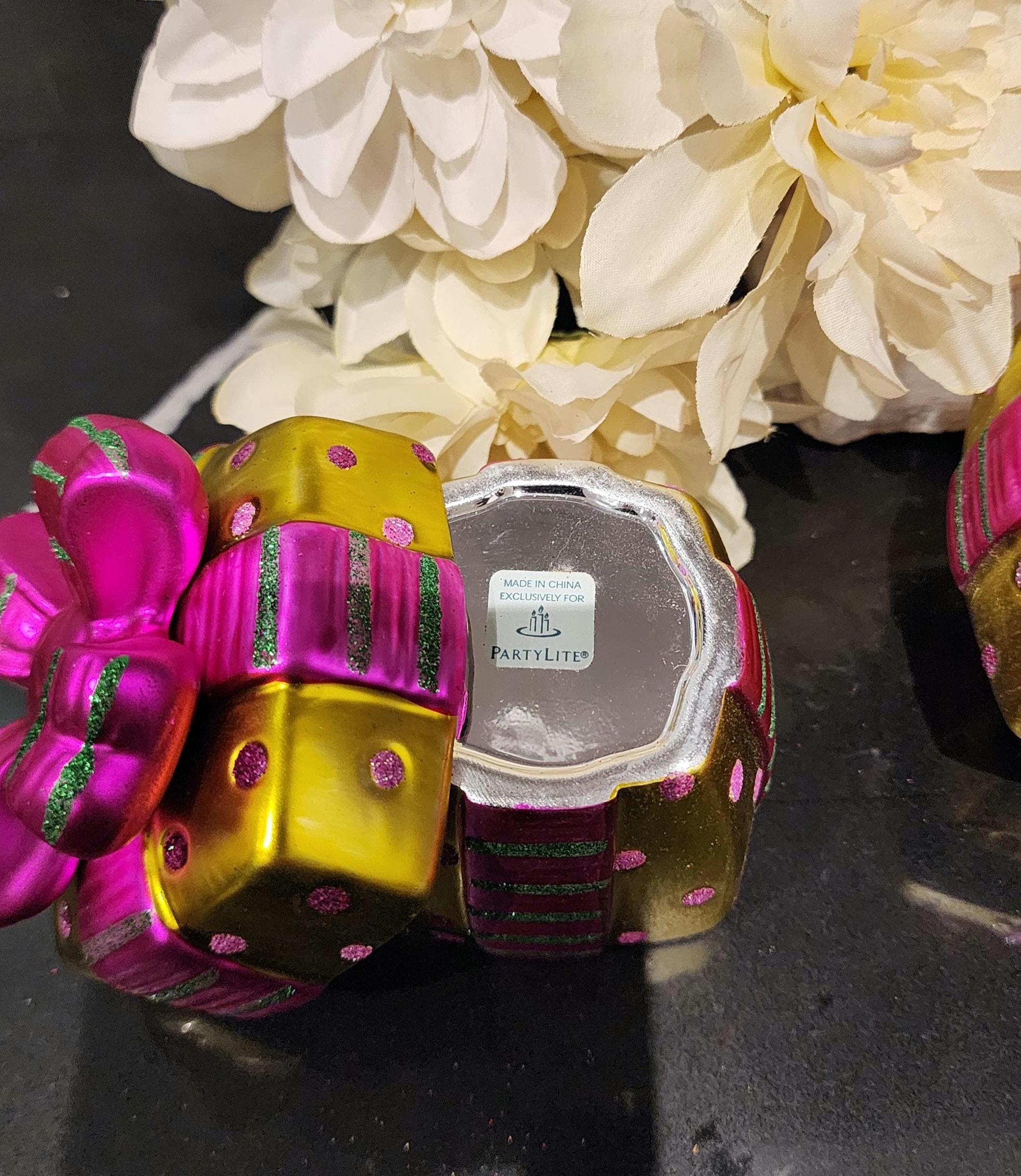 These Partylite Gift Box Tealight Holders add instant joy and sparkle to any décor. Each ceramic candle holder is hand-painted in vibrant metallic gold, finished with hot-pink bows and green glitter details for a cheerful, festive glow.