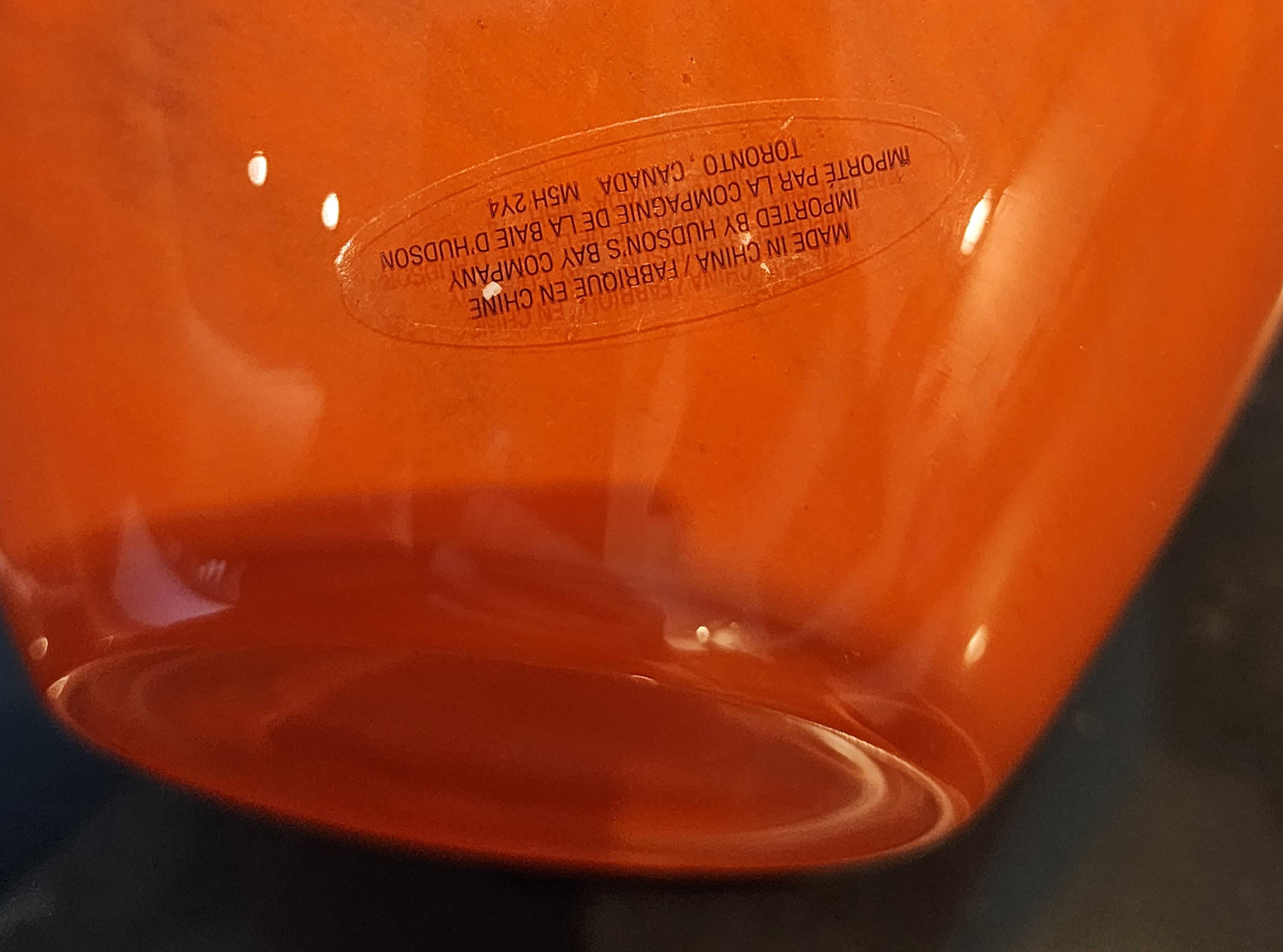 Crafted for the Hudson’s Bay Company (HBC) and now discontinued, it’s a wonderful example of late-1990s/early-2000s Canadian home décor. Each swirl and bubble is unique, showing the craftsmanship of hand-blown glass.