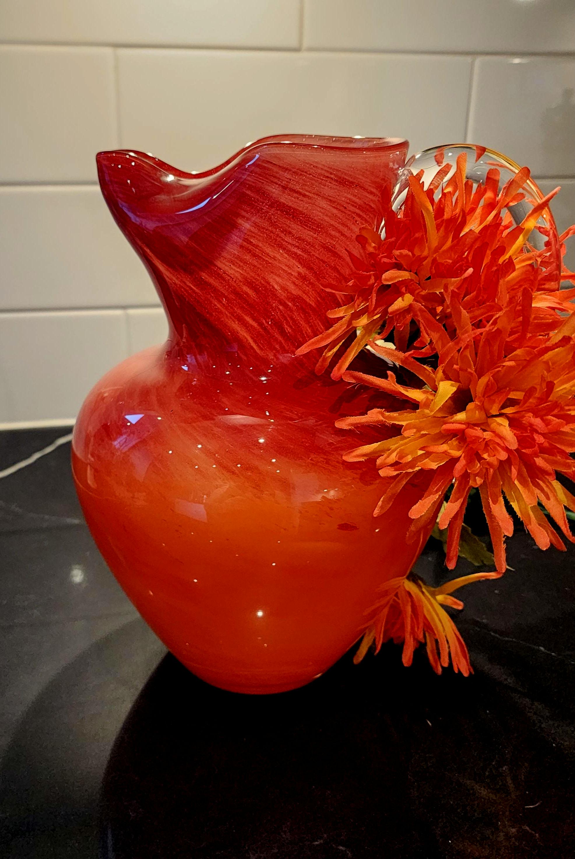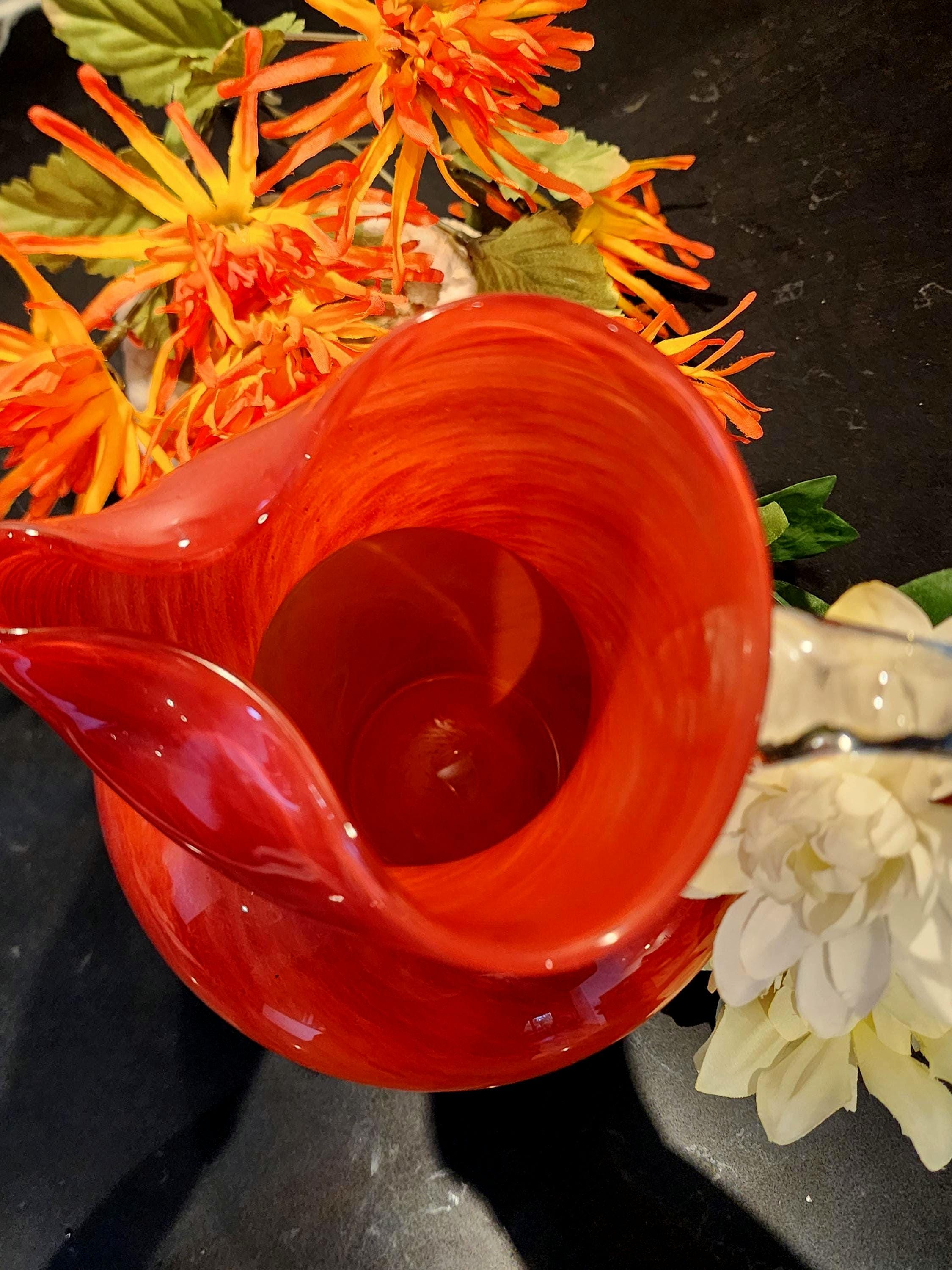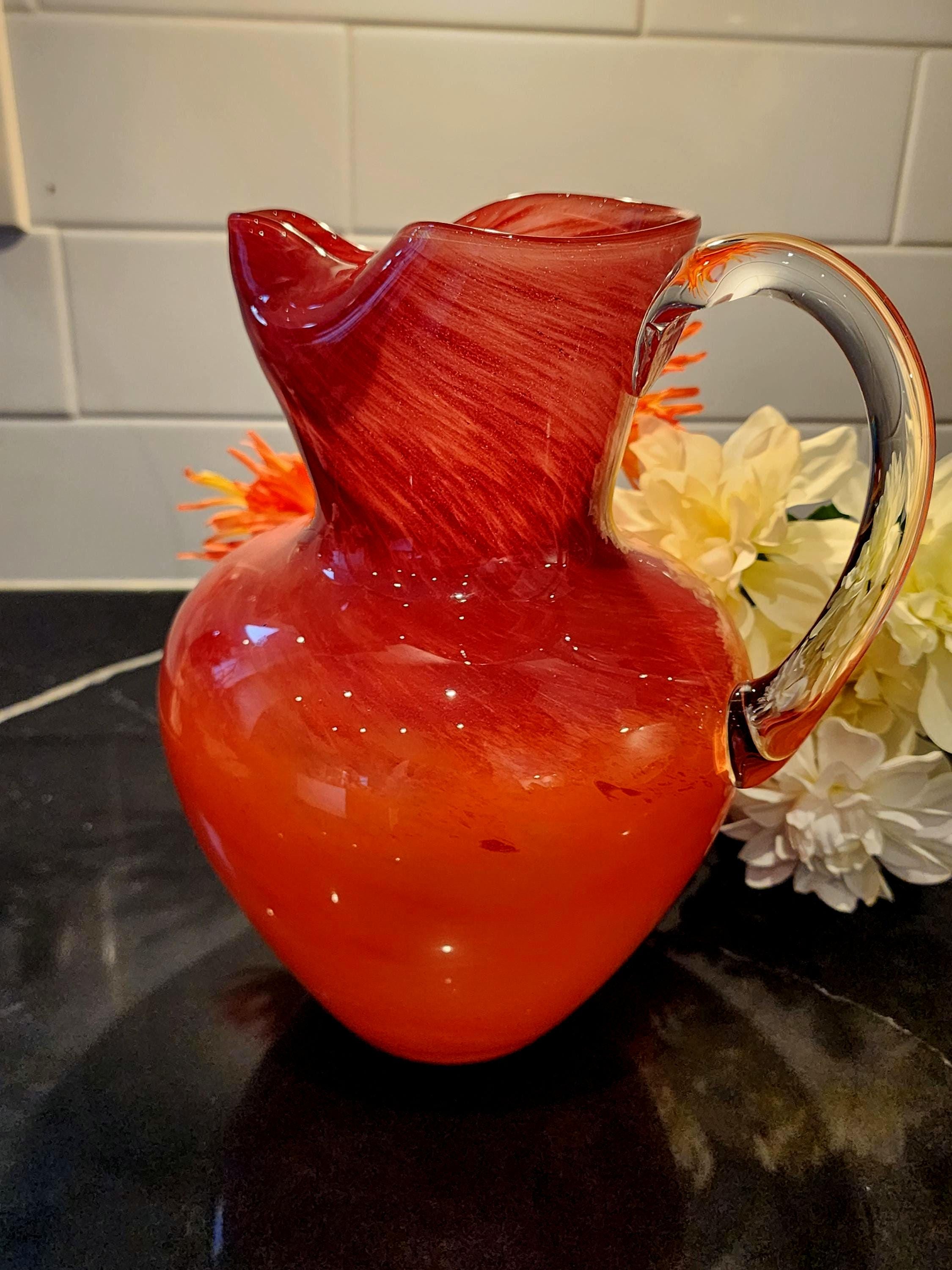 This bold and beautiful hand-blown art glass pitcher features rich swirls of fiery red and orange with a clear applied handle — a true statement piece that glows in the light.