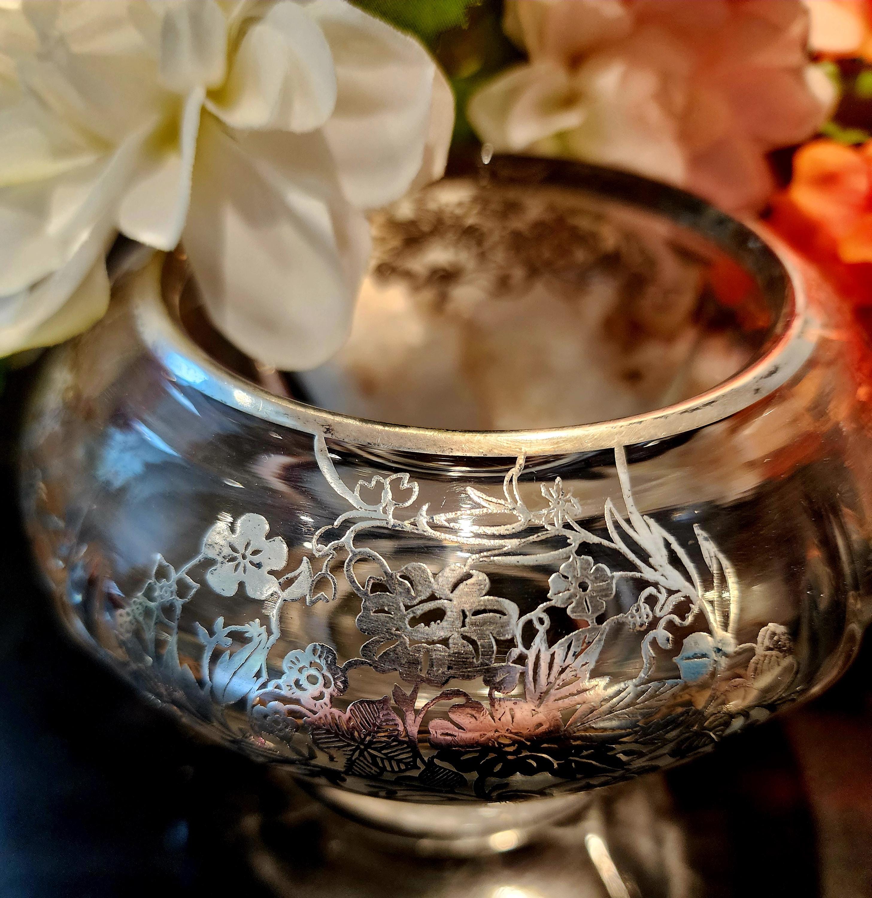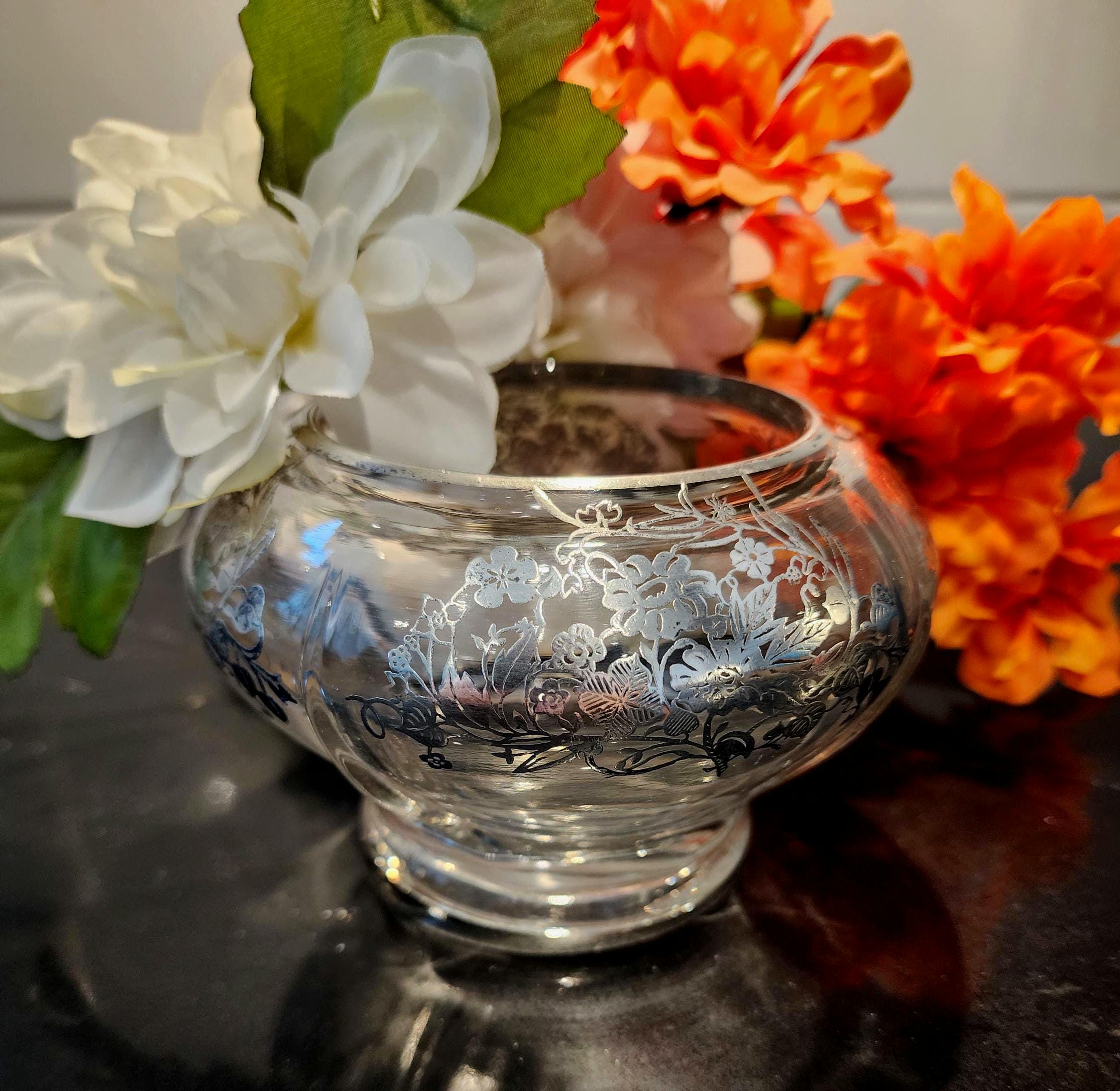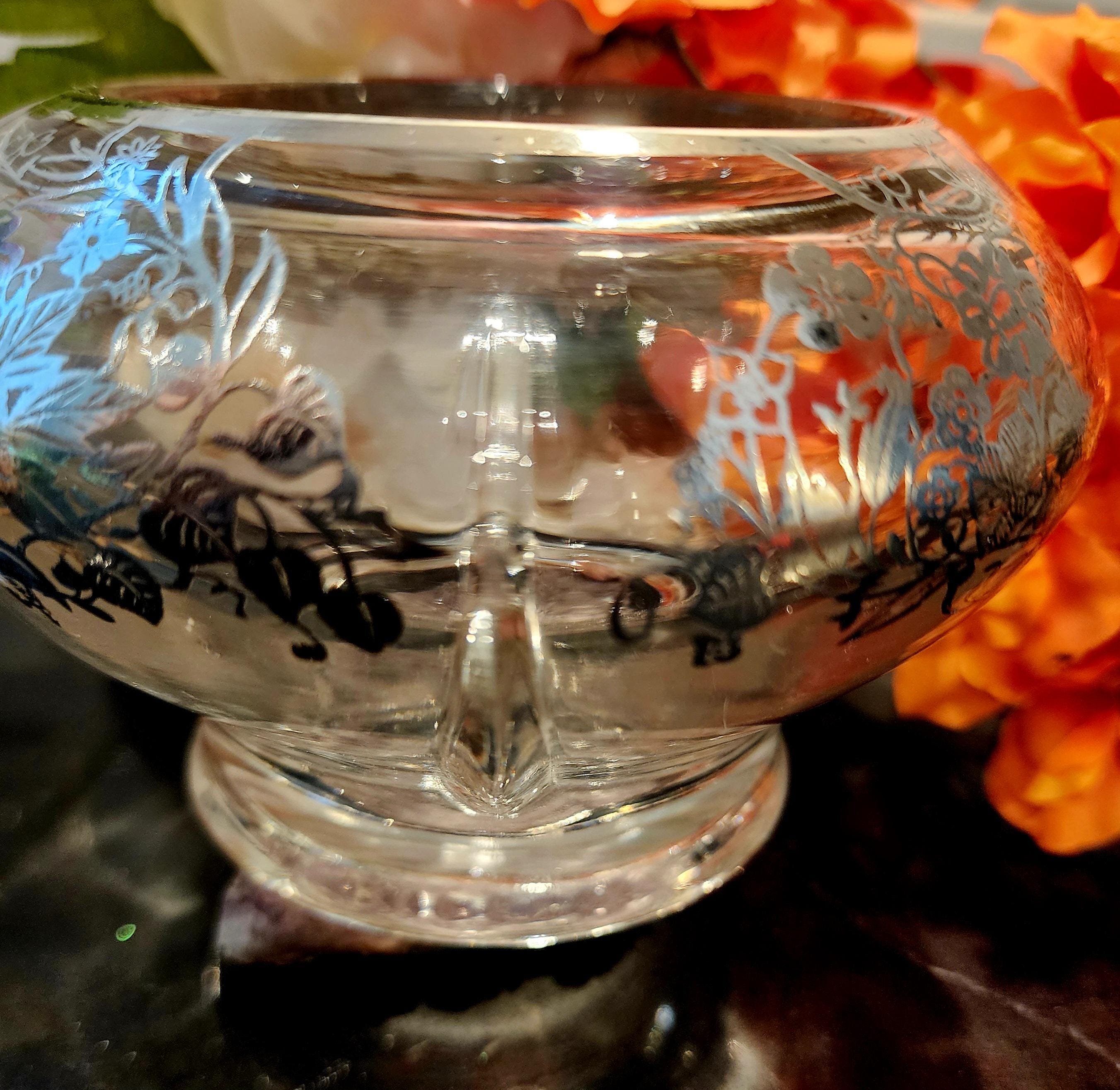 A stunning mid-century silver overlay crystal bowl with delicate hand-etched florals and a reflective silver rim that glows in natural light. This charming piece sits gracefully on a rounded pedestal base — simple, timeless, and full of sparkle.
