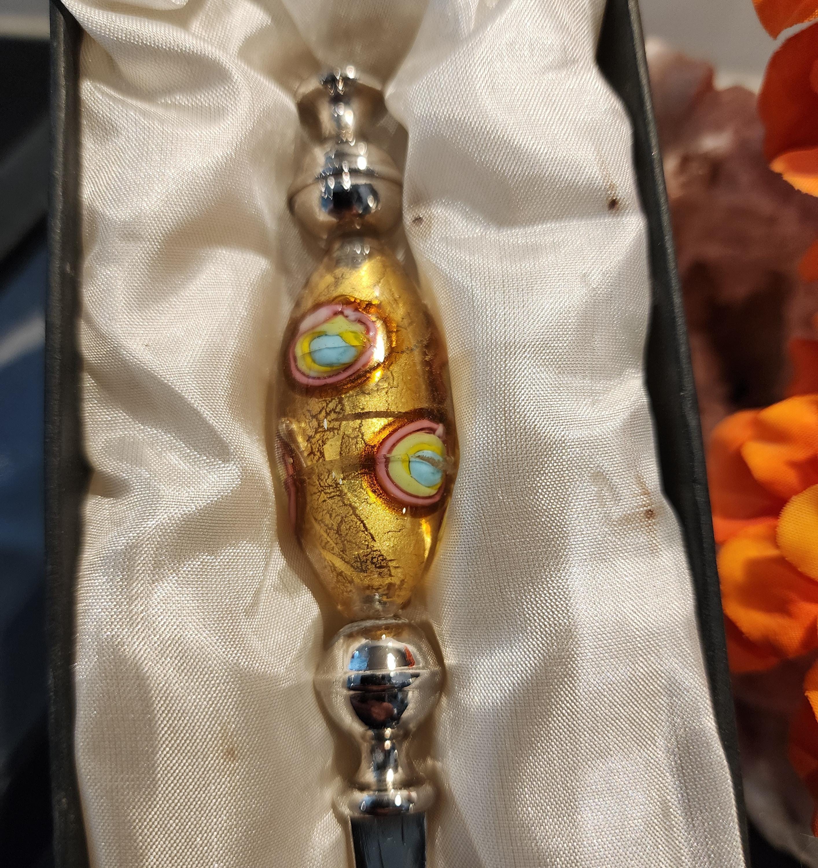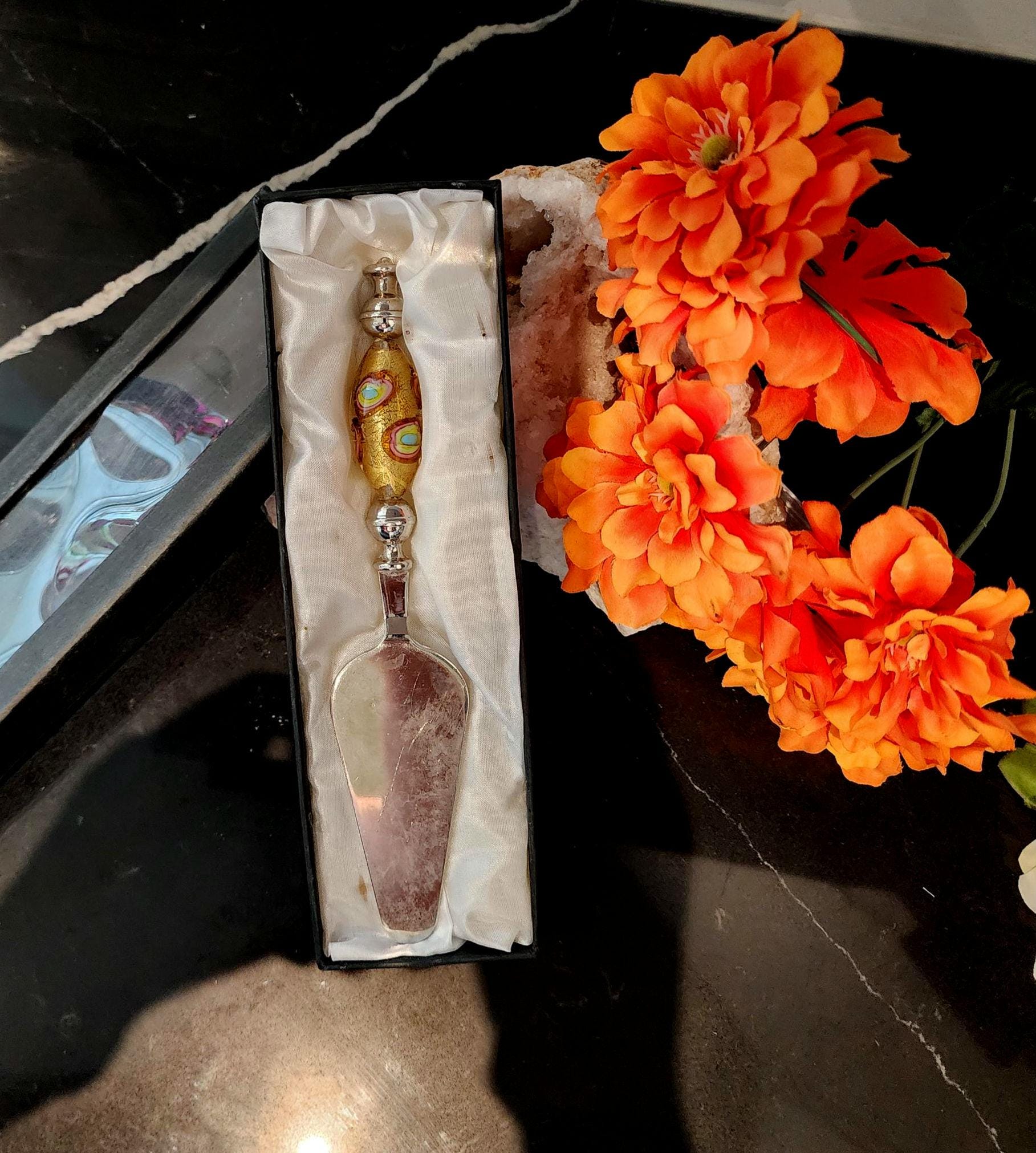 Beautiful vintage 1980s Murano-style cake server with a vibrant art glass handle featuring layers of gold foil and colorful millefiori floral accents. The handle catches the light beautifully and has that classic Italian glass look and feel.