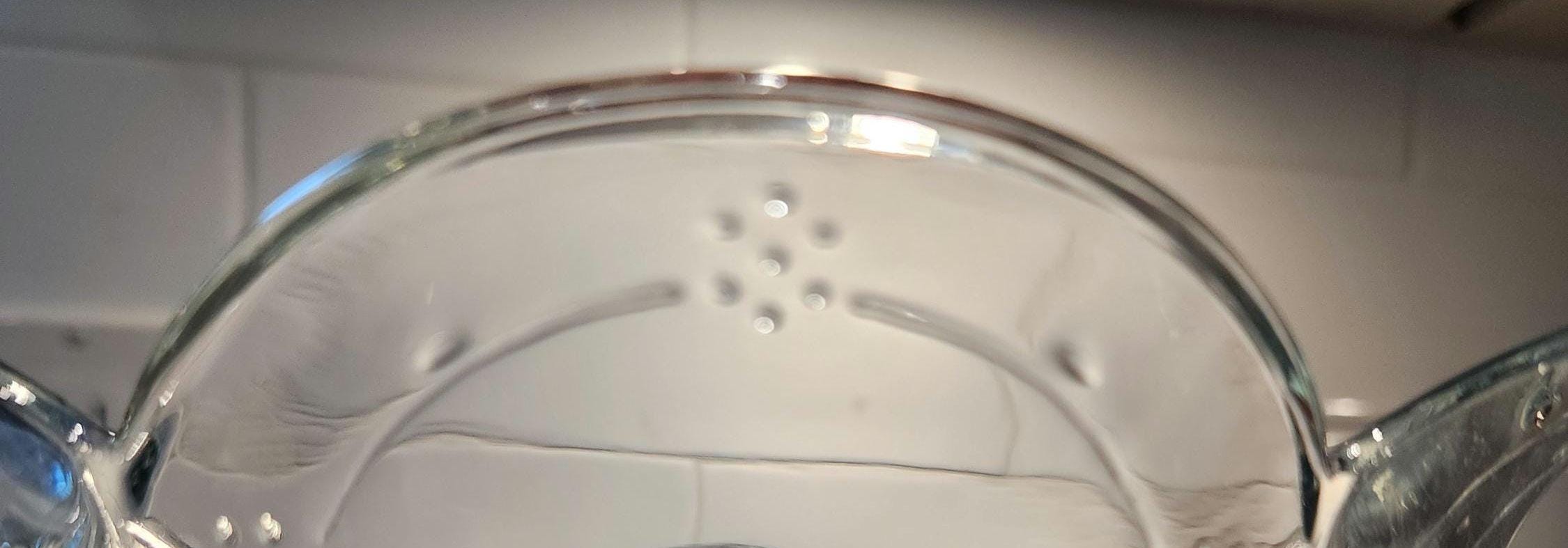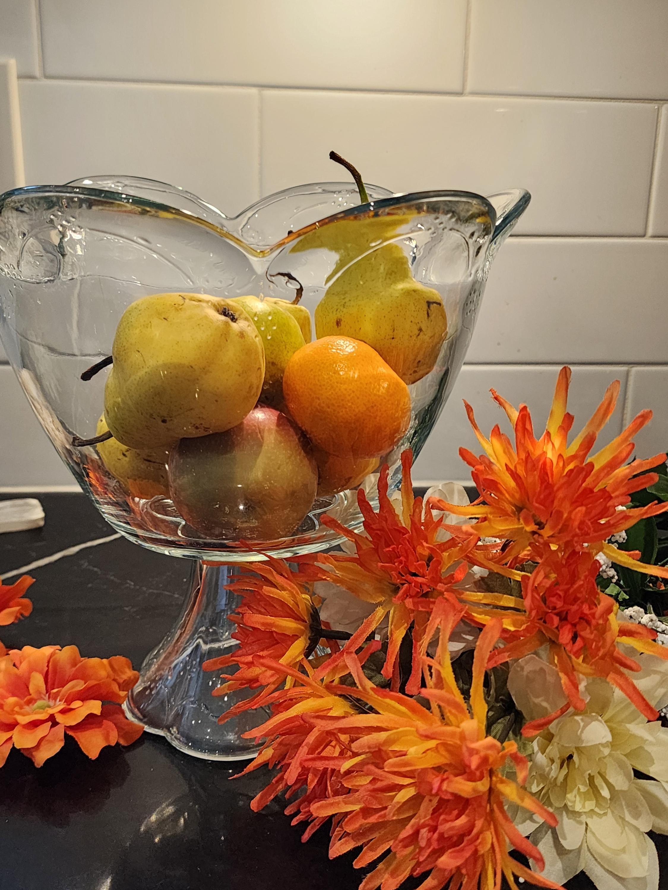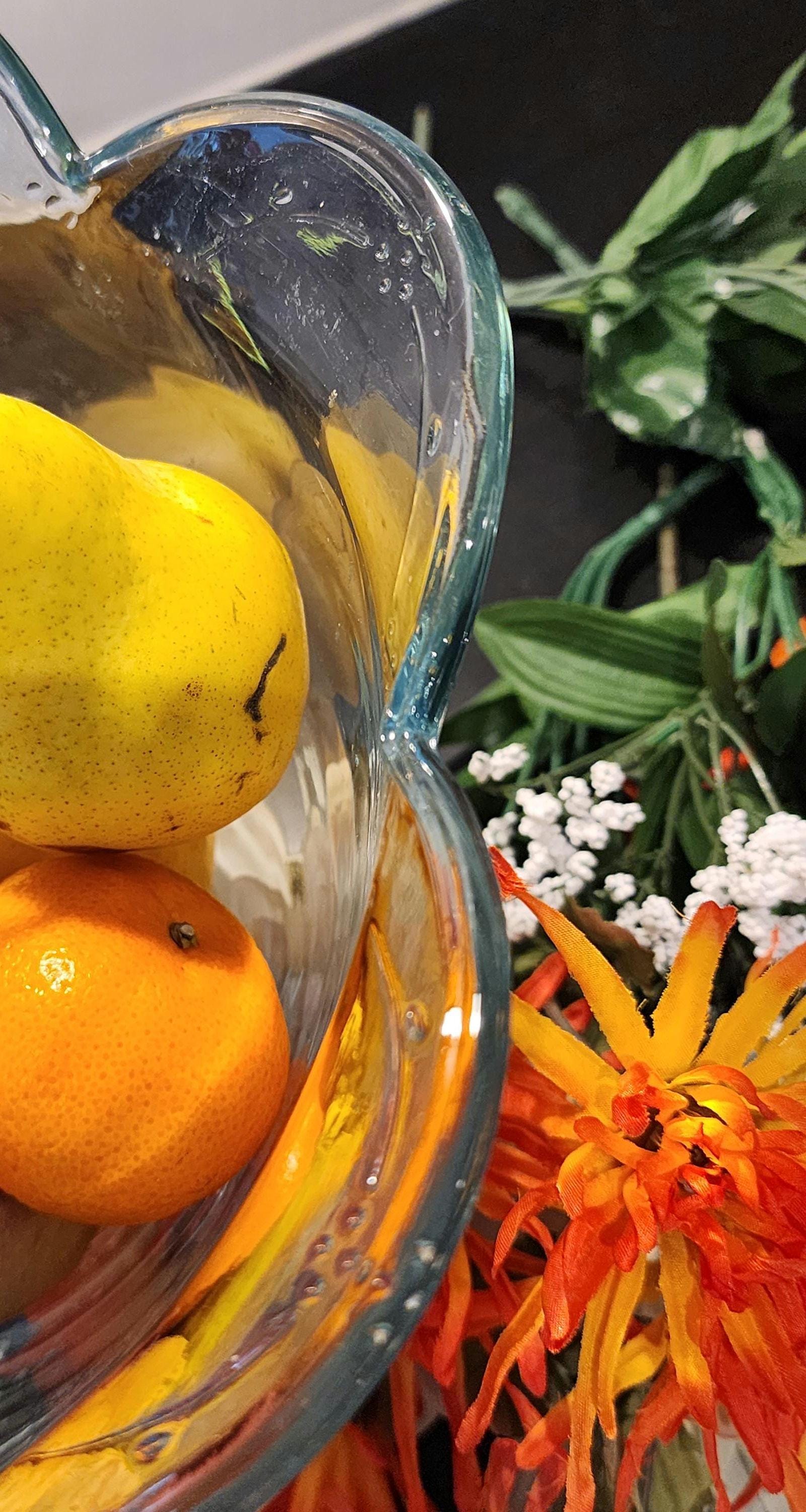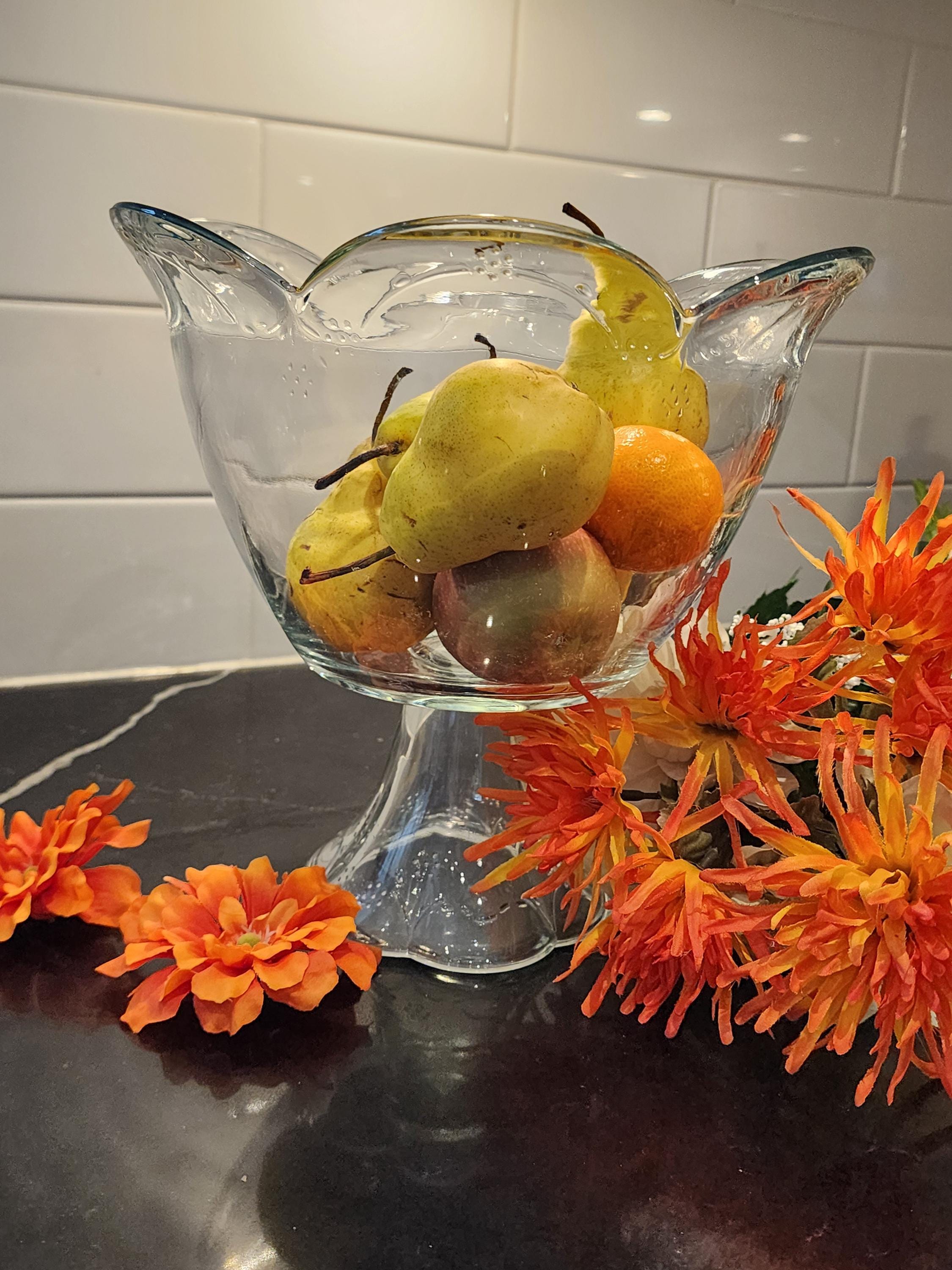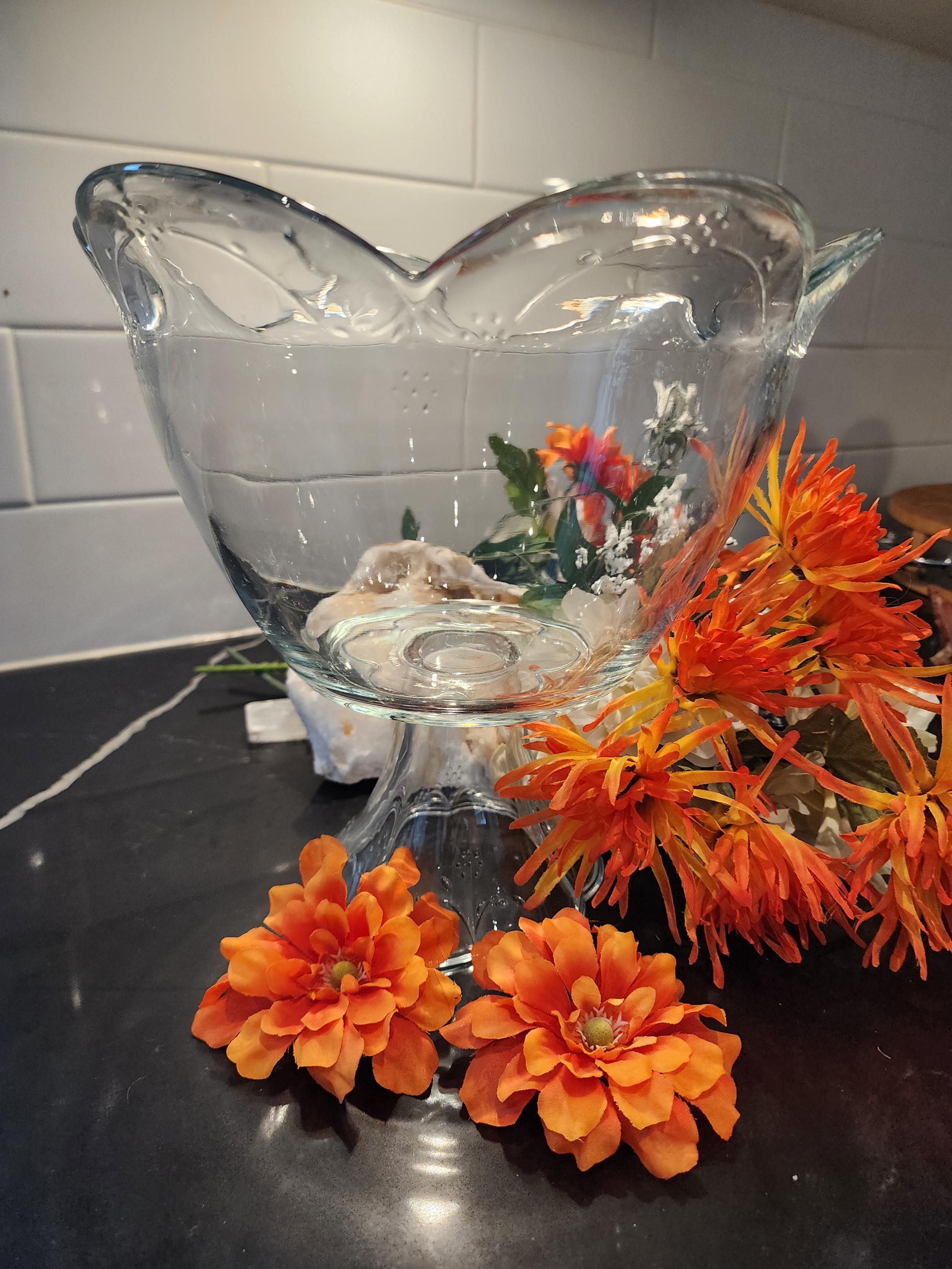 This large 9-inch-tall bowl features a beautiful scalloped rim and a graceful footed base, giving it the perfect mix of elegance and durability. It catches the light beautifully and makes a statement as a fruit bowl, trifle dish, or floral centerpiece.