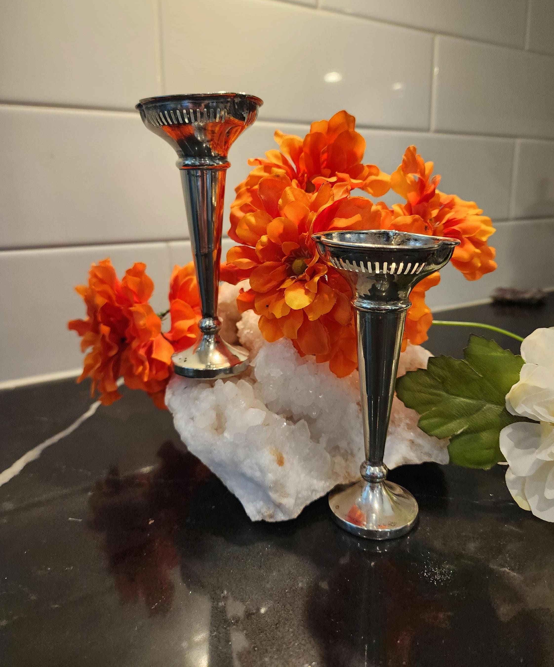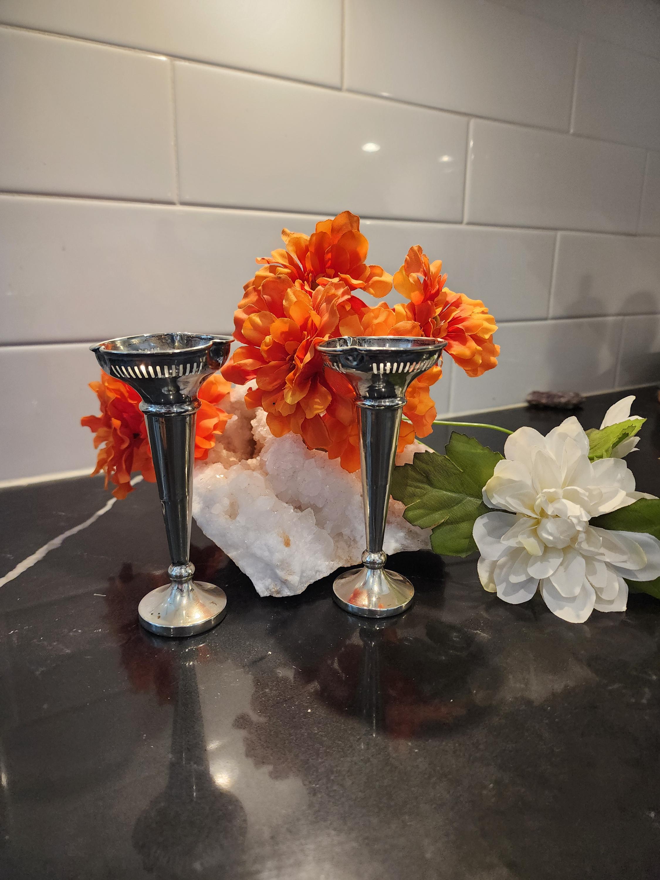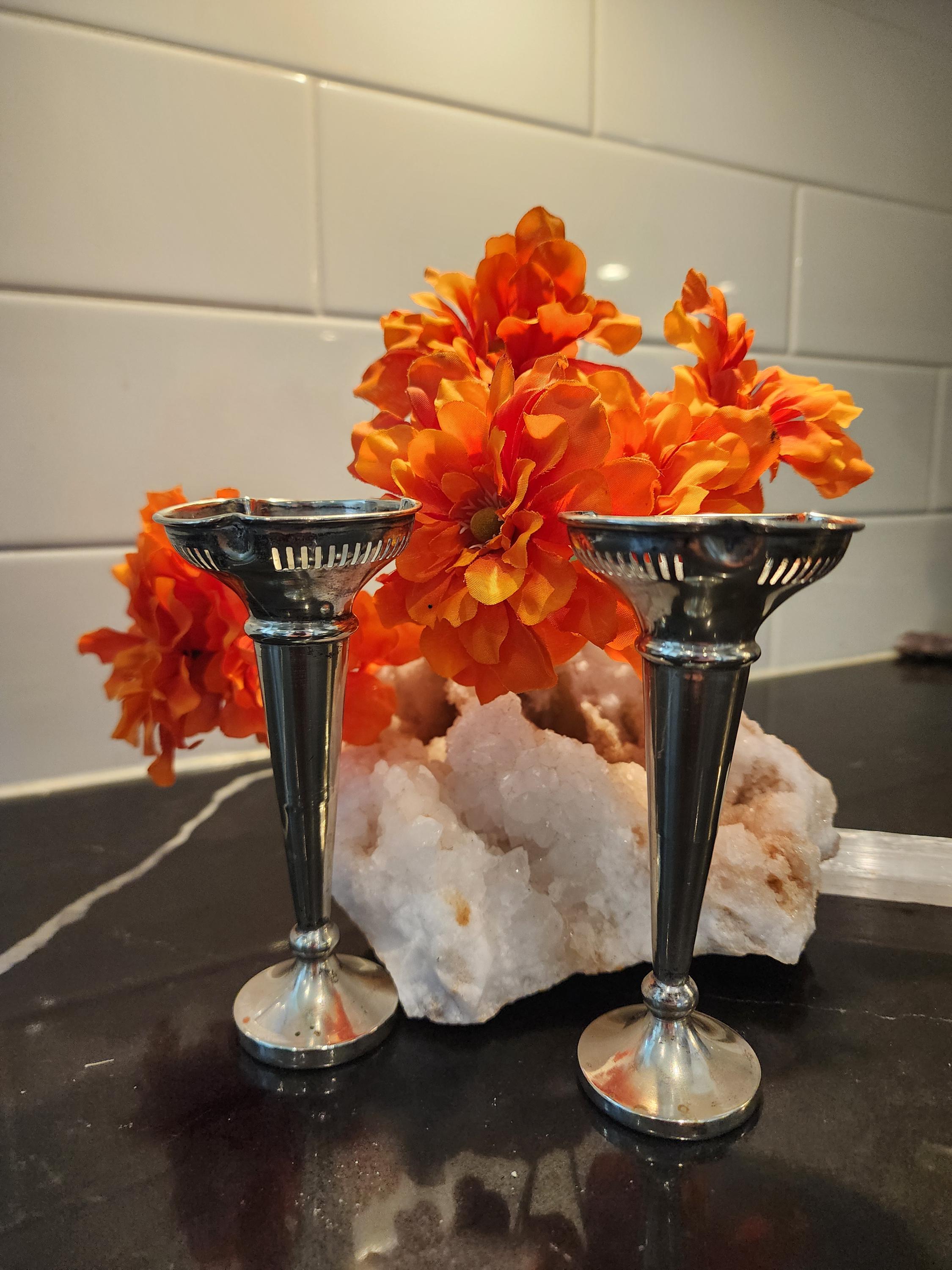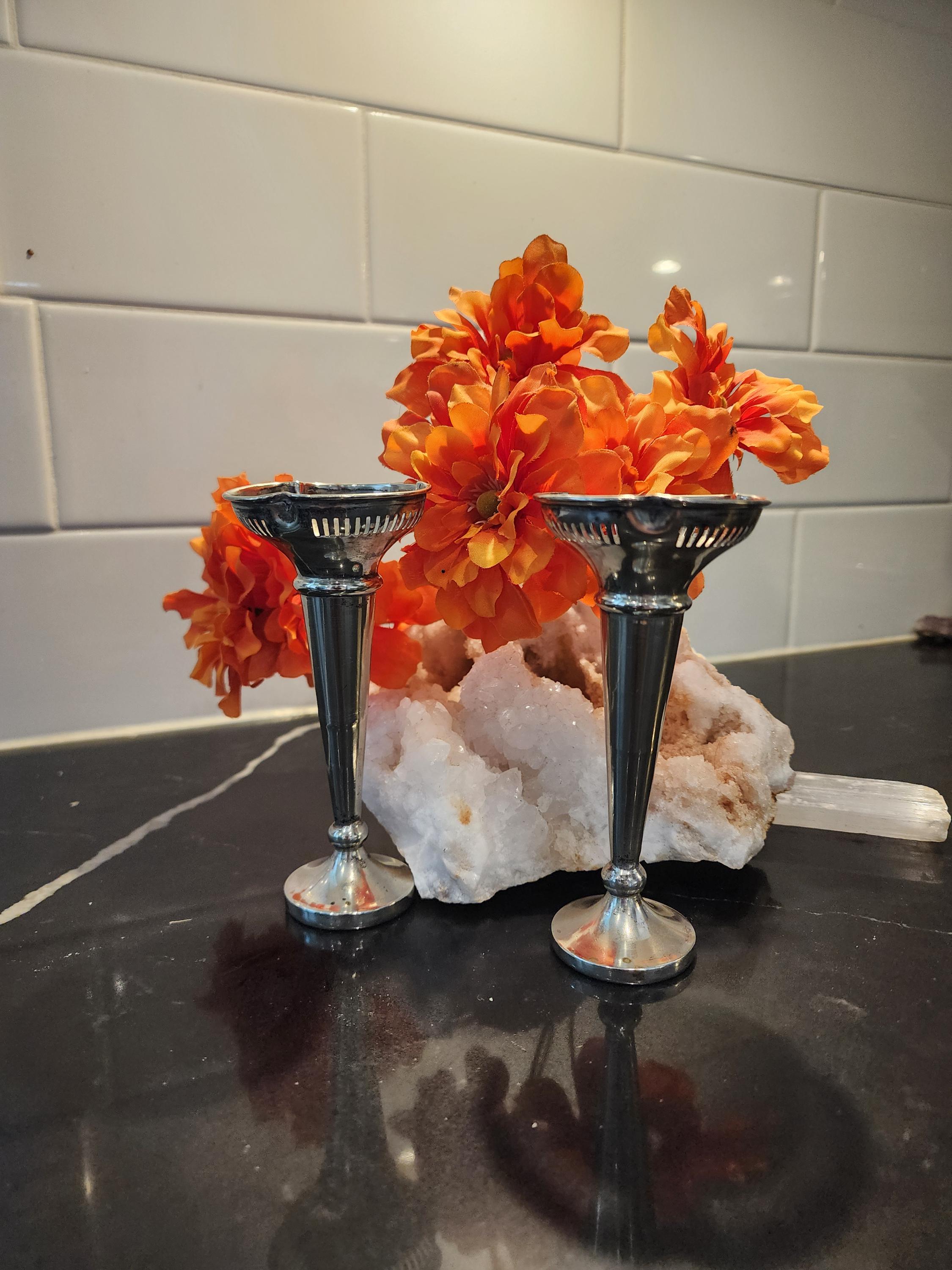 Add a touch of vintage English elegance to your home with this pair of small silver-plated bud vases, crafted in England and stamped EPNS A1 — the highest grade of silver plate.