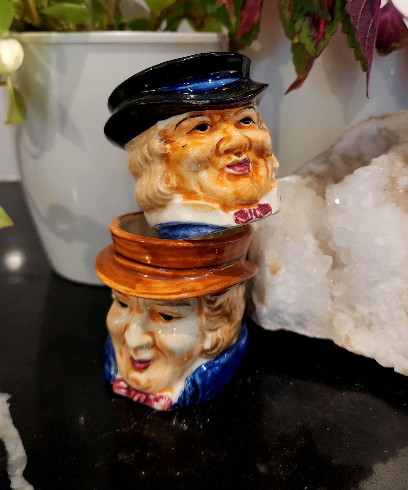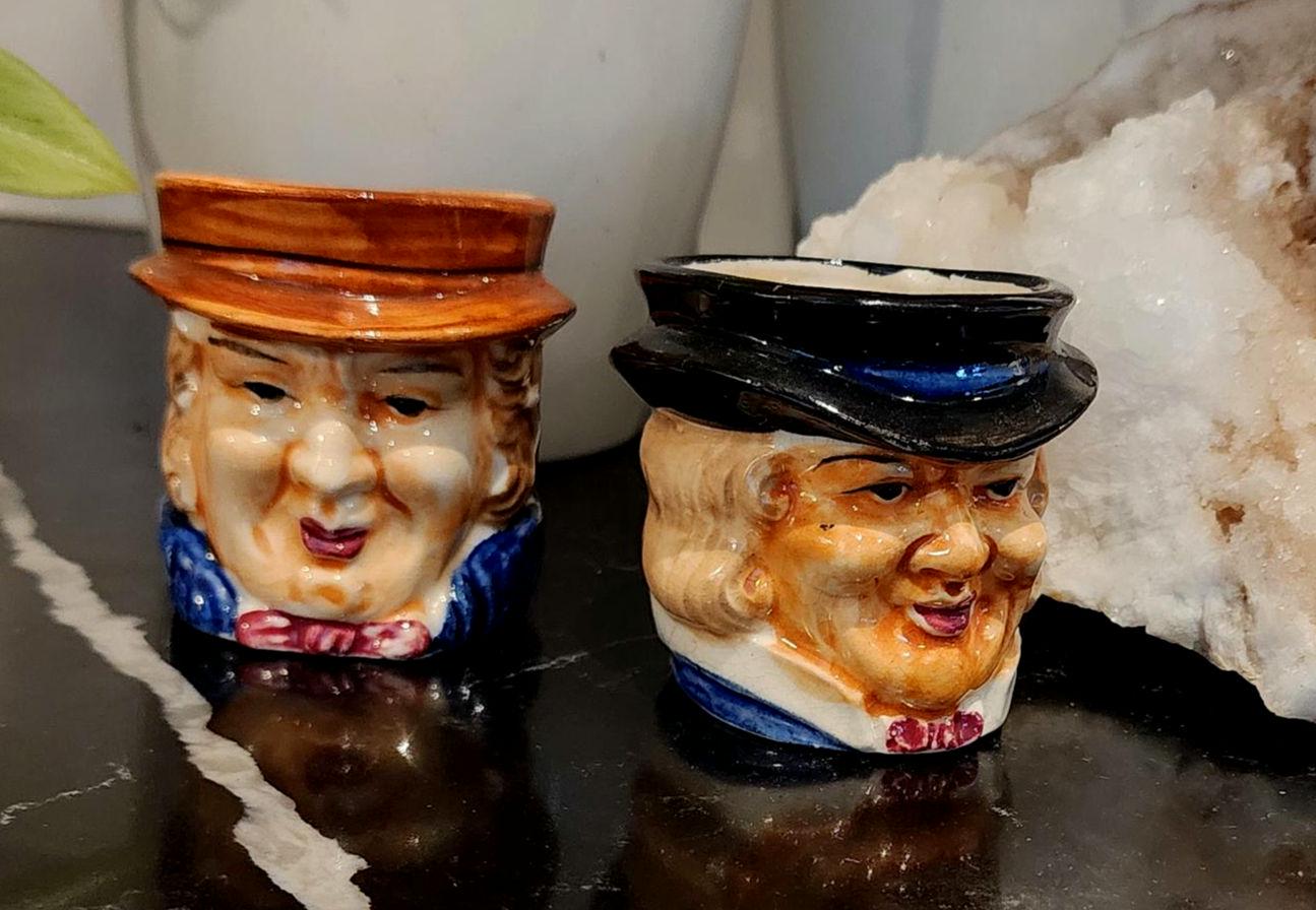 Bring a dash of old-world whimsy to your shelf with this pair of hand-painted mini Toby character mugs. Each tiny face jug is richly glazed with cheerful expression, colorful hat, and classic mid-century charm. Lovely as cabinet accents, bar cart curios, or gifts for character-jug fans.