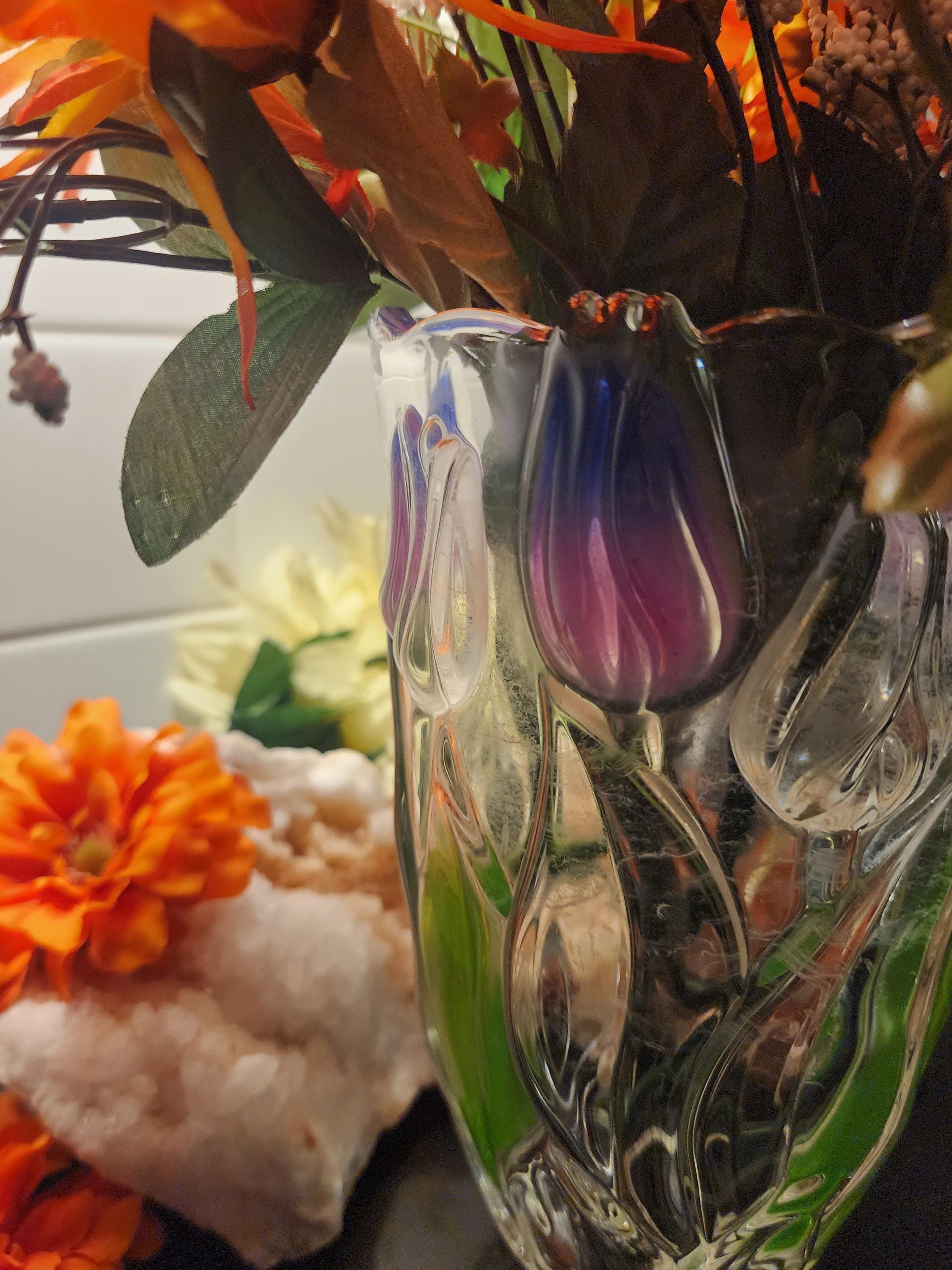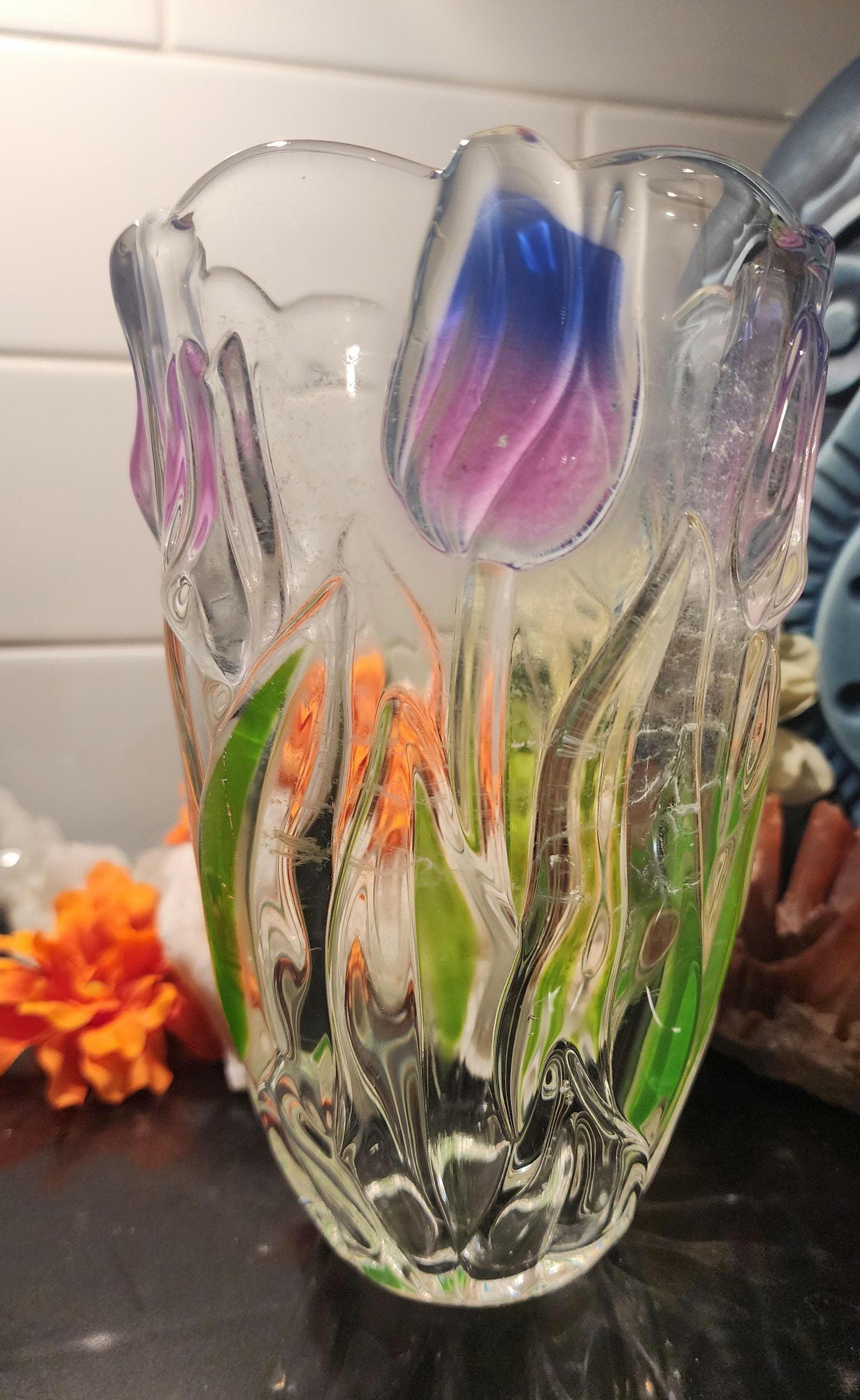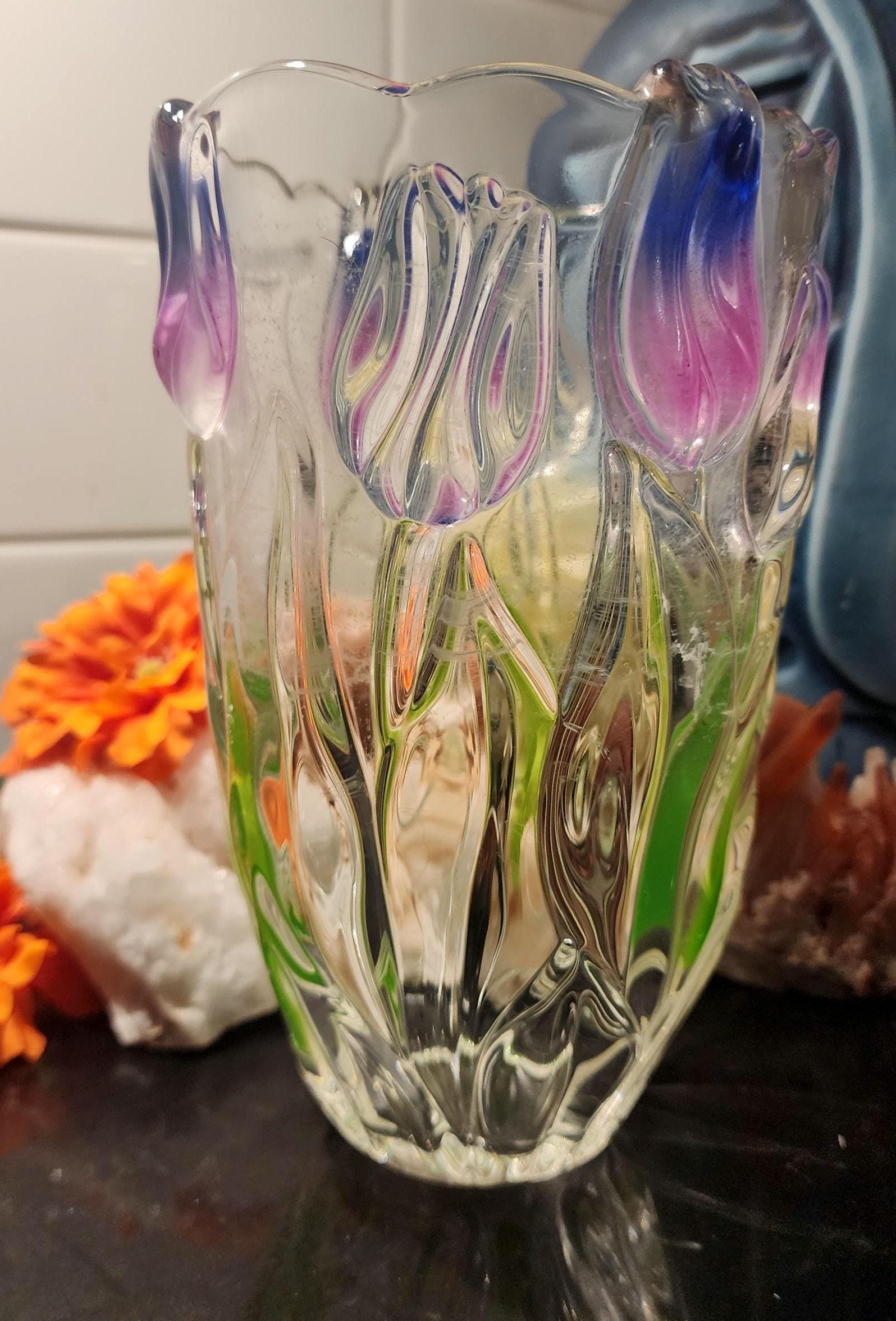 Vintage Walther Glas Crystal Vase – Pink & Purple Tulips with Green Leaves – German Art Glass