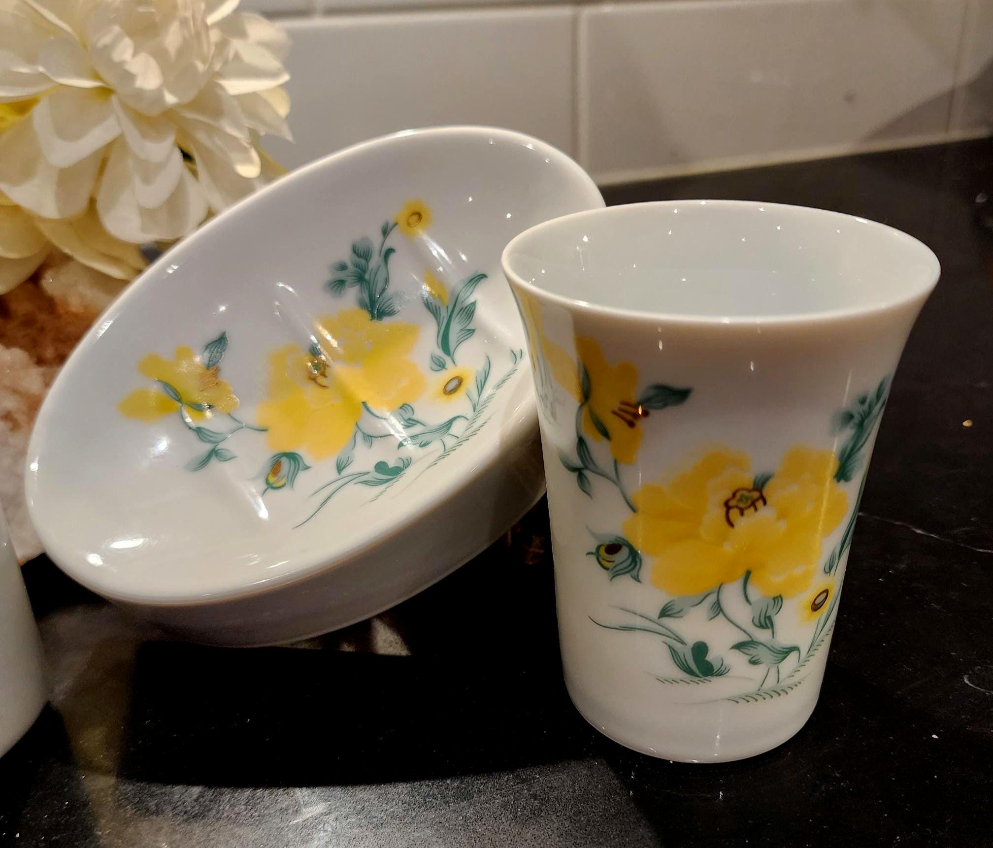 Bring cheerful mid-century charm to your bathroom with this vintage 1950s Japanese porcelain vanity set.