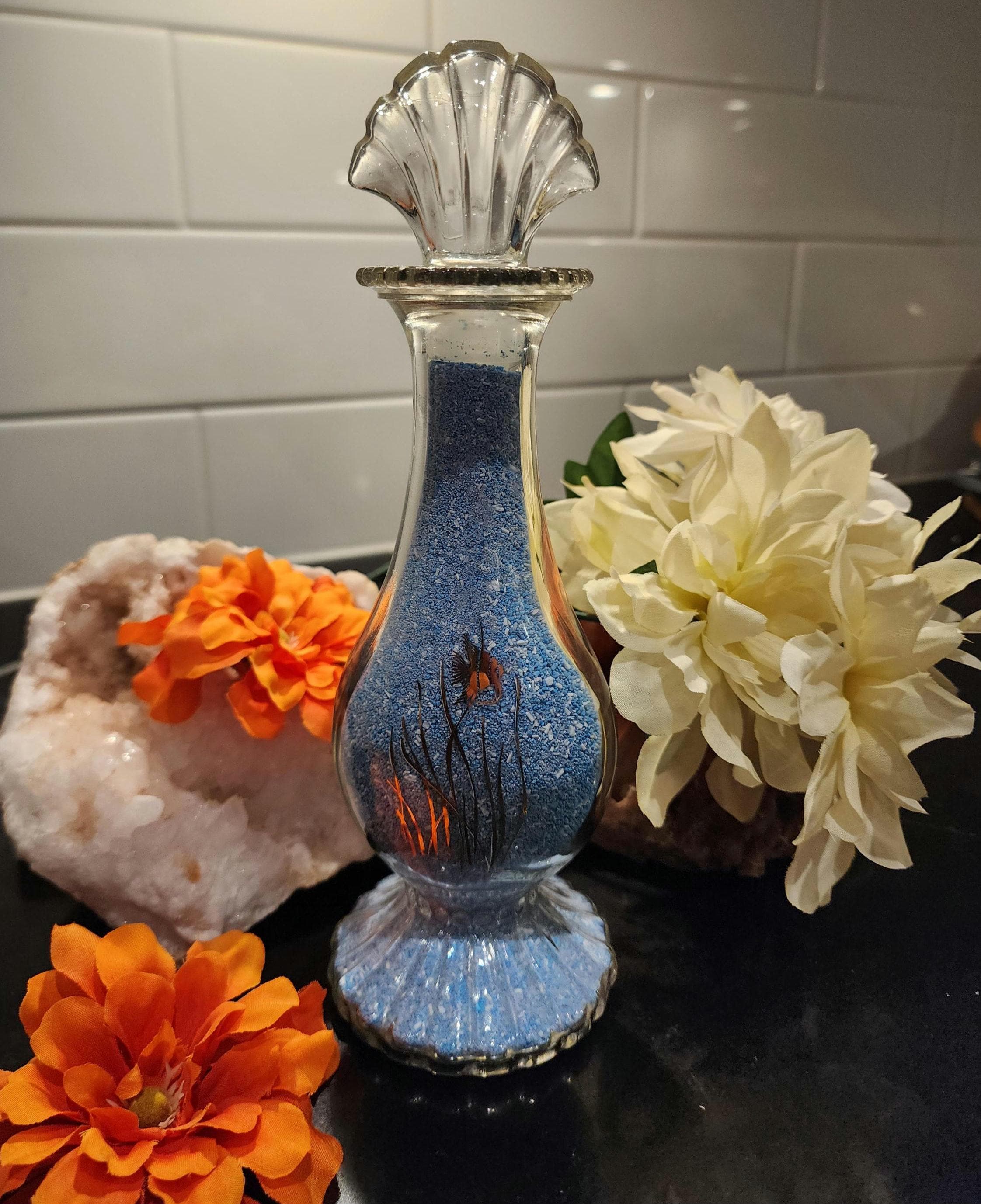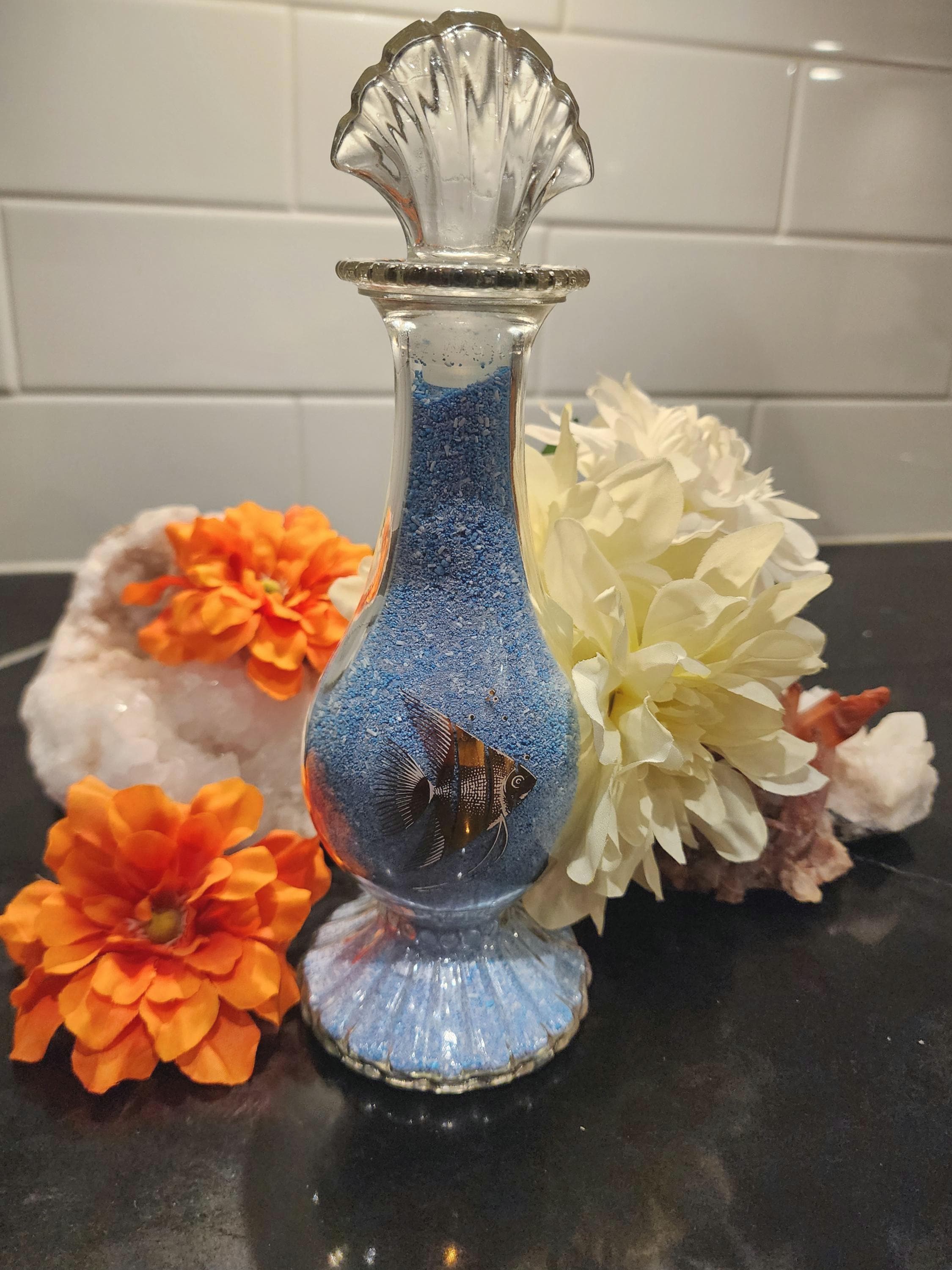 Originally filled with Avon’s Skin-So-Soft Light Bouquet Bath Oil, this stunning vanity collectible is still full and never opened, featuring an enchanting hand-painted tropical fish design and elegant blue glass with a scallop-shell stopper.